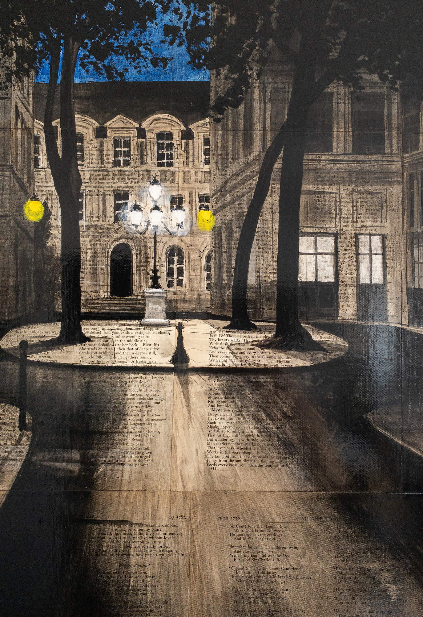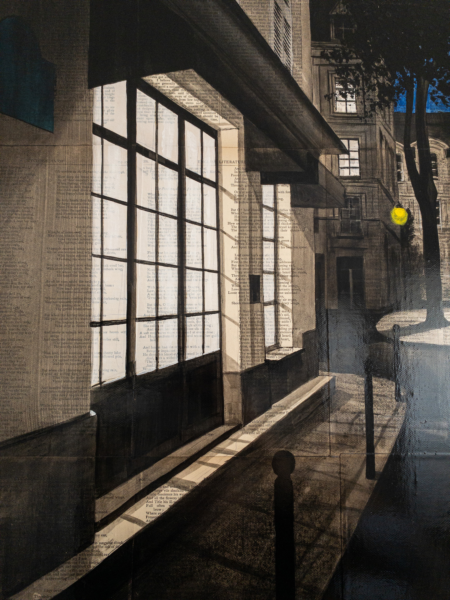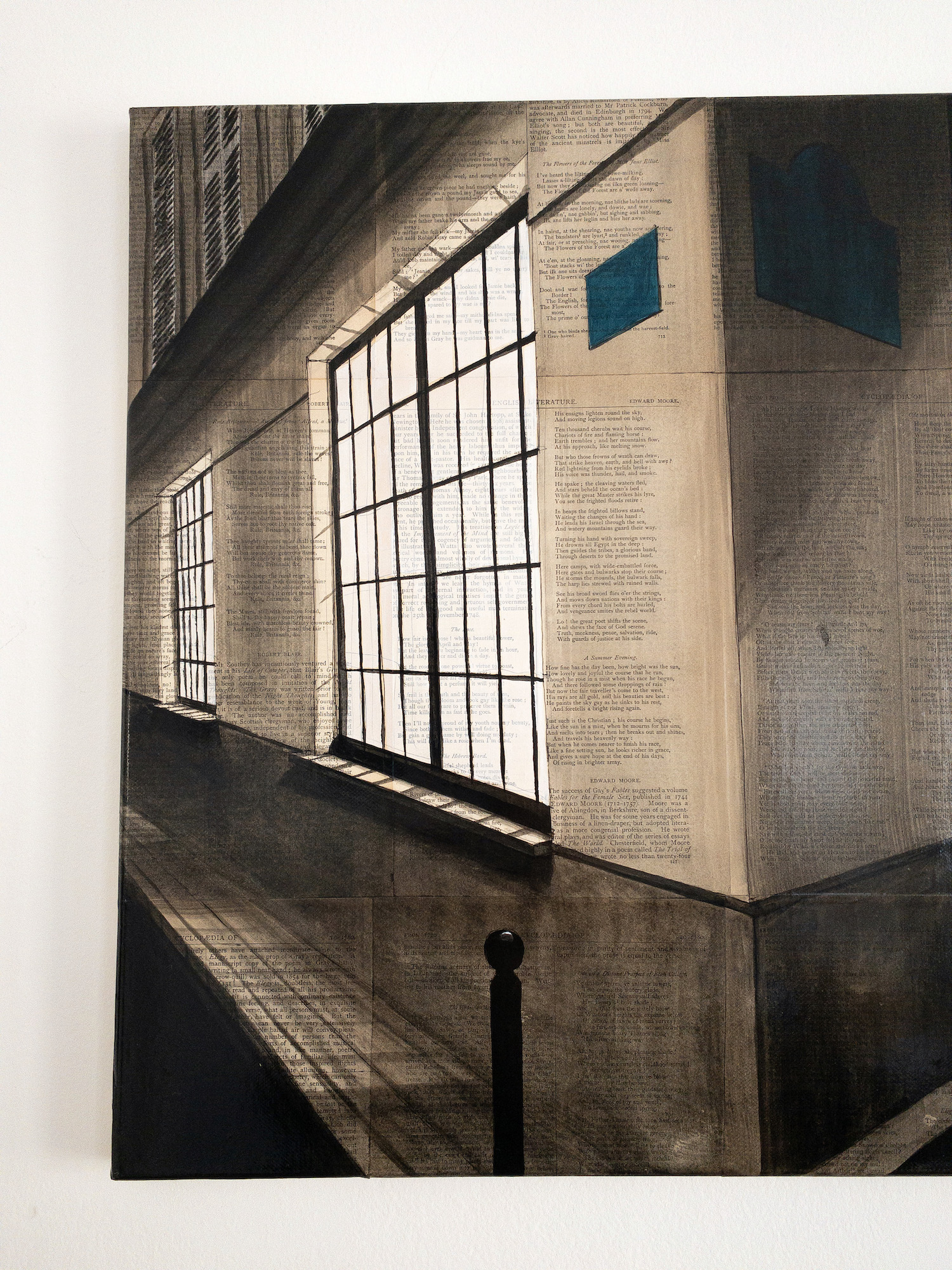 | Description | Ink and acrylic on old book pages mounted on canvas |
