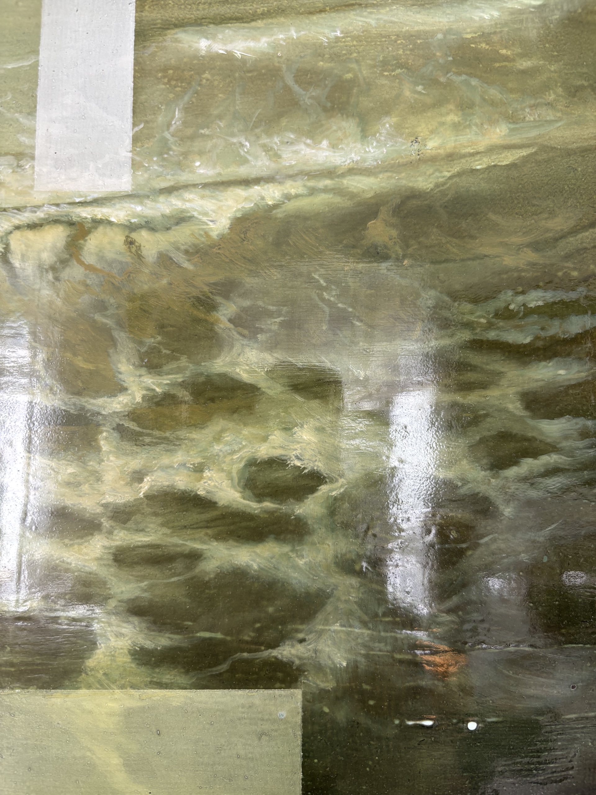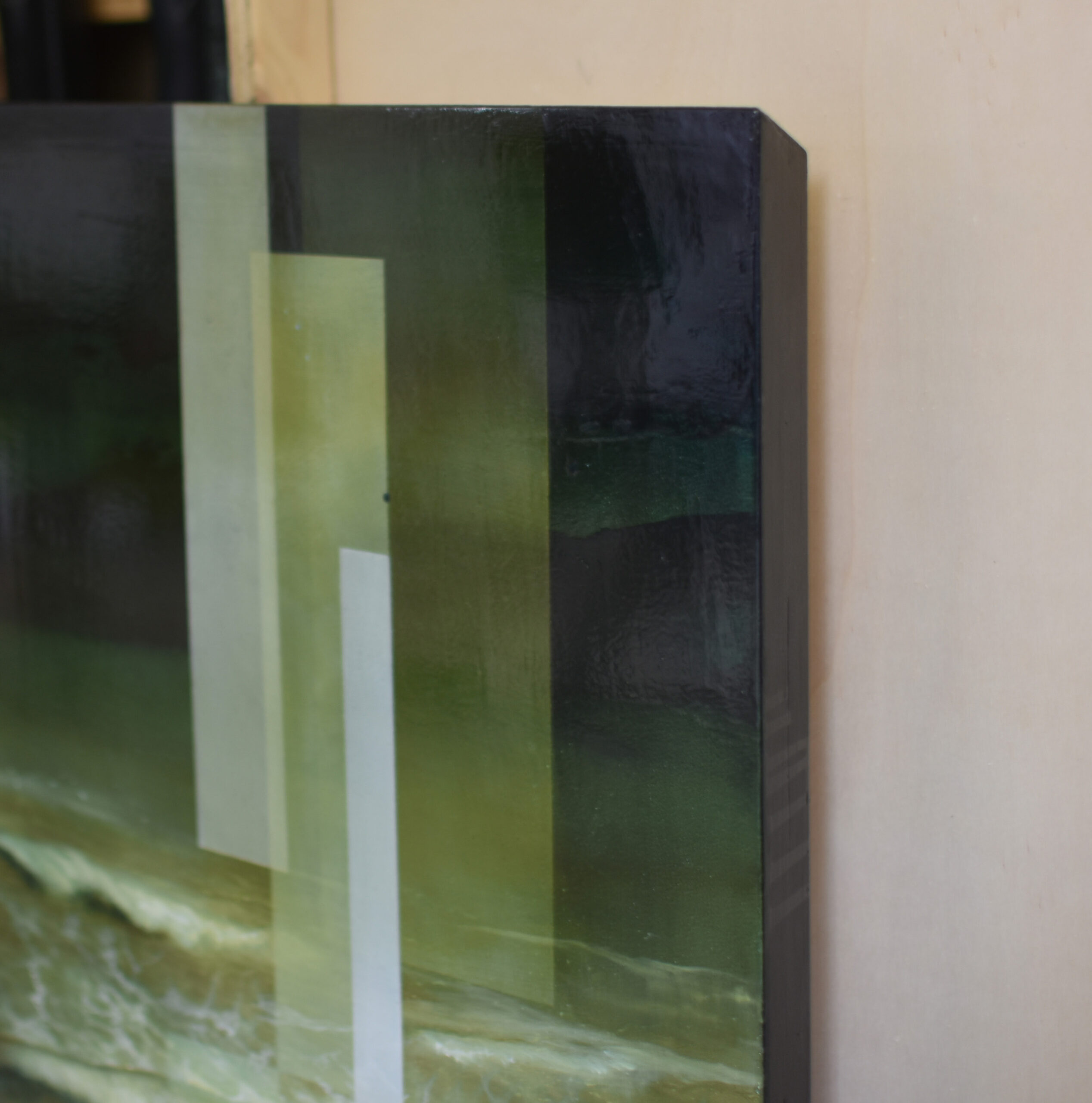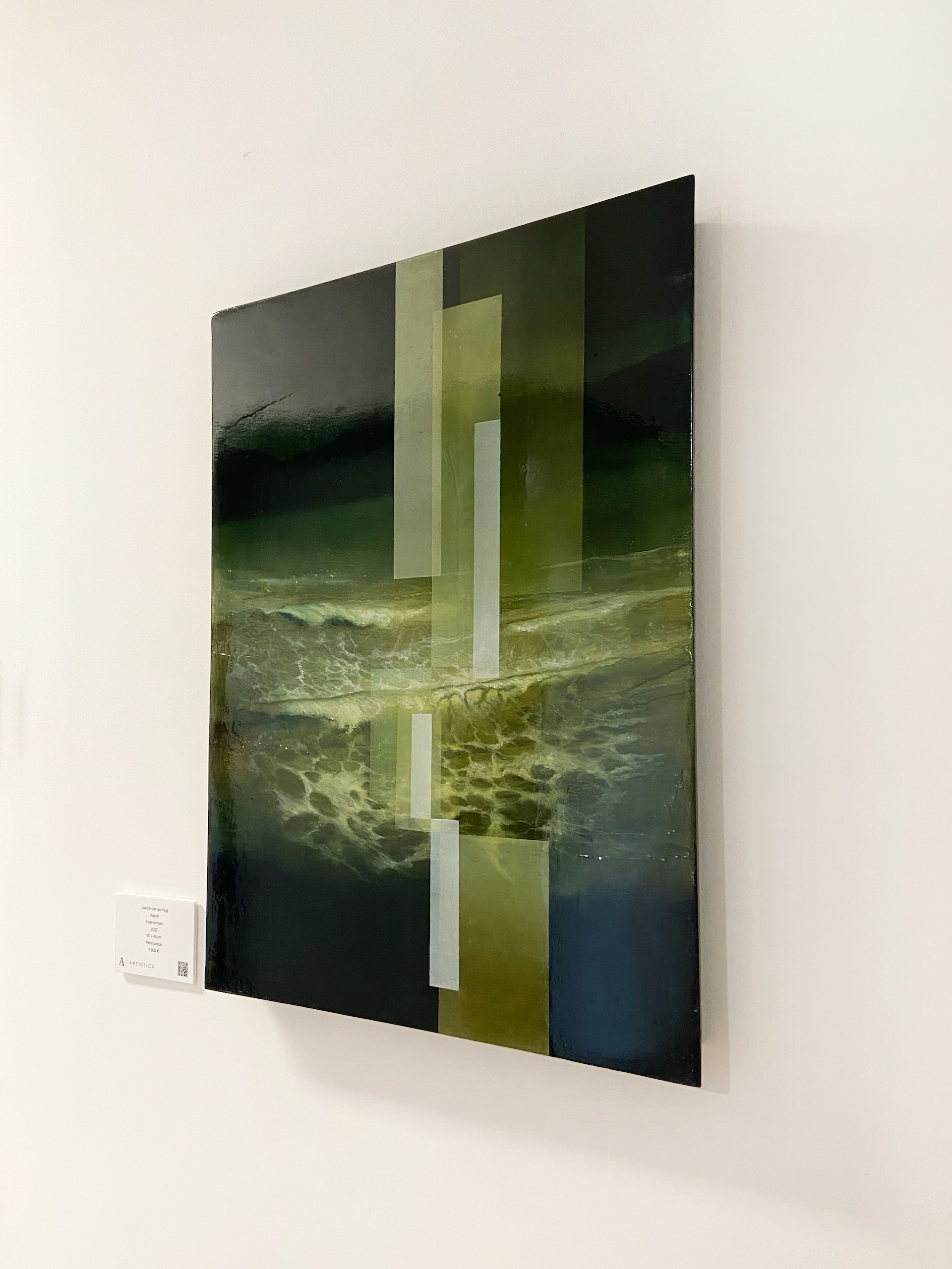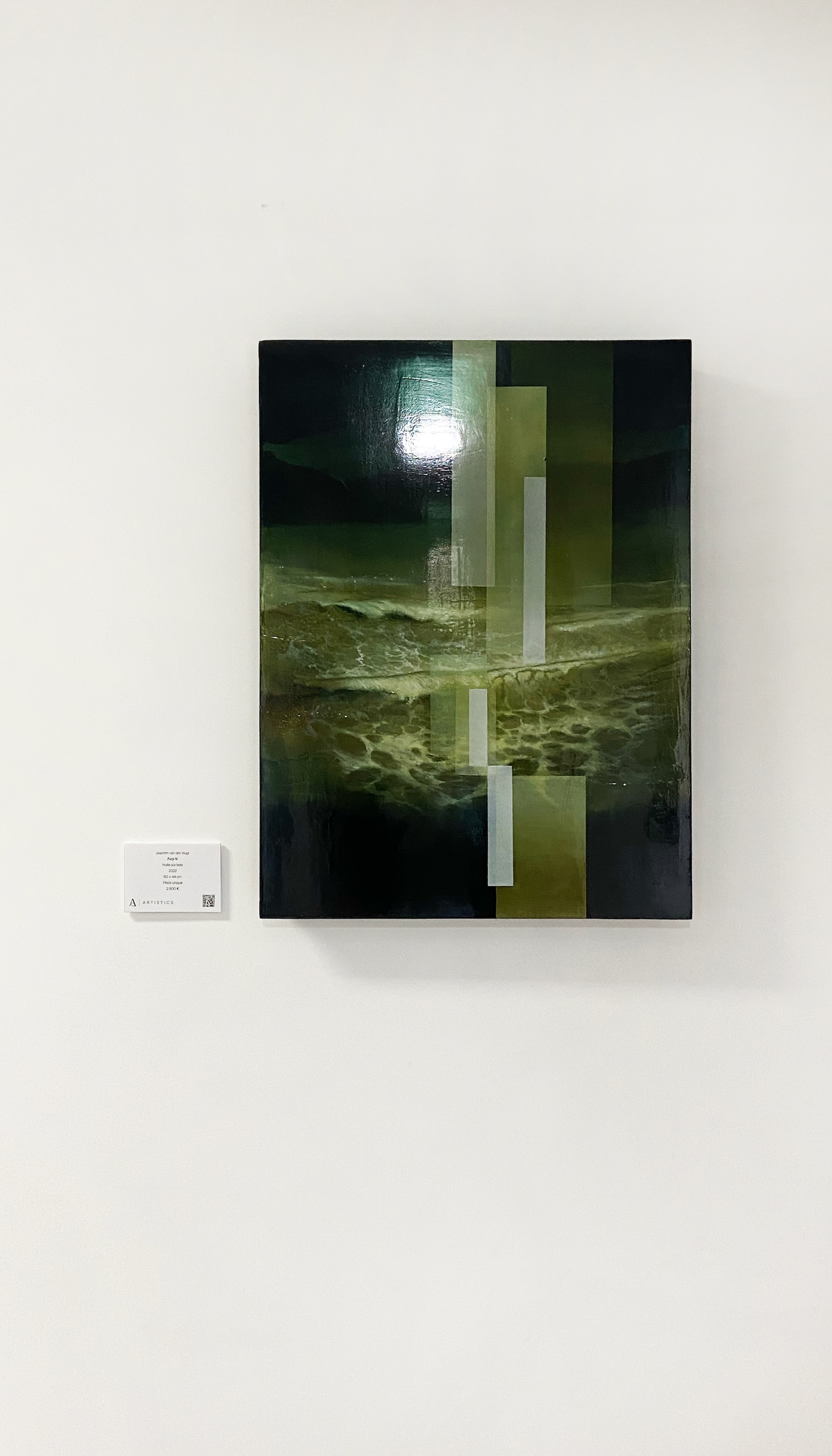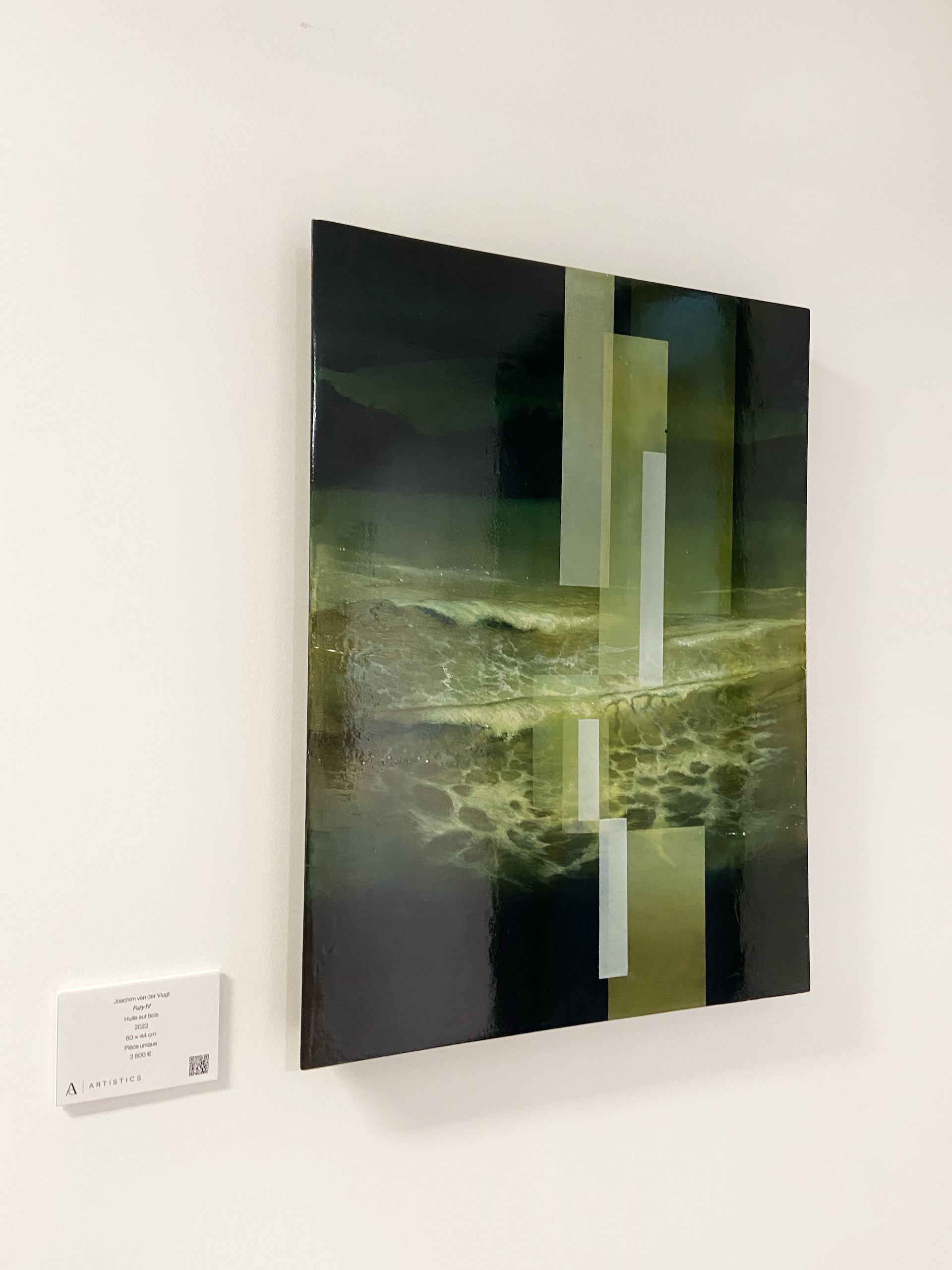 Between abstraction and figuration, Joachim Van der Vlugt’s artworks are created through an amazing work on the light. Whereas the painted subjects let the spectator free to identify a dreamlike world, the artist’s work on the light structures the painting and creates the peculiar and fascinating feeling of reality. The geometric forms which superimpose in the foreground, like clues of an altered reality, incarnate the tacit agreement of a pictorial illusion that the artist is sharing with the spectator. Here, dark and light colors combine and create a landscape recalling the waves of the sea.