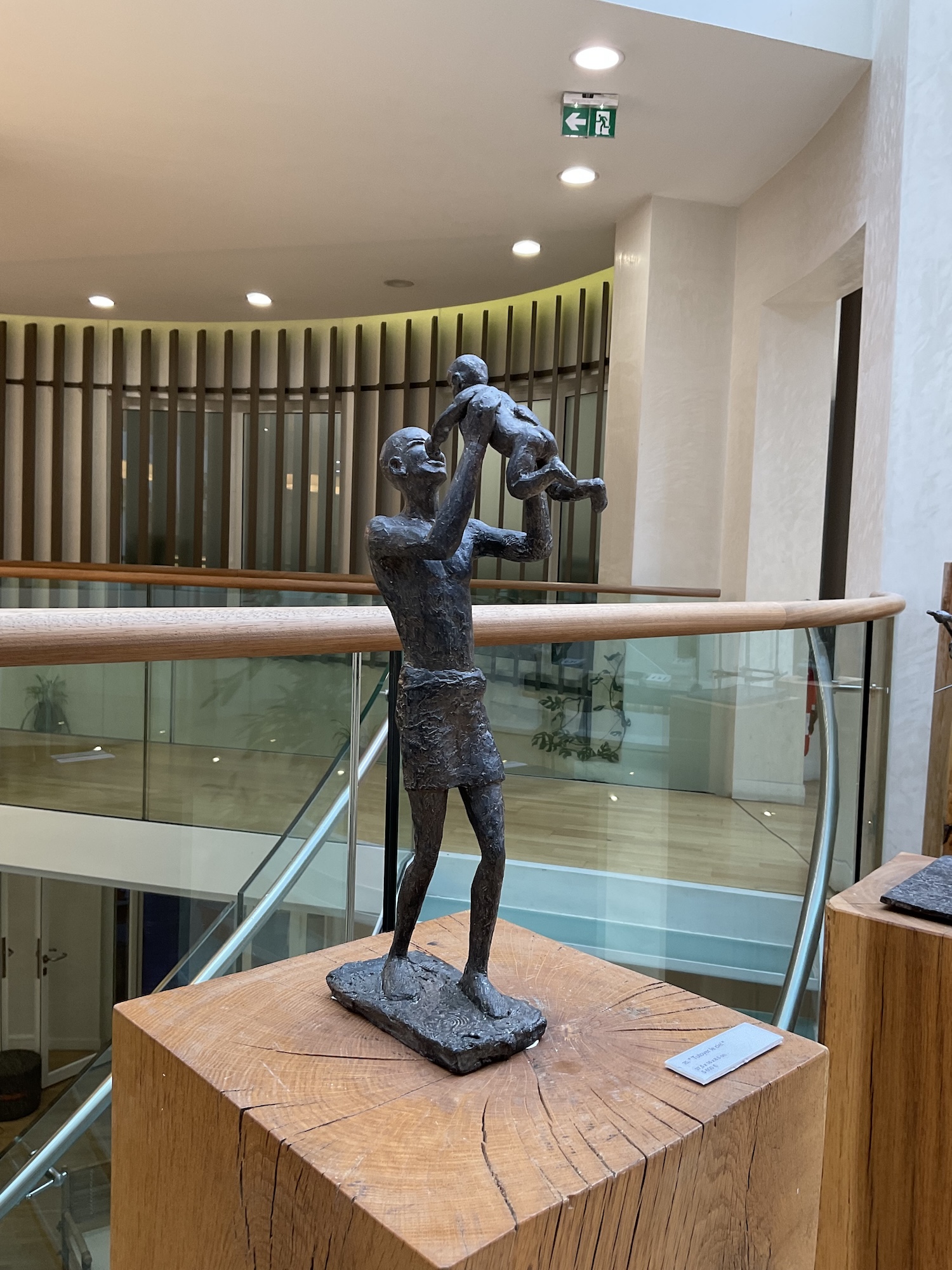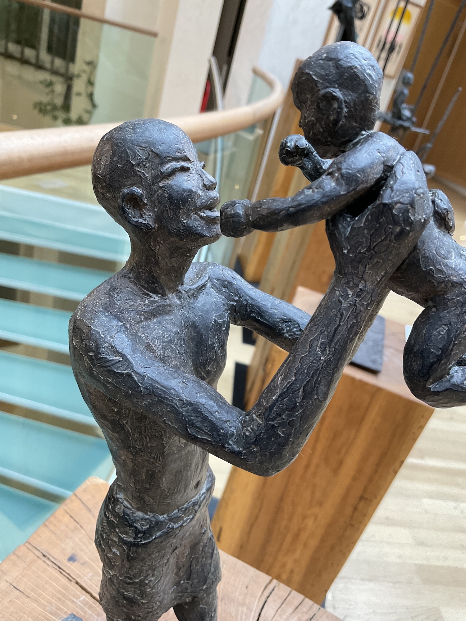 Getting close to the sky (Tutoyer le ciel), is an artwork by French contemporary sculptor Marine de Soos. This bronze sculpture is from the “Figure” series. This figurative artwork represents a young man, standing, dressed only in a loin-cloth. He is carrying with his arms a child and he is lifting him towards the sky. The artist gets her inspiration from real or imaginary scenes.