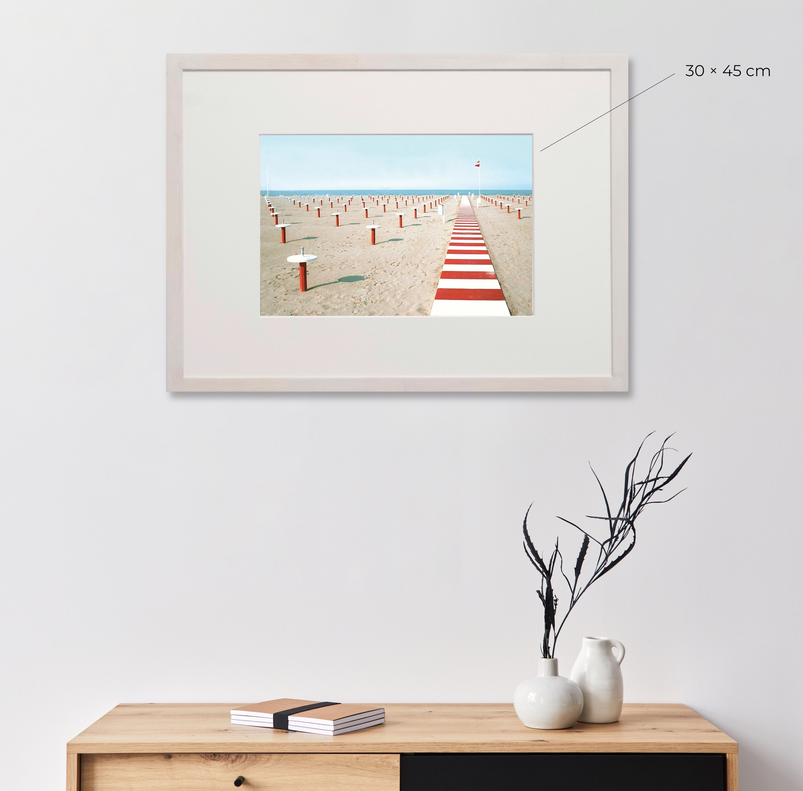 In the Silenzi Marine (Seascape Silences) and Geometrie Marine (Seascape Geometries) series, the artist immortalises beaches and seaside resorts when visitors are rare, when the landscape once again becomes the main protagonist. In contrast to his winter series, where white dominates, here colours such as beige, azure and red appear delicately.