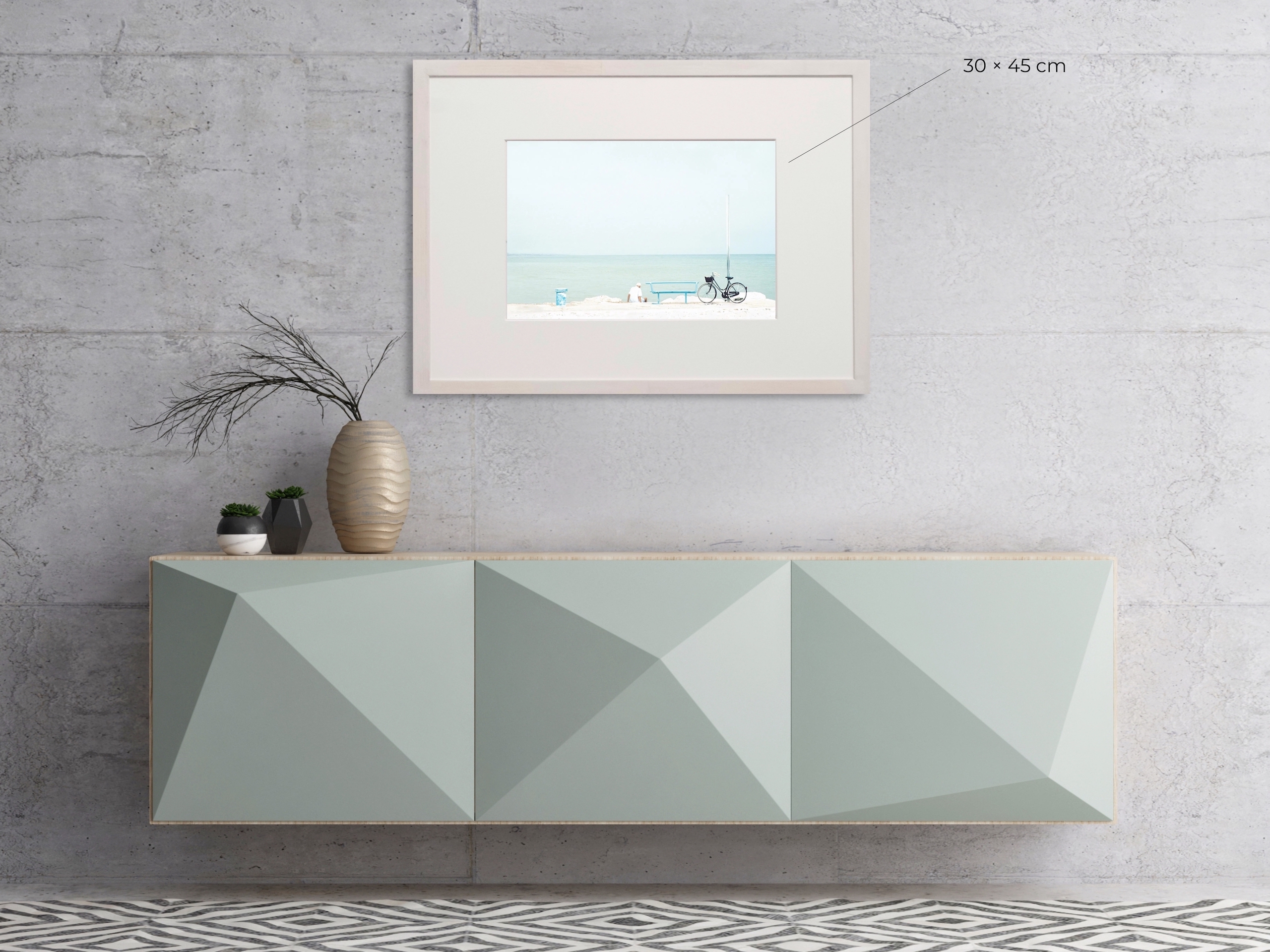 The artist uses overexposure when shooting to achieve a restrained language of clear, luminous tones, in which only the essential is visible. The simplicity of lines, shapes and colors is combined with careful, long-studied composition. The photographs are personally printed by the artist on textured cotton paper, which gives the image a velvety matte effect that is visually similar to watercolor.