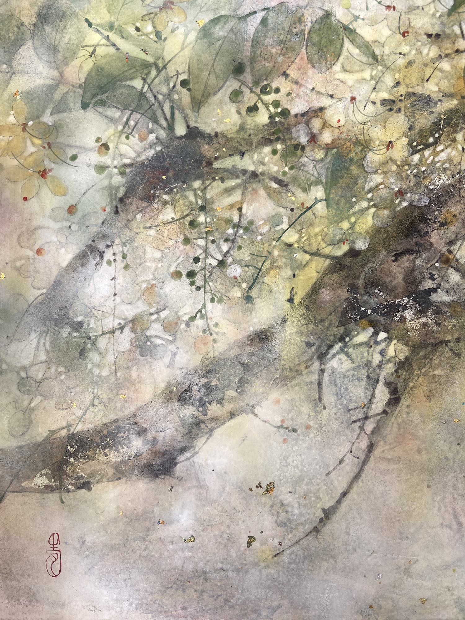 Golden Rain is a painting created by the contemporary Taiwanese artist Chen Yiching using mineral pigments, gold and silver leaf.