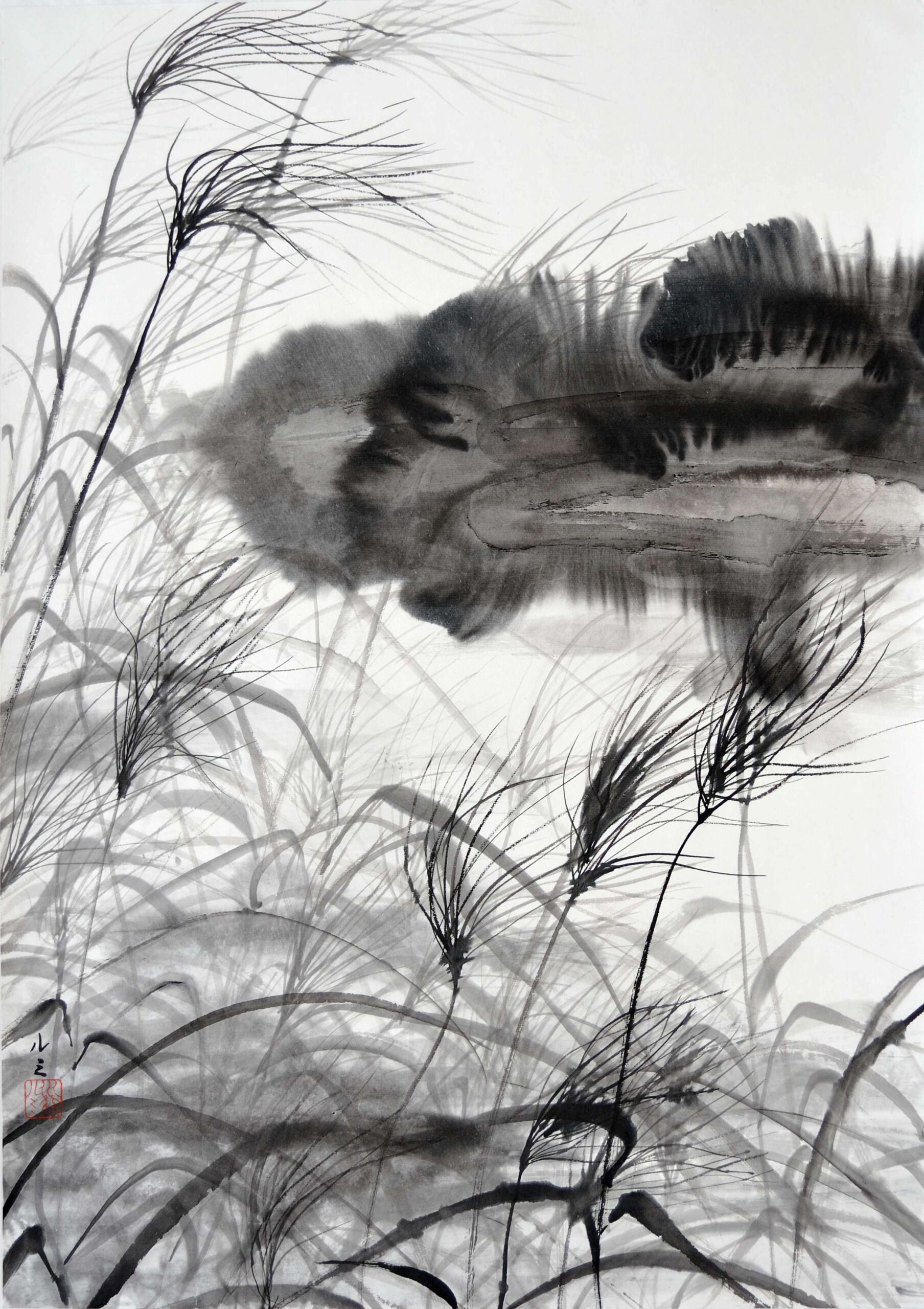 Grass is an ink-wash painting by contemporary Franco-Japanese artist Lumi Mizutani. In this series, the absence of colors leaves room for a precise work on the balanced combination between India ink and water. With these painting created in a watercolor style, the artist pays tribute to the Nature of Japan, especially its flora characterized by bamboos, tall grasses and plum trees.
