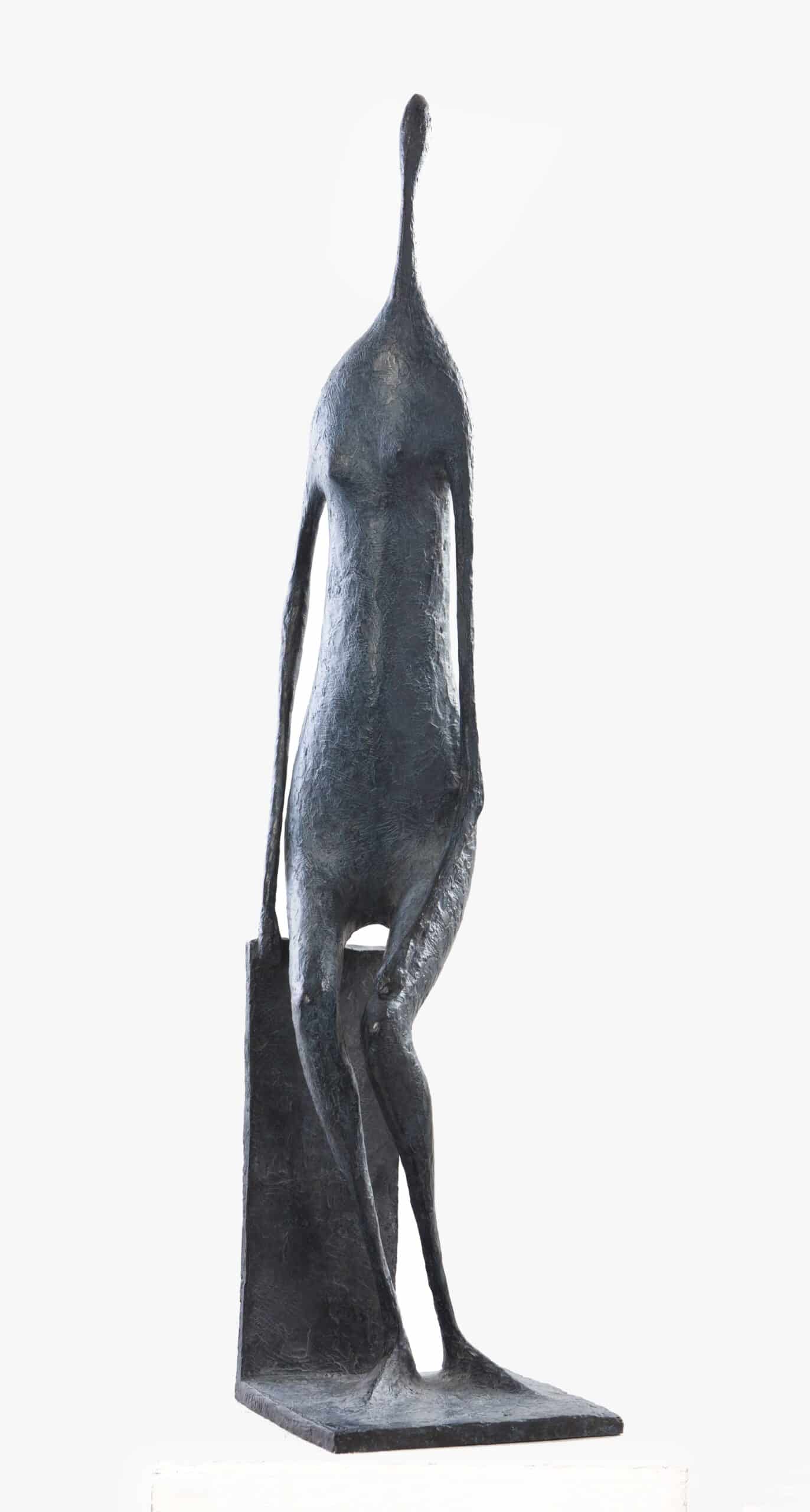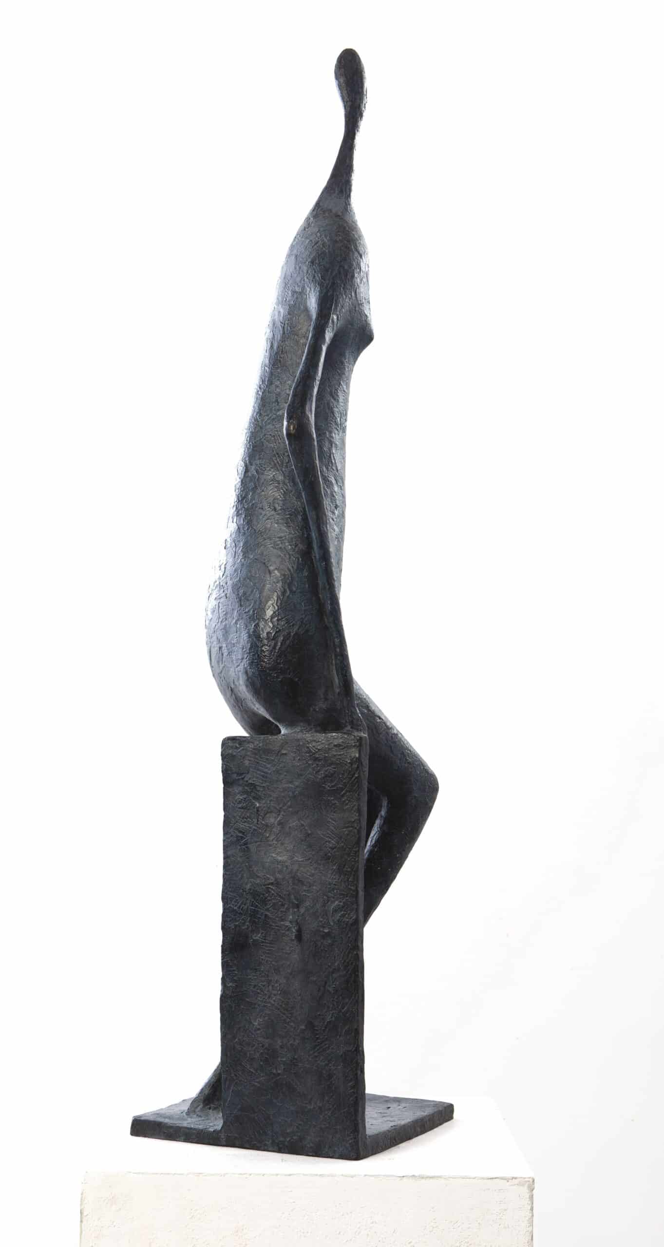 This bronze sculpture with a grey/black patina depicts a seated female figure, her left arm along her thigh and the other resting on the vertical slab supporting her. The head and neck form a long stretch from the shoulders, underlining the artist’s desire to free herself from the reality of proportions. Seated yet precariously balanced, at once slender and massive, this statue is captivating because of the in-betweenness that characterises Pierre Yermia’s work, an in-betweenness that reveals the duality of our condition.