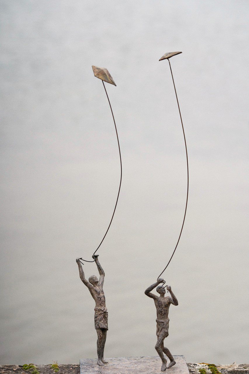 Group of 2 Childhood’s Sails II is an artwork by French contemporary sculptor Marine de Soos. This bronze sculpture is from the “Figure” series. This aesthetically delicate and light figurative sculpture represents two young men flying a kite. The artist gets her inspiration from real or imaginary scenes.