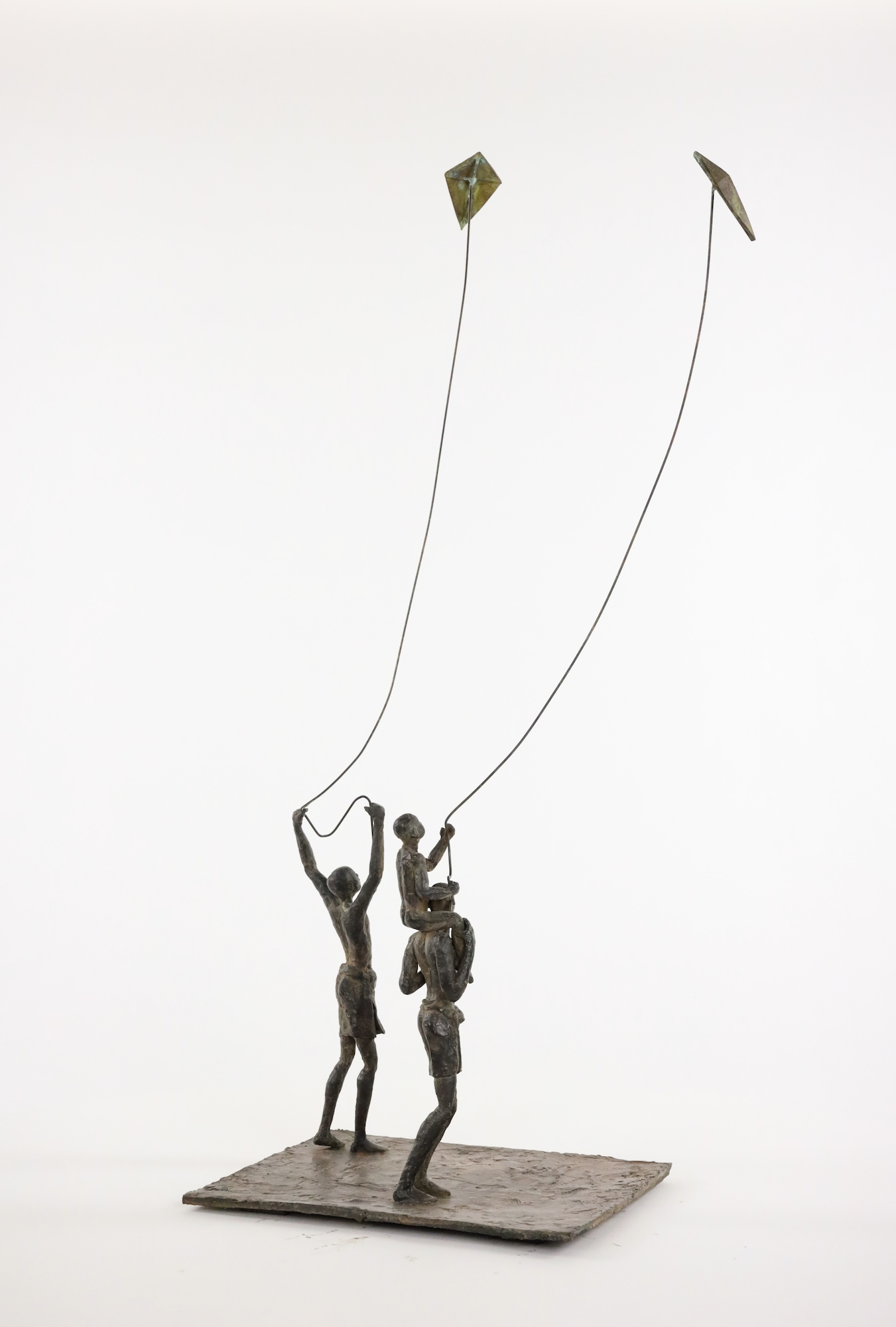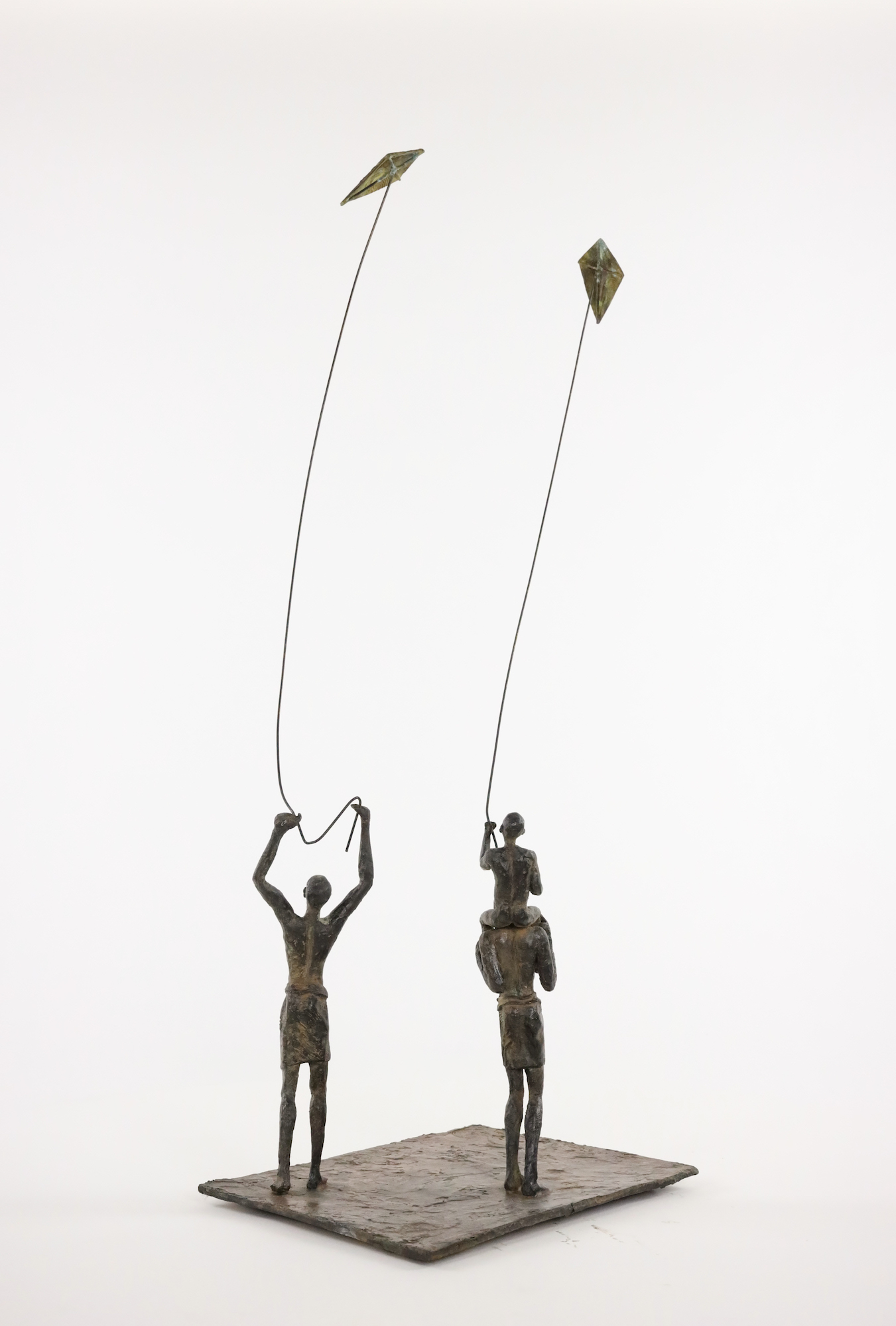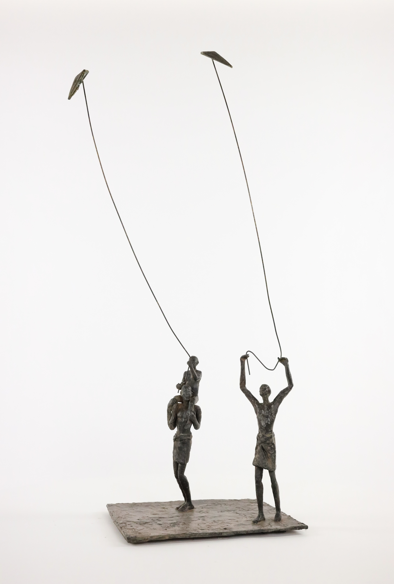 Group of 2 Childhood’s Sails IV is an artwork by French contemporary sculptor Marine de Soos. This bronze sculpture is from the “Figure” series. This aesthetically delicate and light figurative sculpture represents two young men and a child flying two kites. The artist gets her inspiration from real or imaginary scenes.
