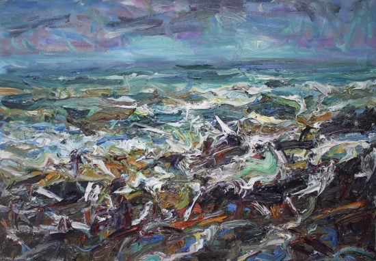 This landscape evokes the African savannah with its large areas of land and arid vegetation. The artist plays on complementary colors creating a dialogue between yellow and purple, blue and orange, and green and pink. This painting is perhaps inspired by a trip he took to South Africa. The geometric structures, characteristic of the artist’s work, structure this landscape and extend the perspective towards the distant horizon.