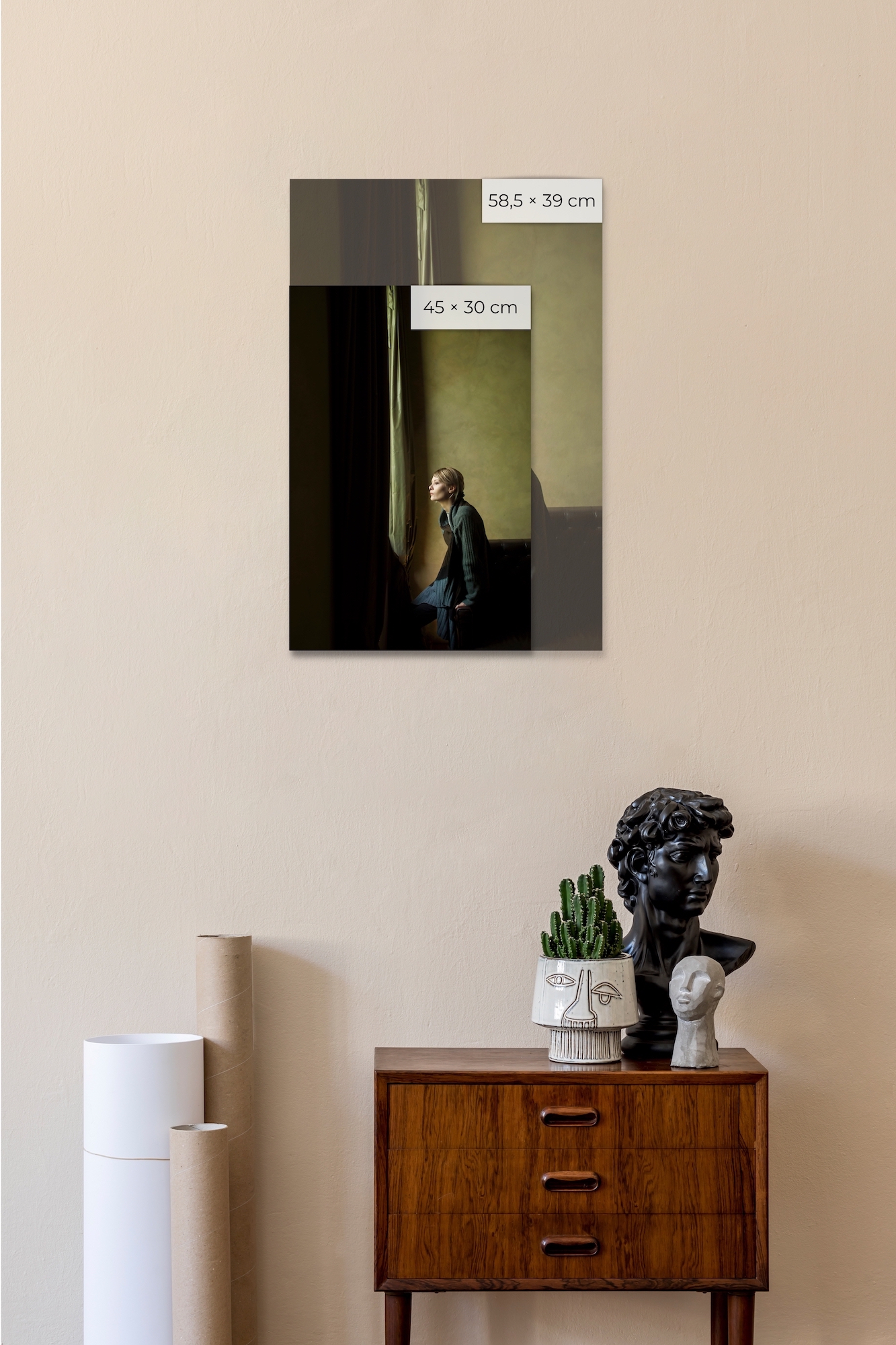 The 30 x 45 cm format is printed with white margins of approximately 3 cm (1.5 cm on each side). Paper dimensions: 32.9 cm x 48.3 cm for the 30 x 45 cm format. The 39 x 58.5 cm format is printed with white margins of approximately 3 cm on one dimension and 1 cm on the other. Paper dimensions: 42 x 59.4 cm for the 39 x 58,5 cm format.