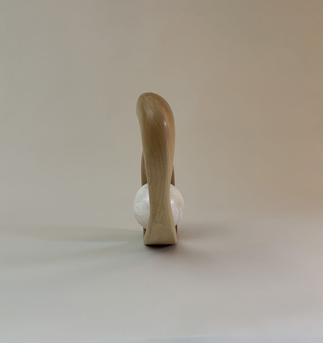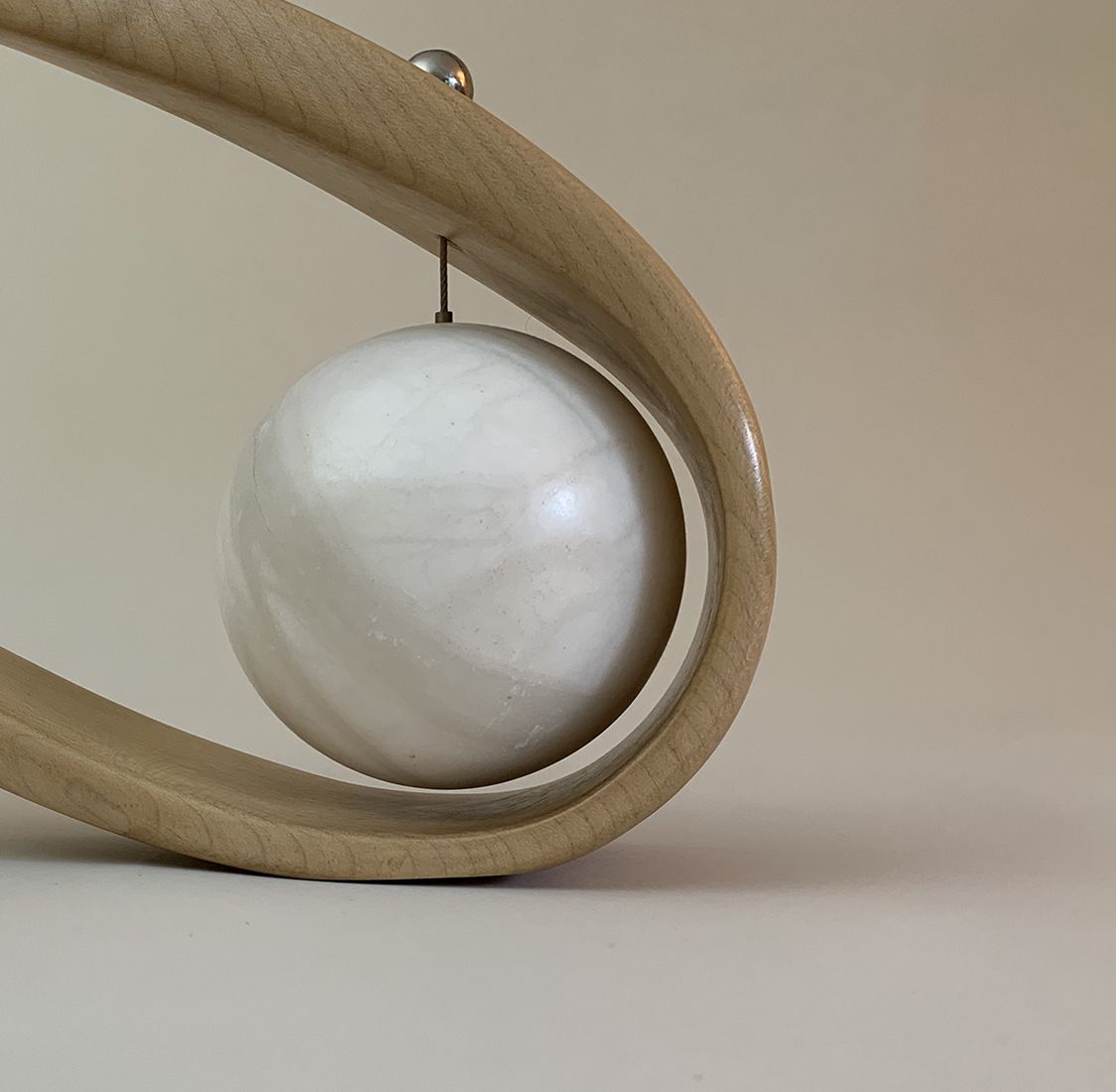 Hang is a wood and stone sculpture by contemporary British artist Peter Brooke-Ball. This sculpture in sycamore wood, steel and alabaster recalls a certain tradition of kinetic sculpture. If its playful form confers a humorous meaning to the creation, this sculpture demonstrates the technical skills of the artist, who works with multiple materials for these contemporary creations.