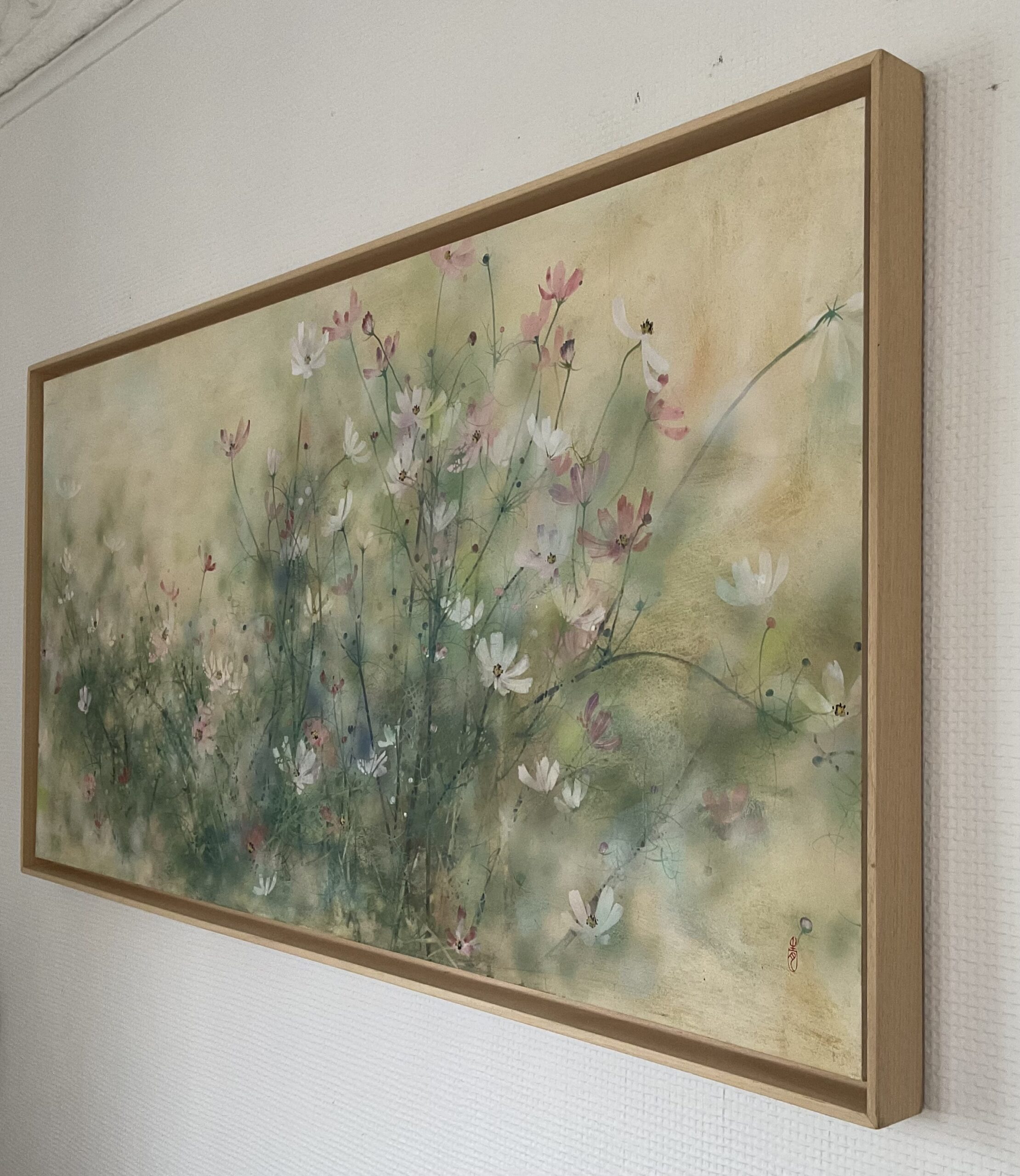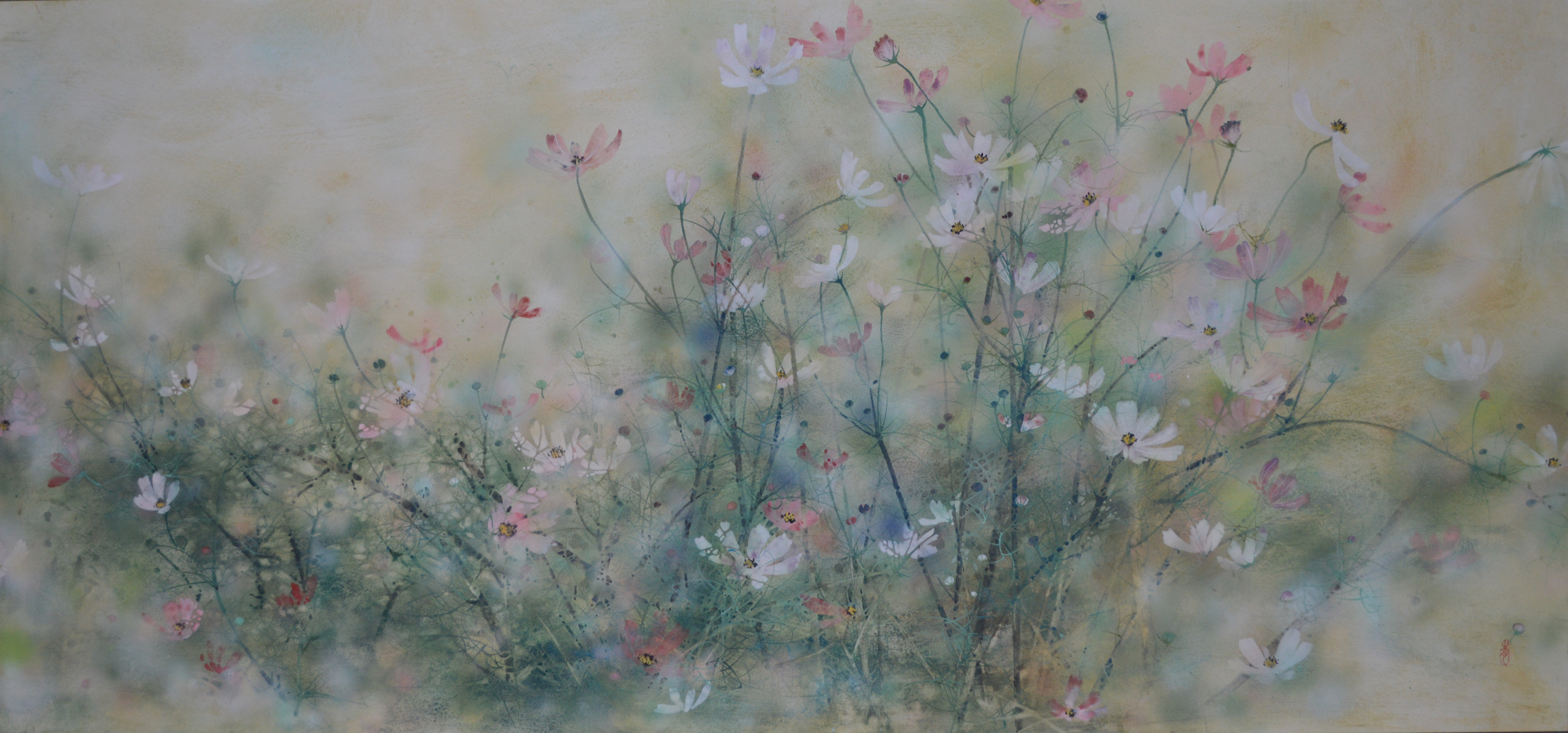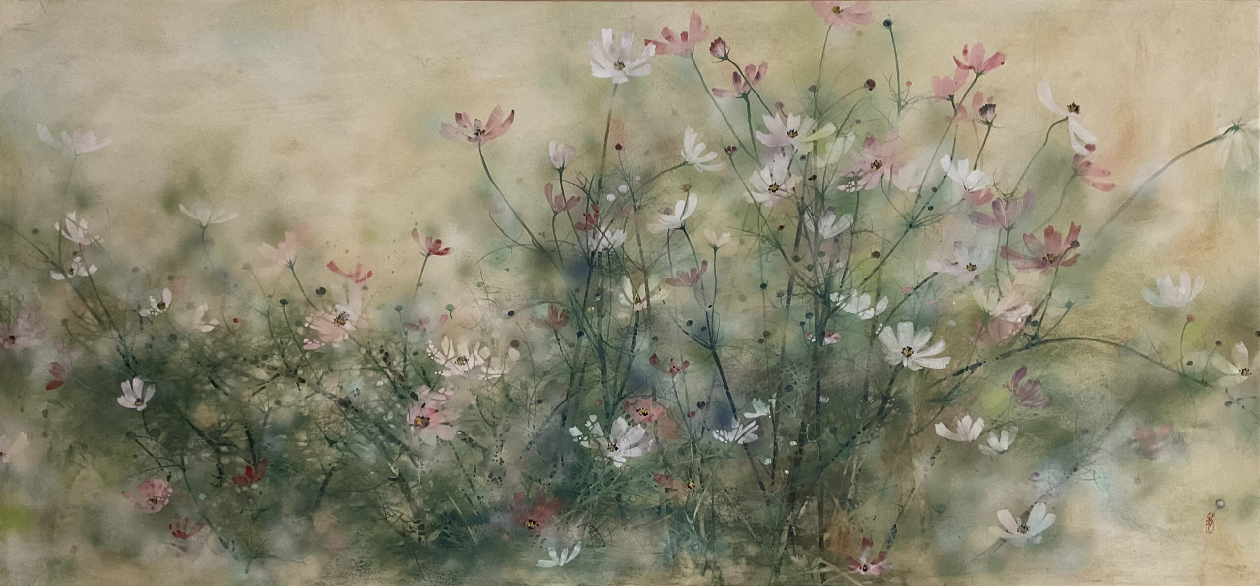 Happinessis a painting created by the contemporary Taiwanese artist Chen Yiching using mineral pigments. The painting features a multitude of pink cosmos flowers intertwined with each other, creating the image of a delicate, harmonious flower garden.