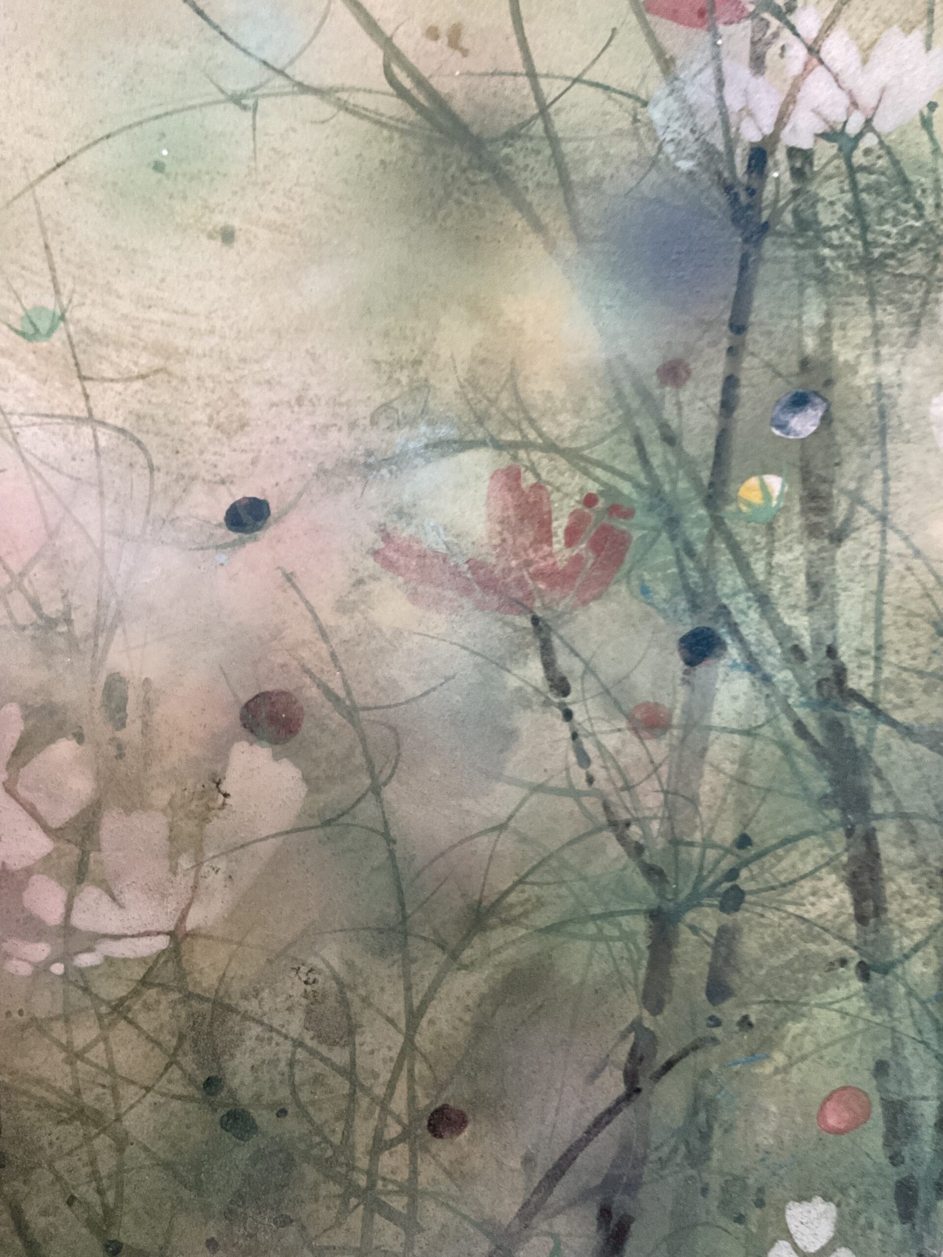 The artist gets all of her inspiration from nature. Her paintings (floral compositions, cross-sections of forests, some animals) are proof of this. She expresses her sensibility by use of a harmonious language which is both controlled and delicate.