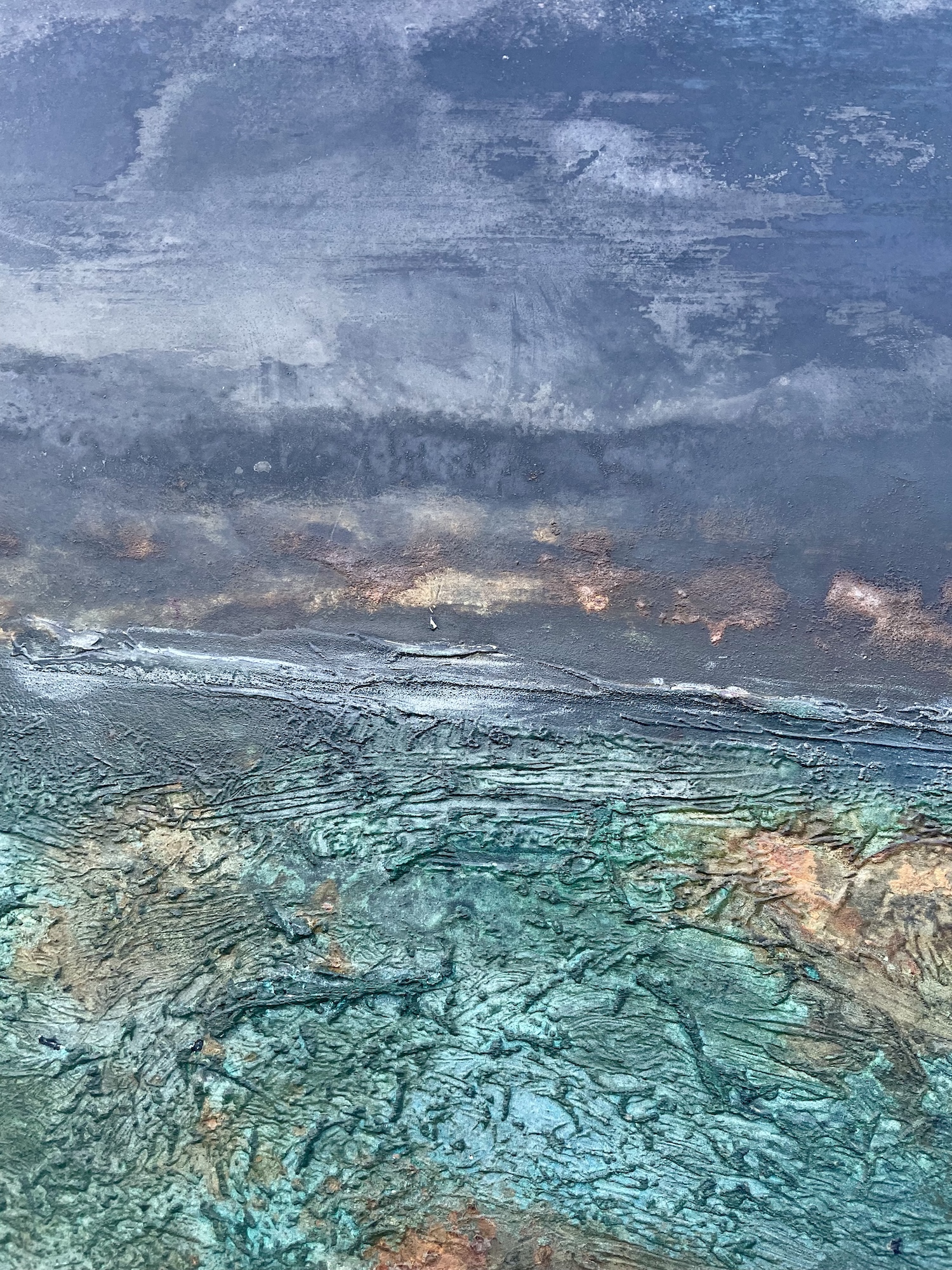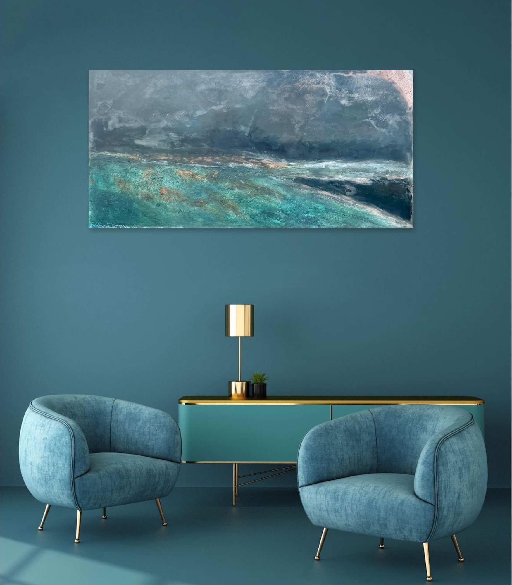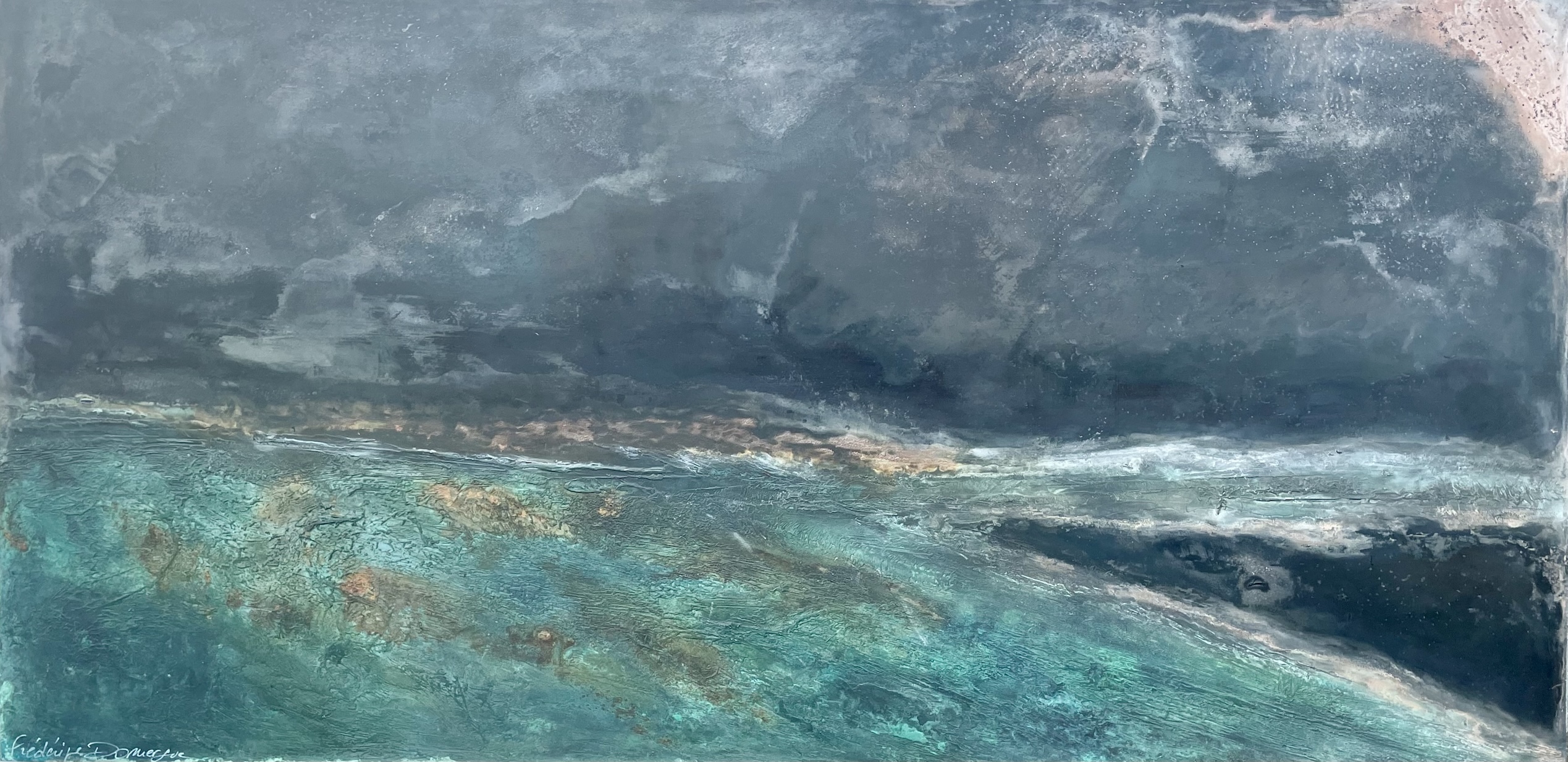 Domergue, finding profound inspiration in the natural world, particularly the elemental meeting point of the shore and the sea, evokes a sense of vast distance and dramatic contrast in this piece. The horizontal composition is divided by a powerful horizon line, with the upper register dominated by a broad, turbulent sky of deep, stormy blues and grays. This heavy sky descends toward a foreground of richly textured, vibrant turquoise and coppery oxidized surface, representing the shallow, turbulent waters breaking on the shore.