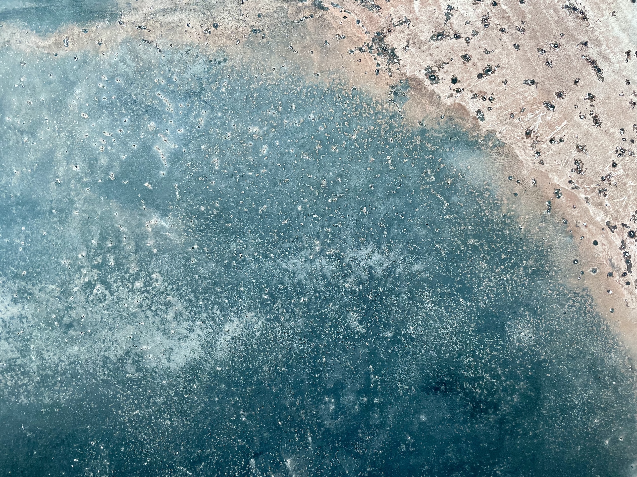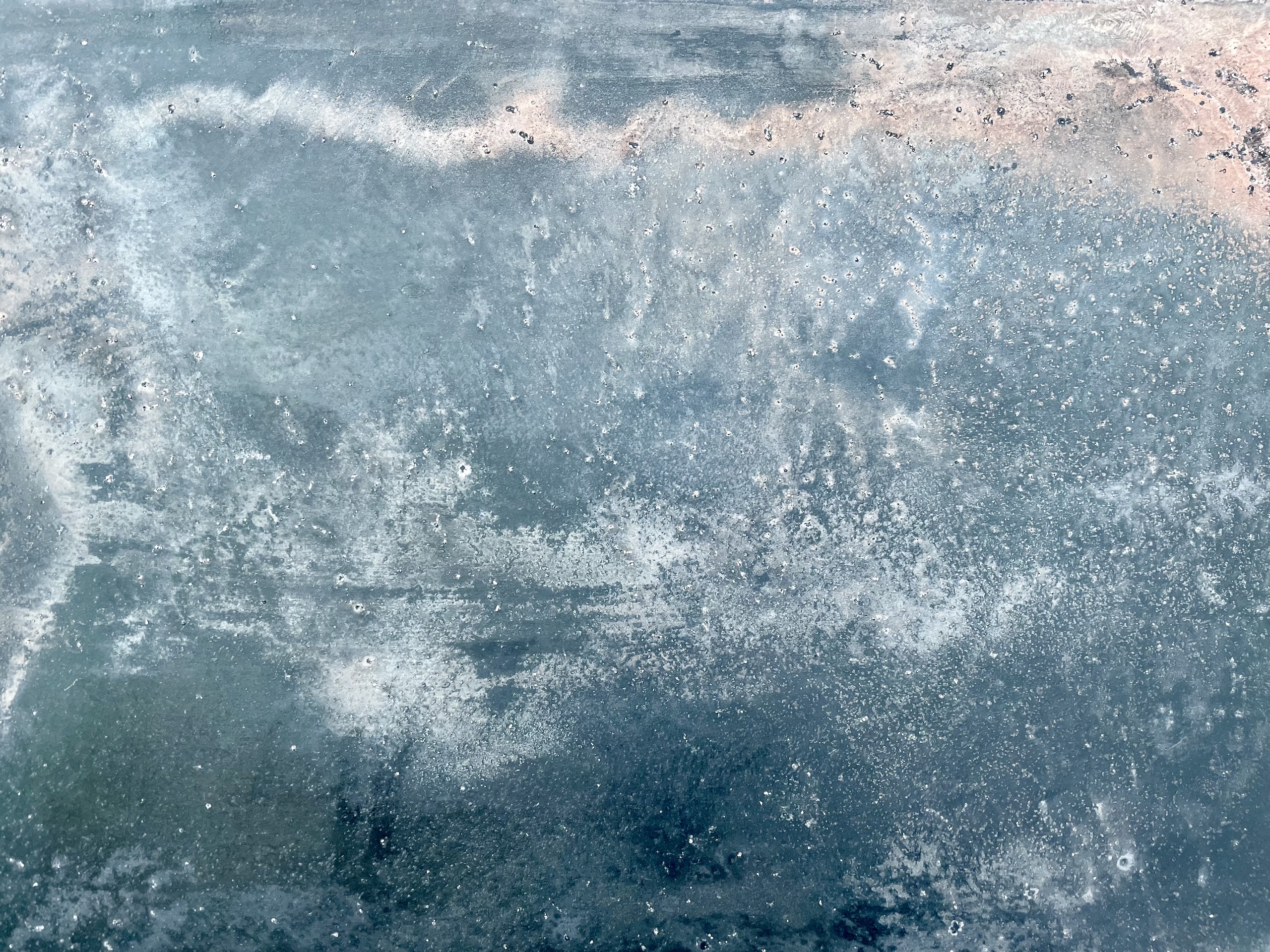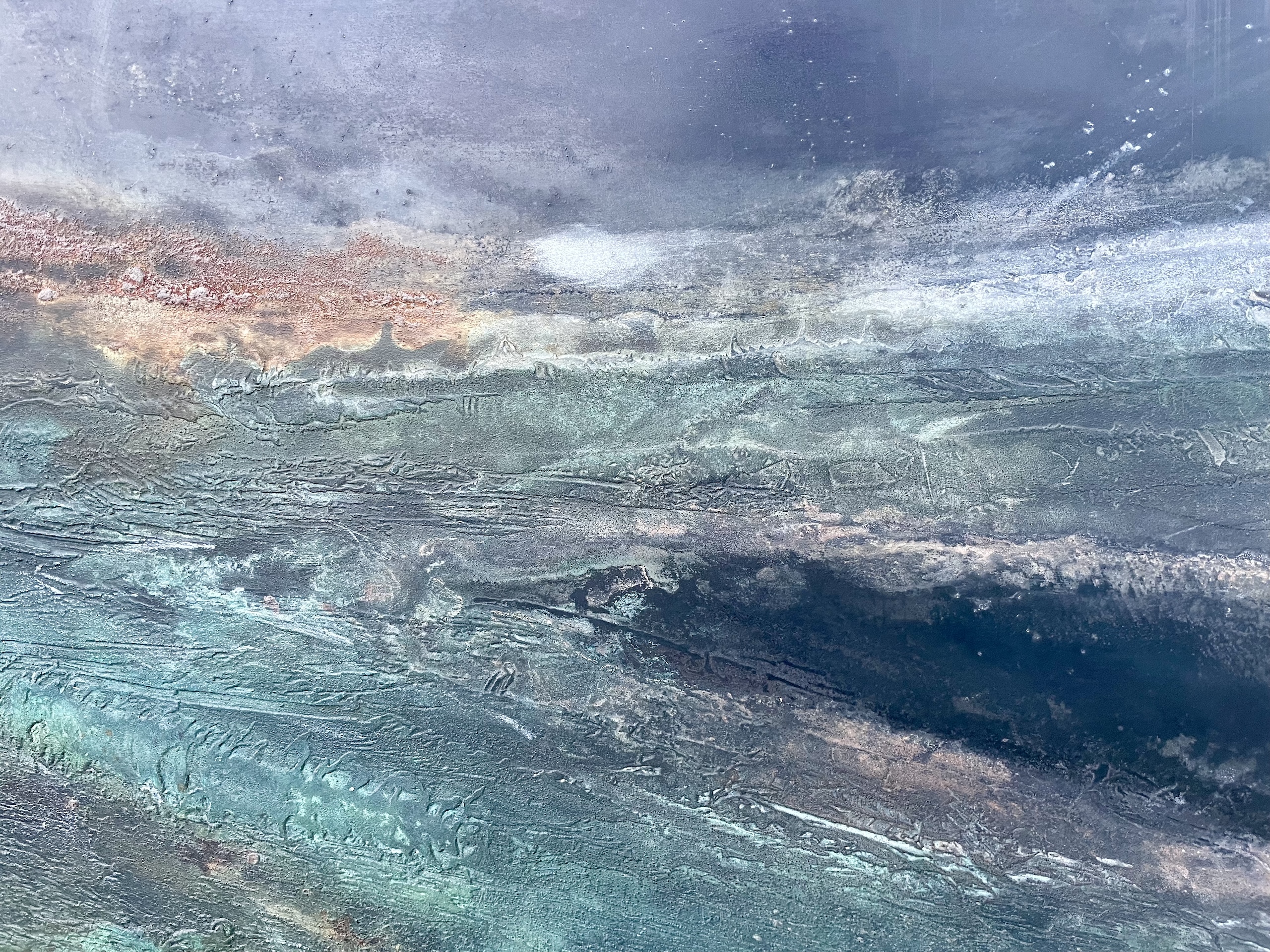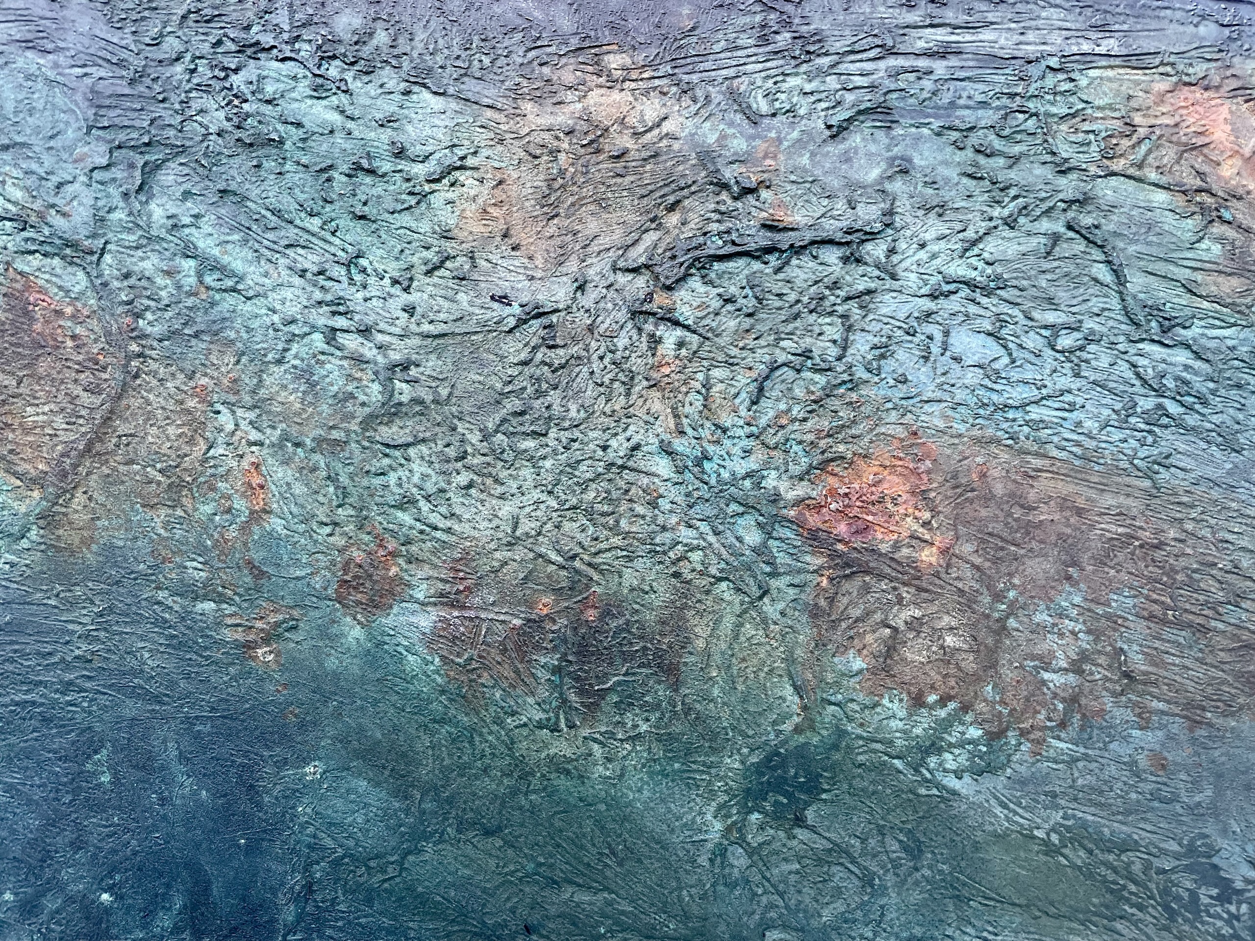 Horizon over the Shoreline is an artwork by French contemporary artist Frédérique Domergue, crafted with oxidized zinc and bronze leaves on honeycom aluminum panel.