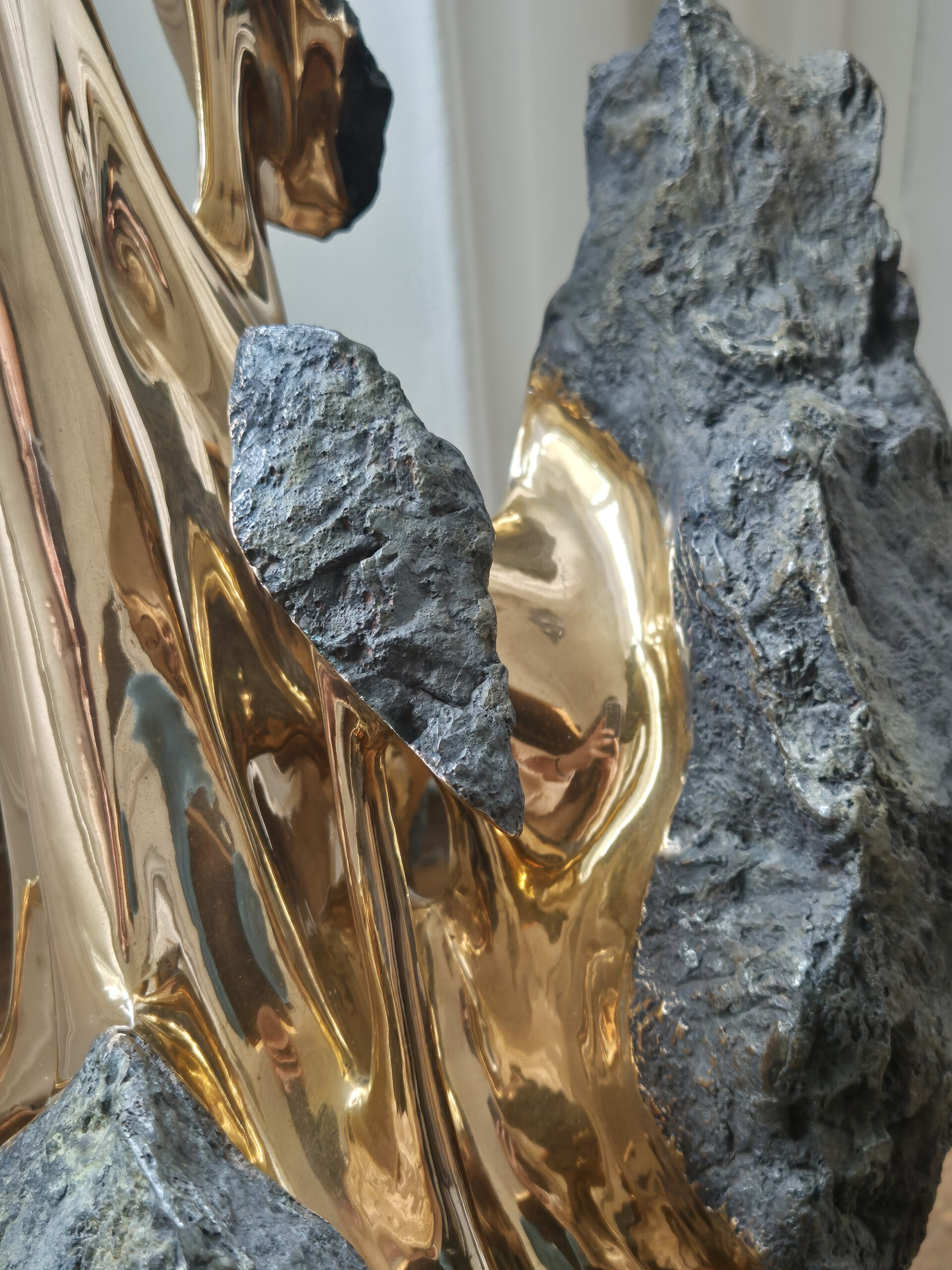 This sculpture takes the form of an exploded rock whose different pieces are linked to an apparently liquid heart. This dynamic work tends towards the surrounding space and it is entirely made of bronze; in part patinated to imitate a rocky surface and also polished to give arise to the almost fluid golden substance.