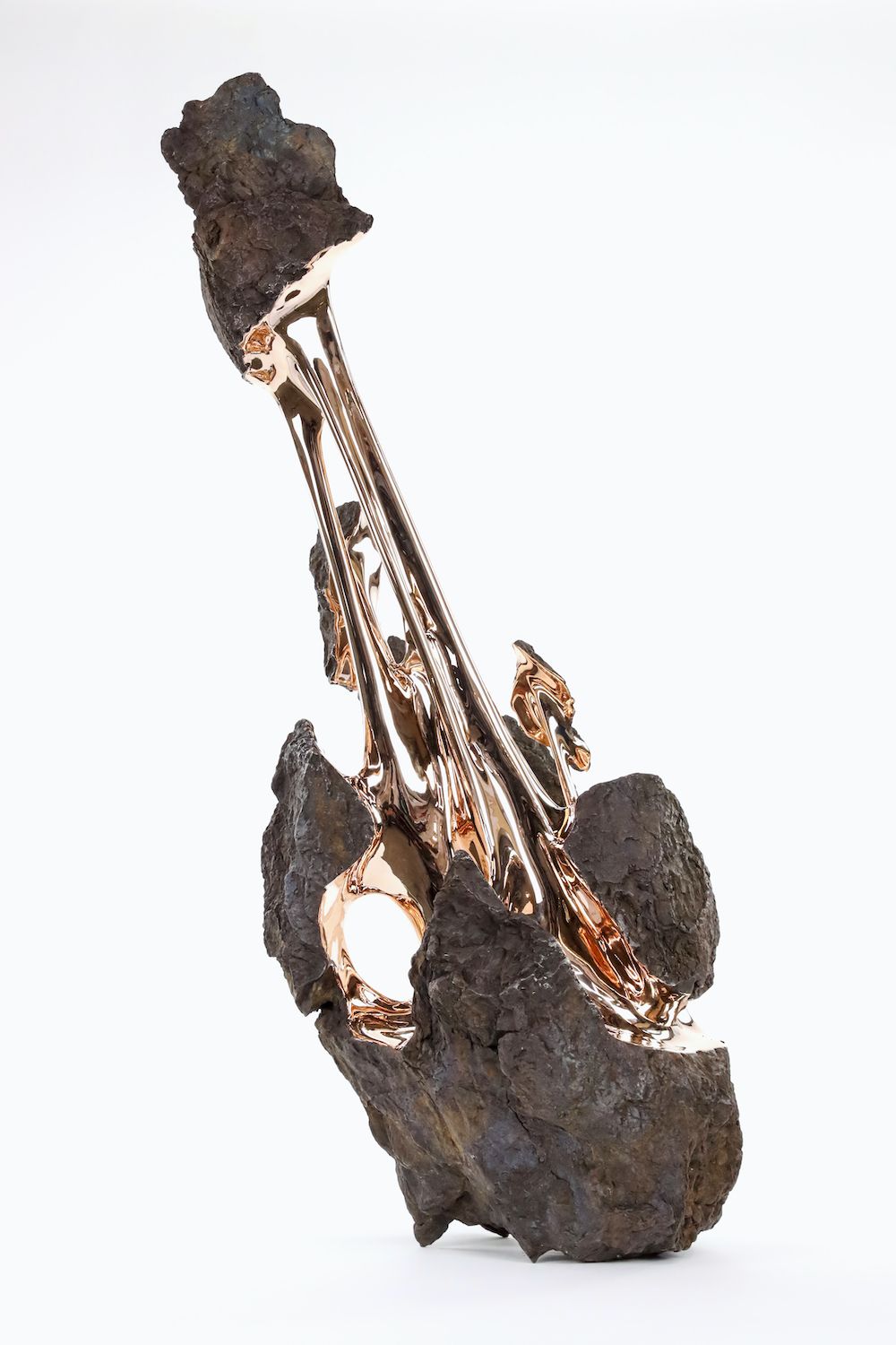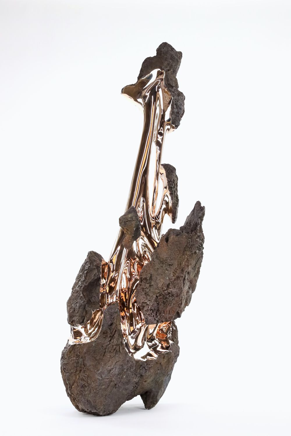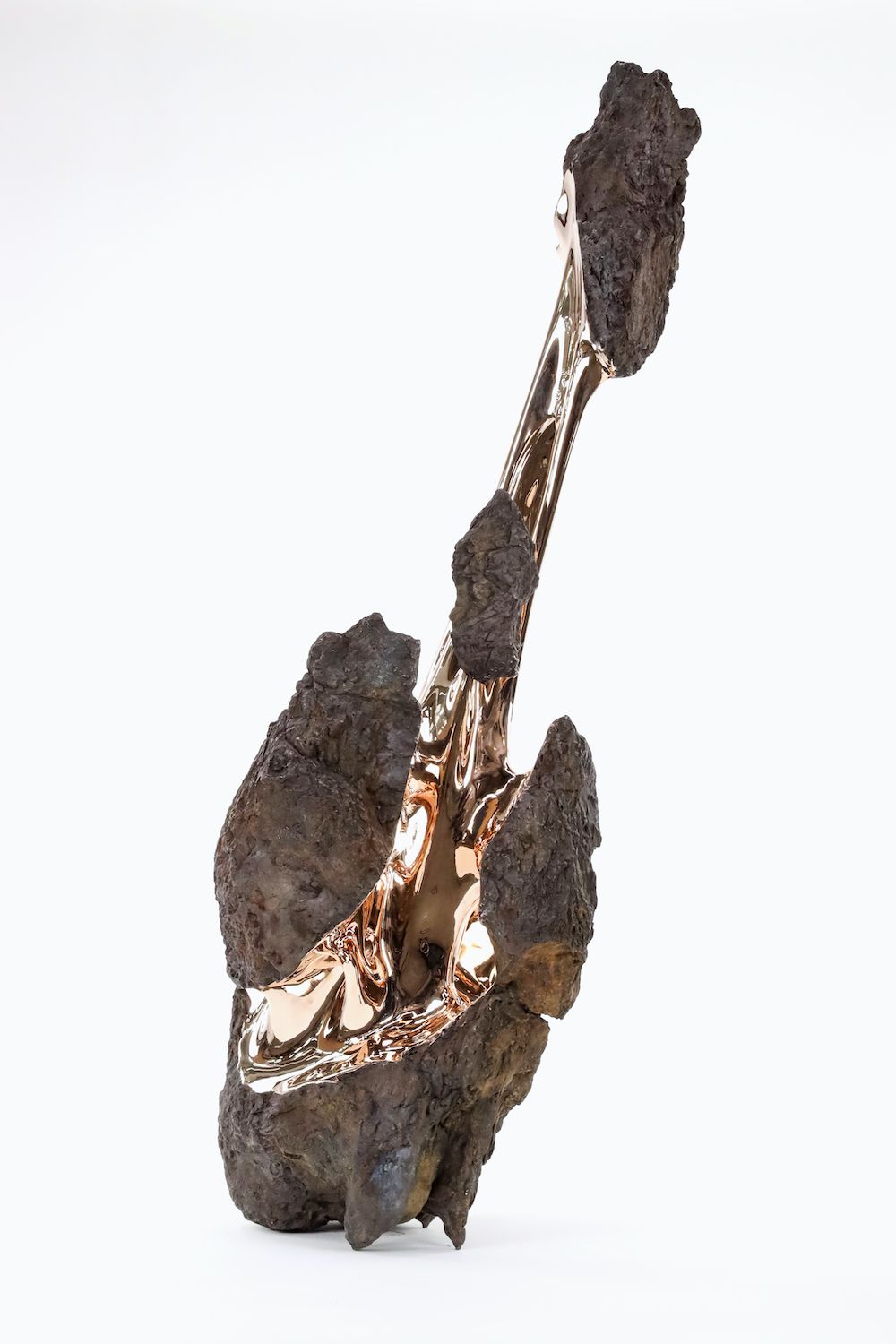 Romain Langlois draws his inspiration from nature. These stumps, rocks, abandoned branches are brought back to life by the artist thanks to his spectacular bronze work. Thanks to the bronze patina, the copied nature is formally transformed as well as substantially: the forms are stretched, hollowed out and a golden material – achieved by polishing the bronze – springs from the object’s core. Precious pieces are created before our eyes, making us forget the unimportance of their origin.