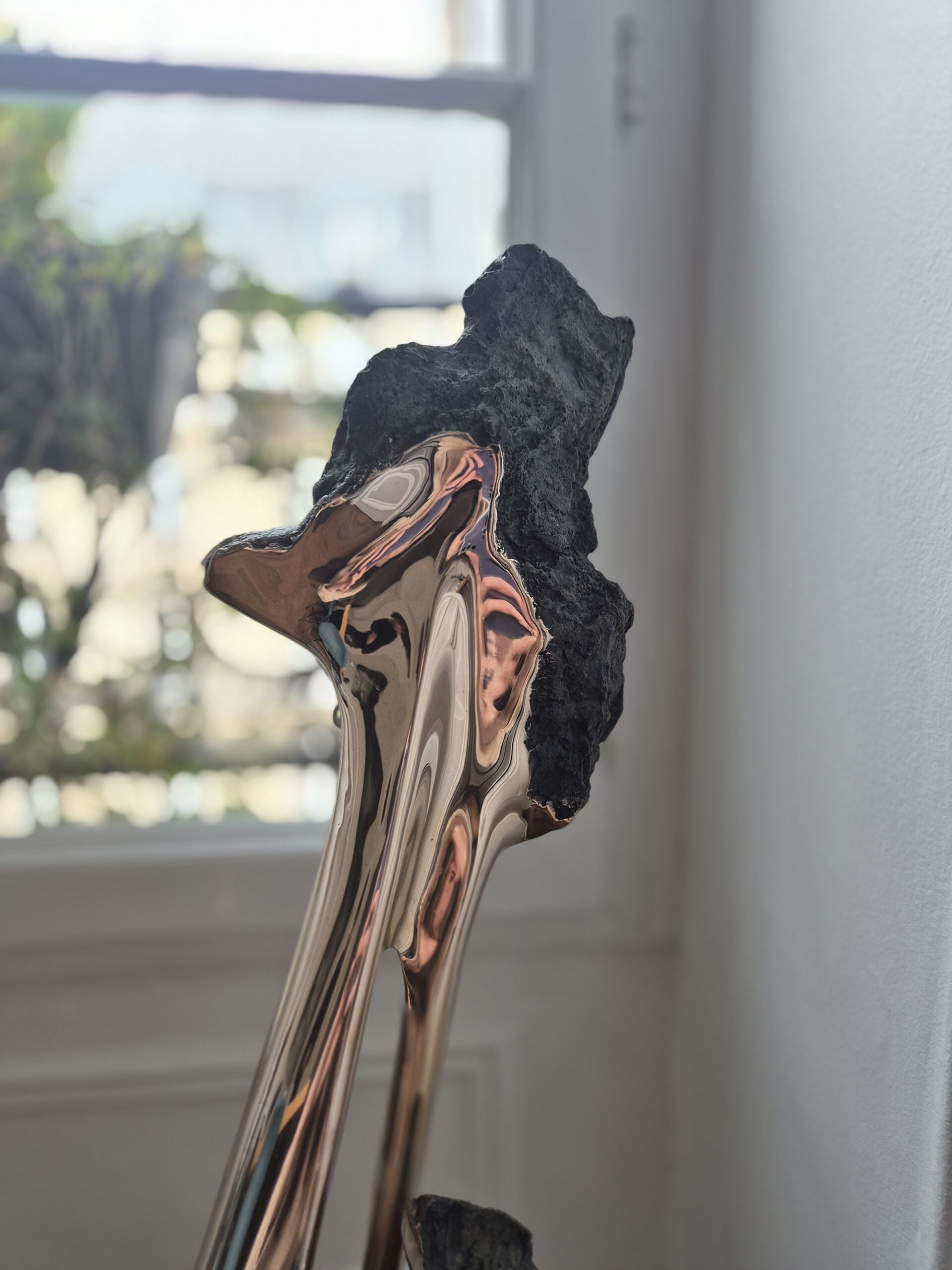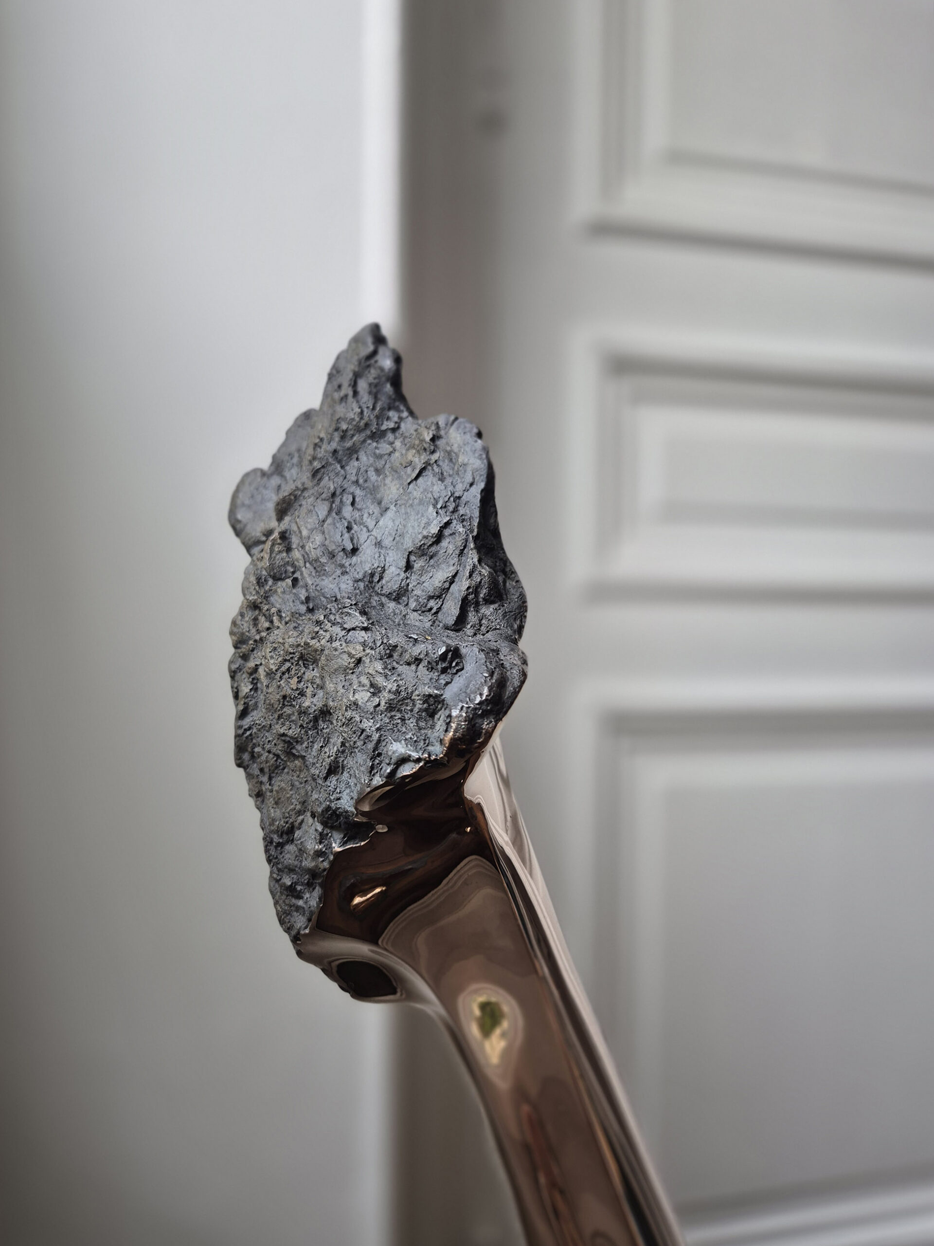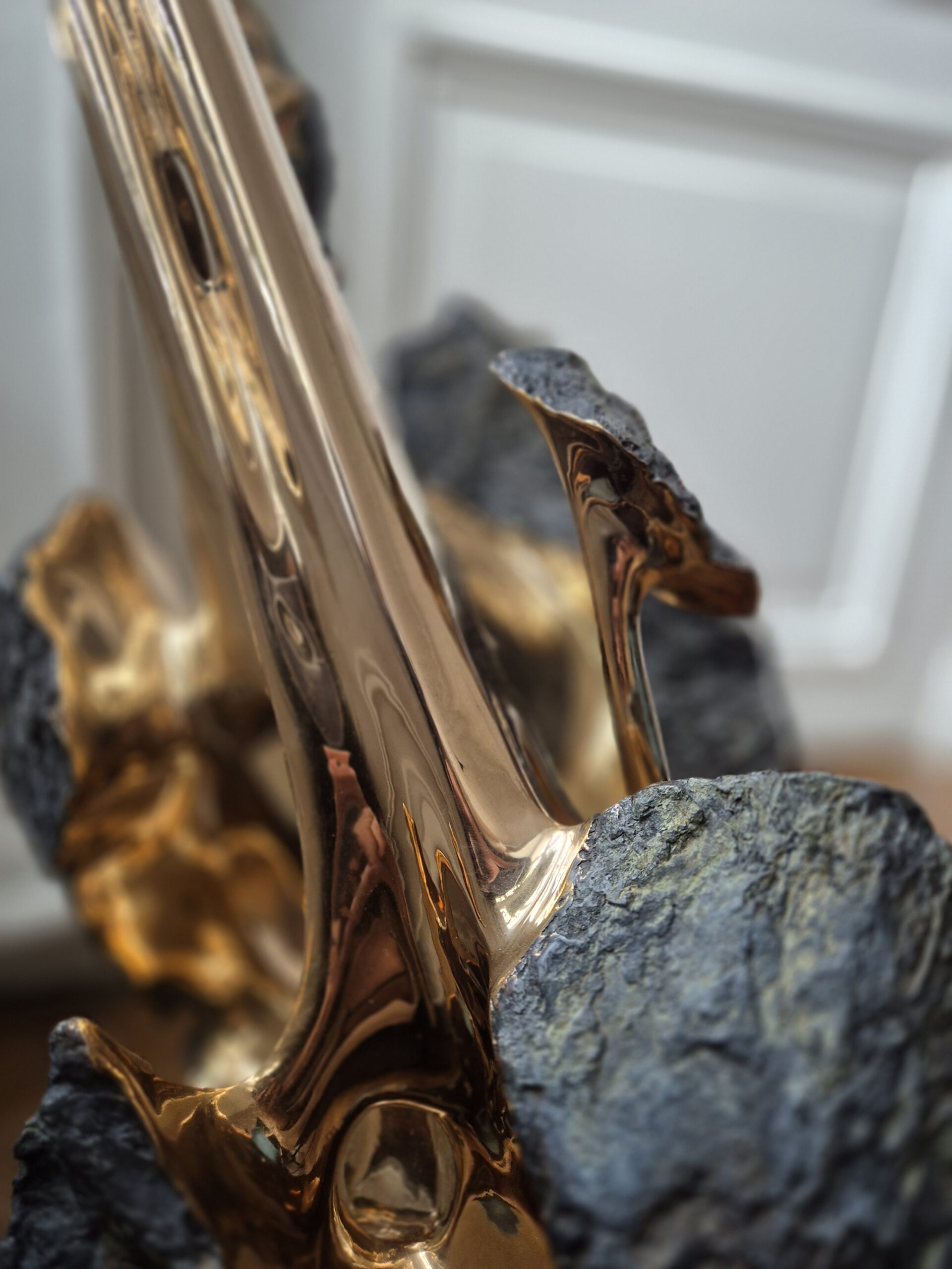 Romain Langlois draws his inspiration from nature. These stumps, rocks, abandoned branches are brought back to life by the artist thanks to his spectacular bronze work. Thanks to the bronze patina, the copied nature is formally transformed as well as substantially: the forms are stretched, hollowed out and a golden material – achieved by polishing the bronze – springs from the object’s core. Precious pieces are created before our eyes, making us forget the unimportance of their origin.