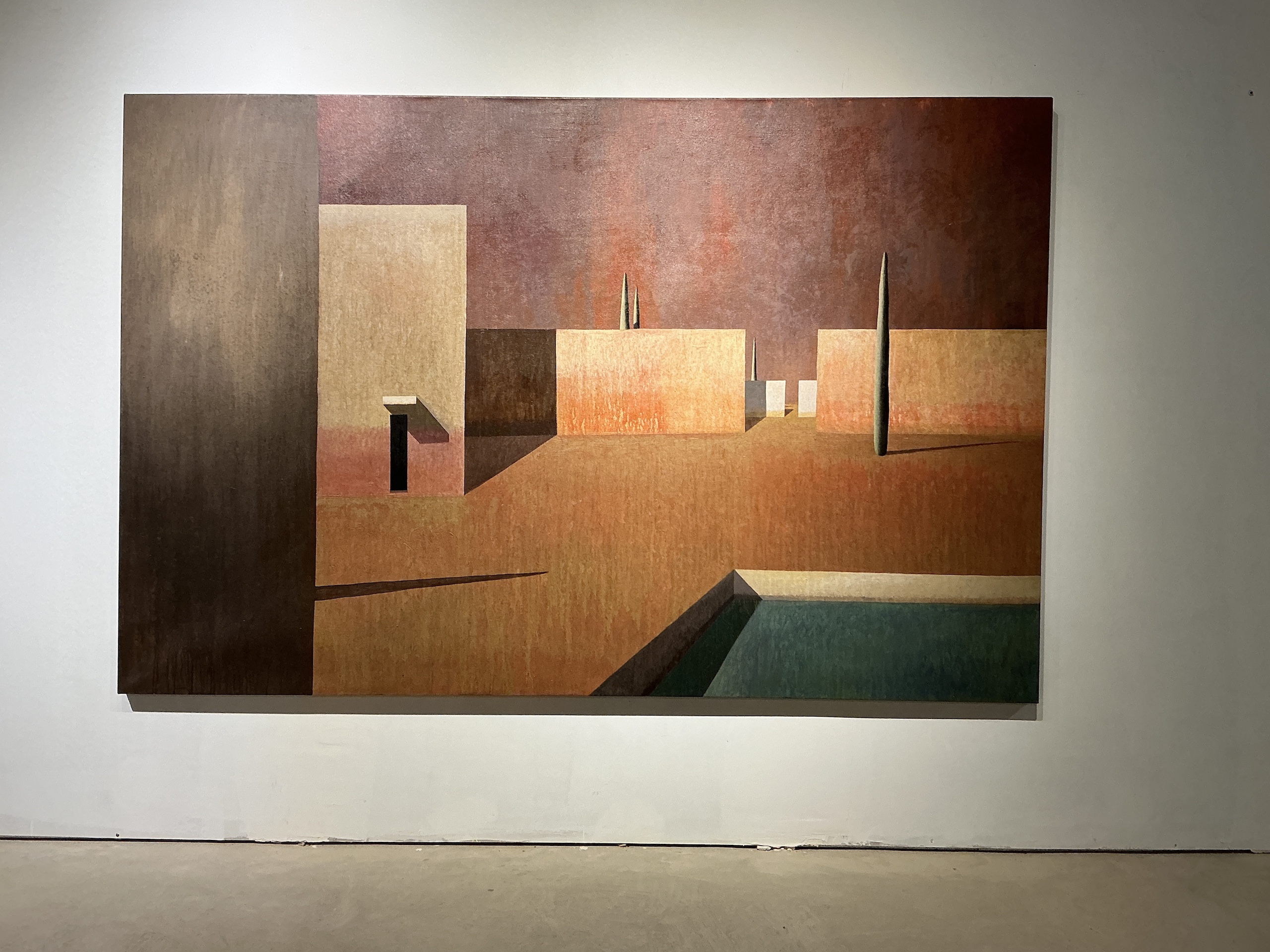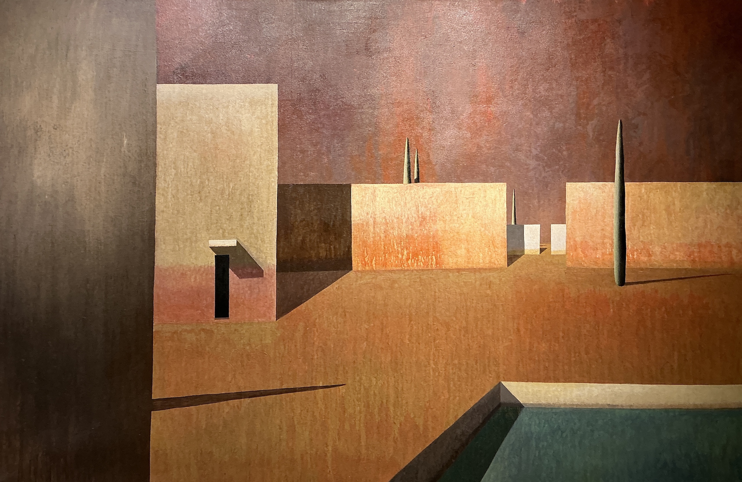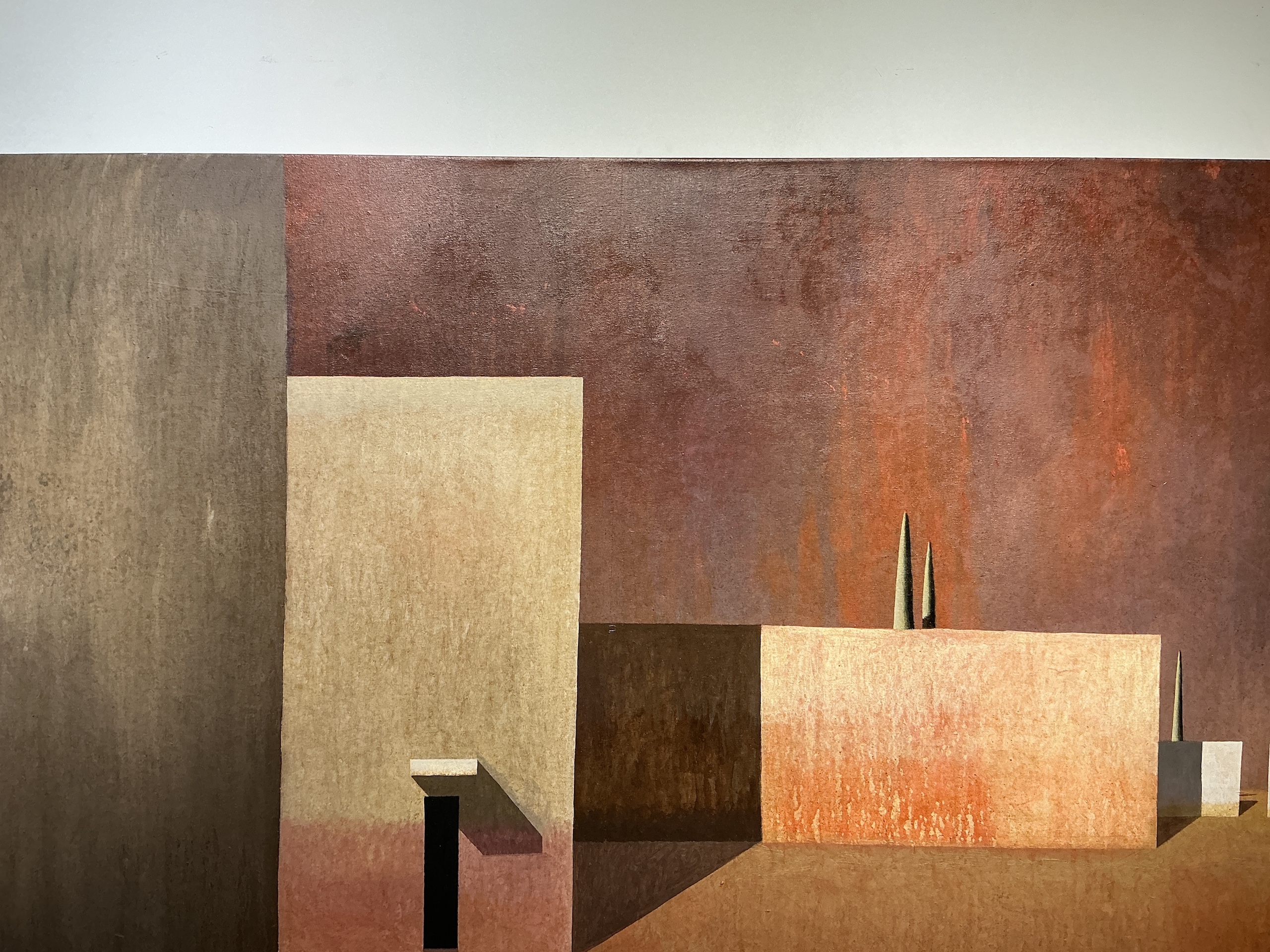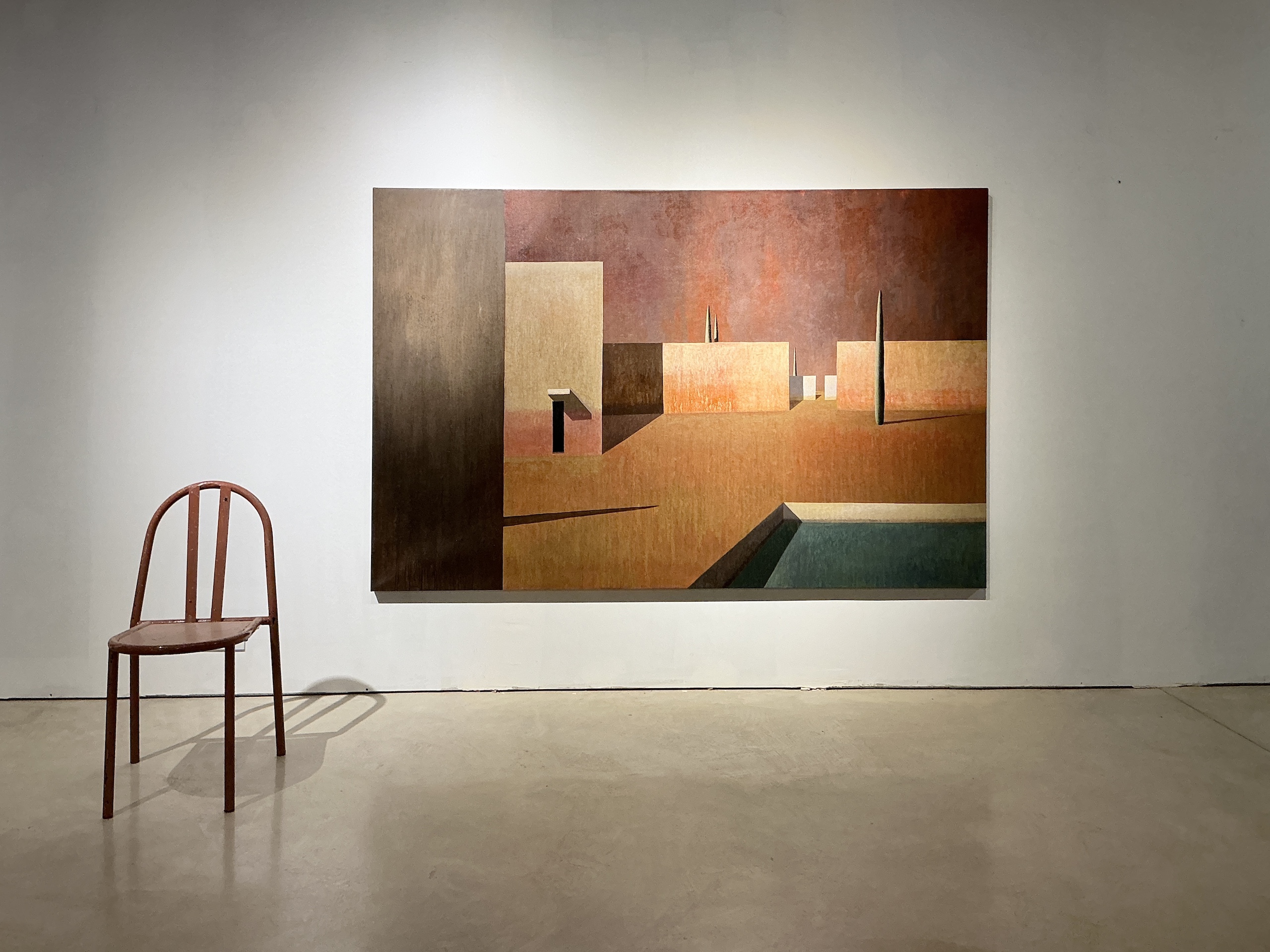 In these paintings, the artist establishes a conversation between architecture and landscape in a figurative work boasting geometric shapes and an enigmatic atmosphere. The landscapes and the simplicity of the forms (nearly abstract) make for a very theatrical view of architecture.