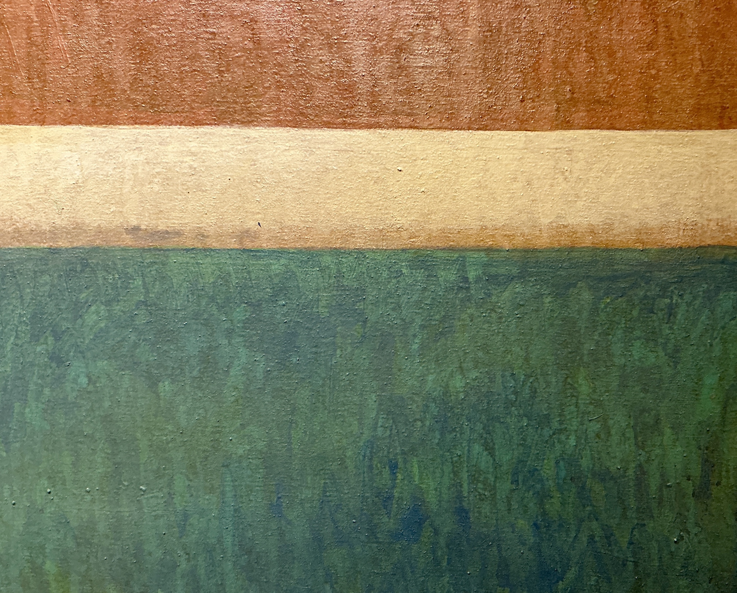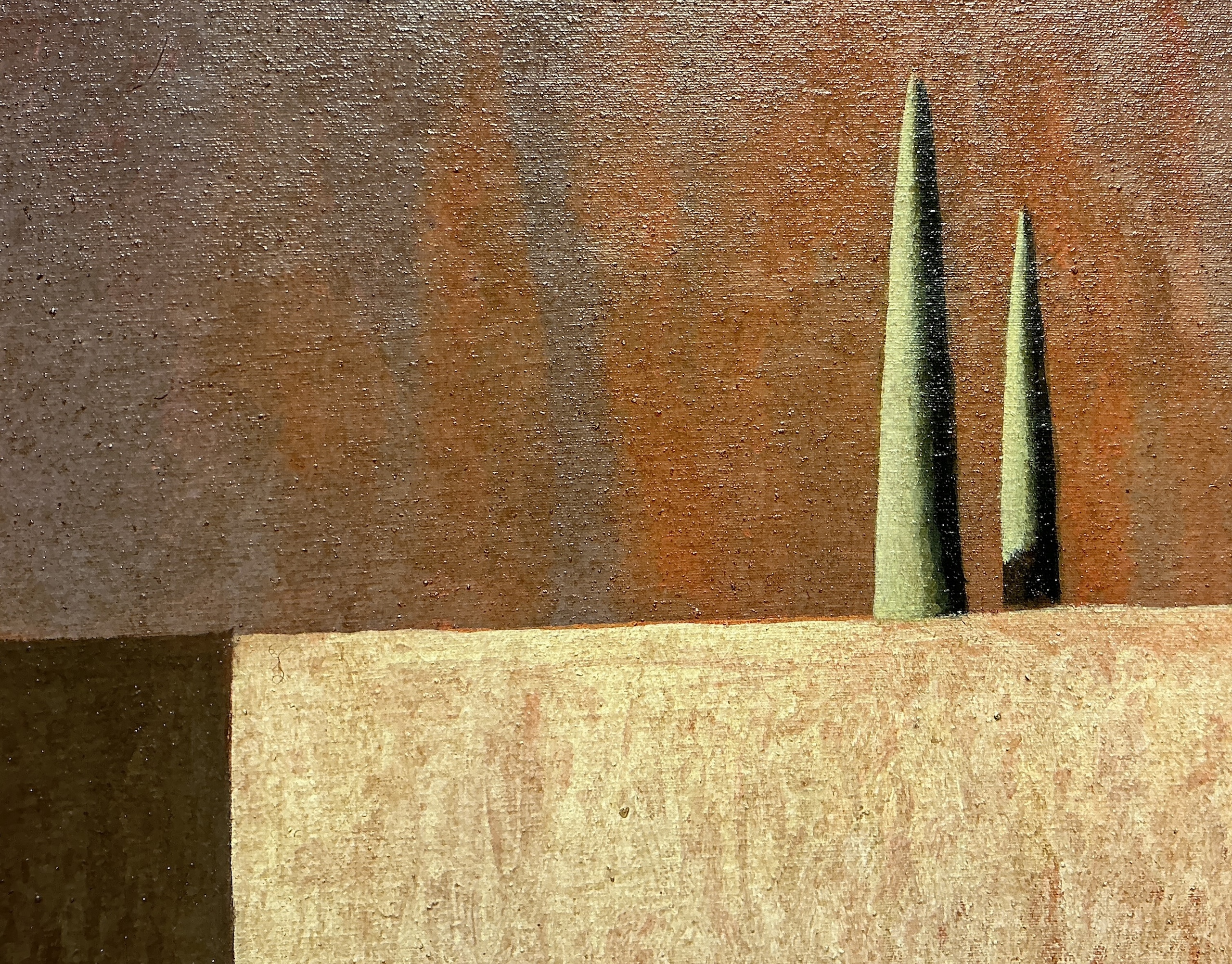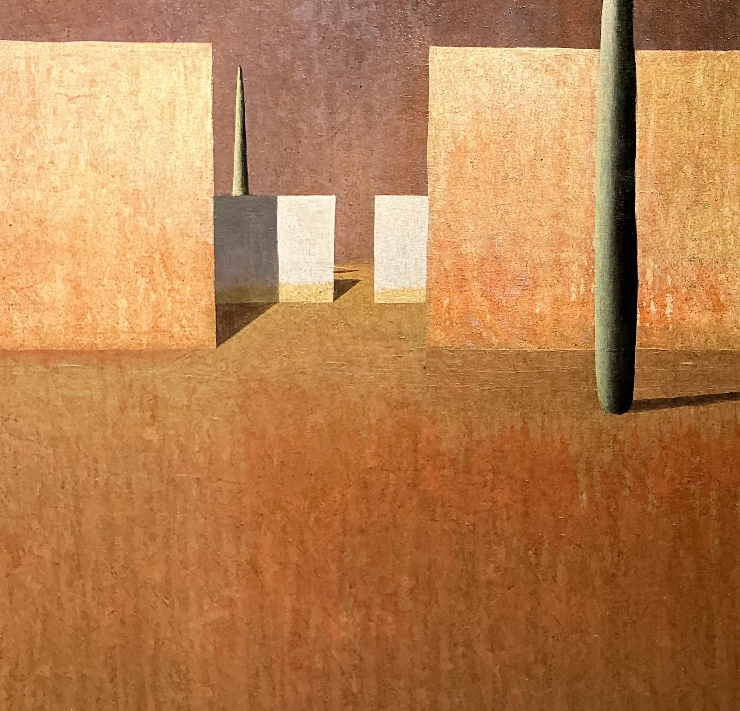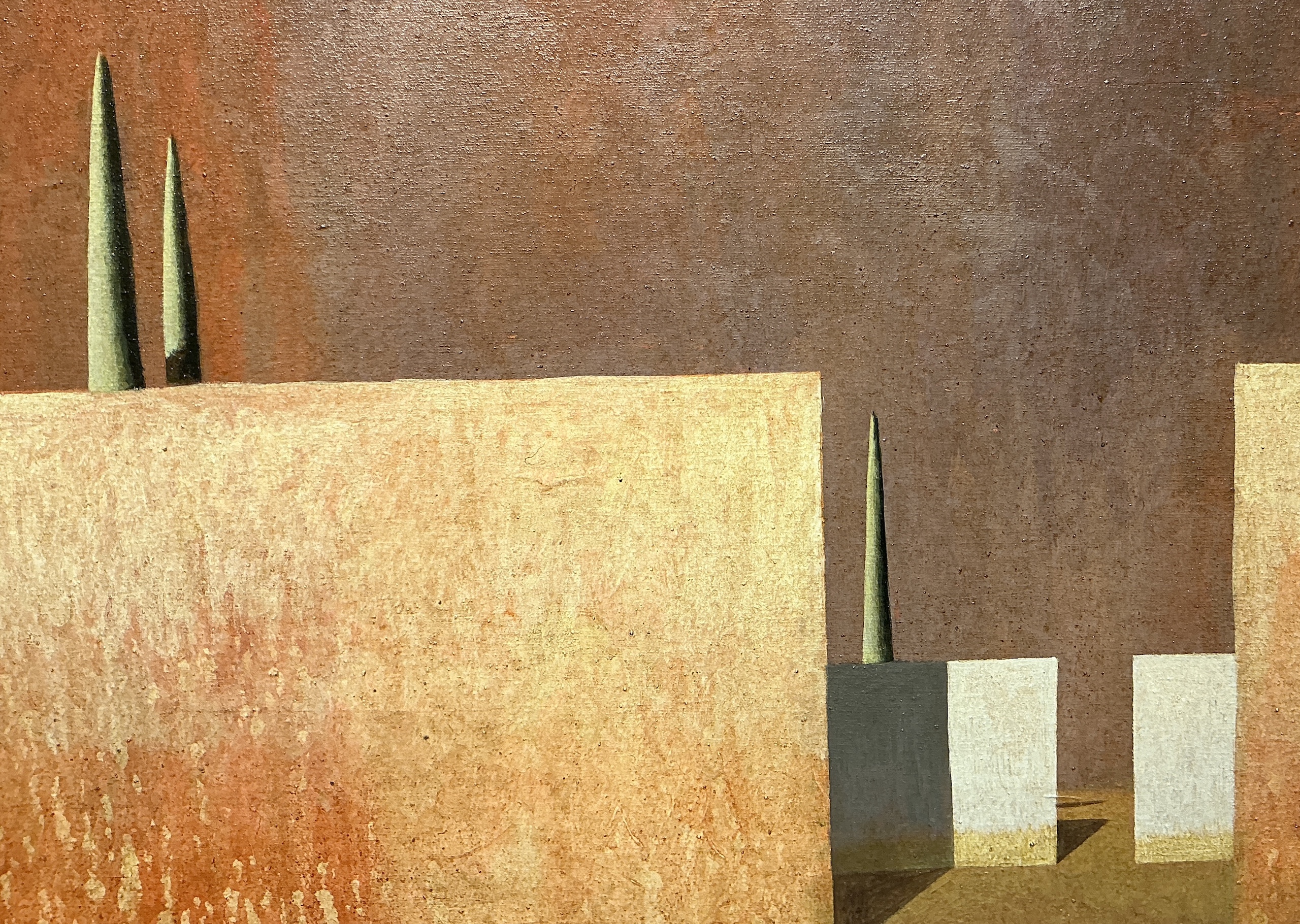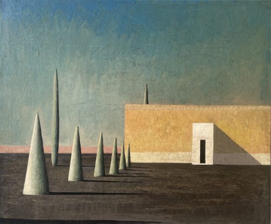 In these paintings, the artist establishes a conversation between architecture and landscape in a figurative work boasting geometric shapes and an enigmatic atmosphere. The landscapes and the simplicity of the forms (nearly abstract) make for a very theatrical view of architecture.