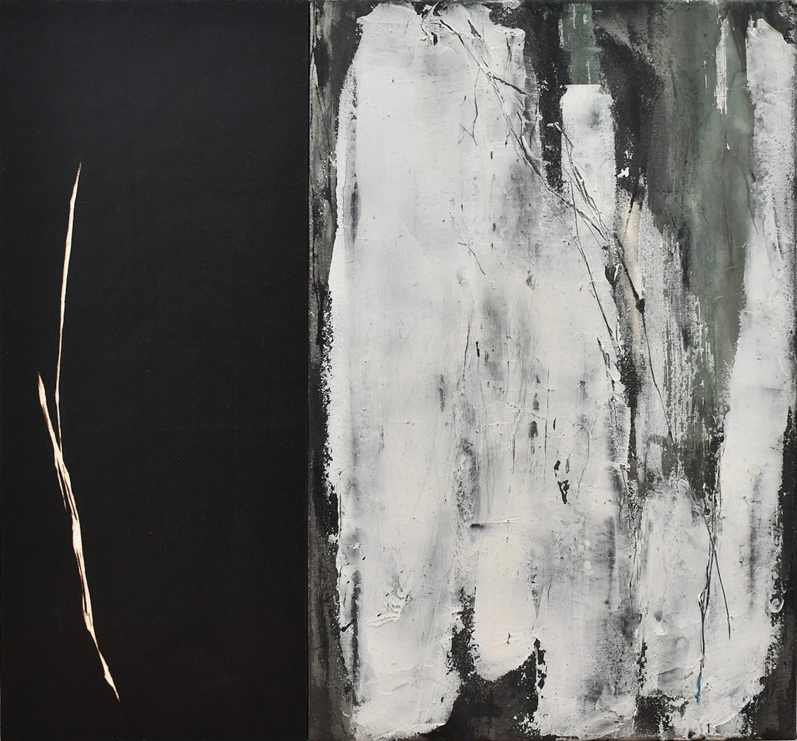 This work is composed of two assembled panels that give the work two different surfaces: canvas and wood. The artist likes to experiment with different mediums and techniques; here she mixes acrylic paint with ink and coloured pencils, and uses a knife to carve her lines into the wood.