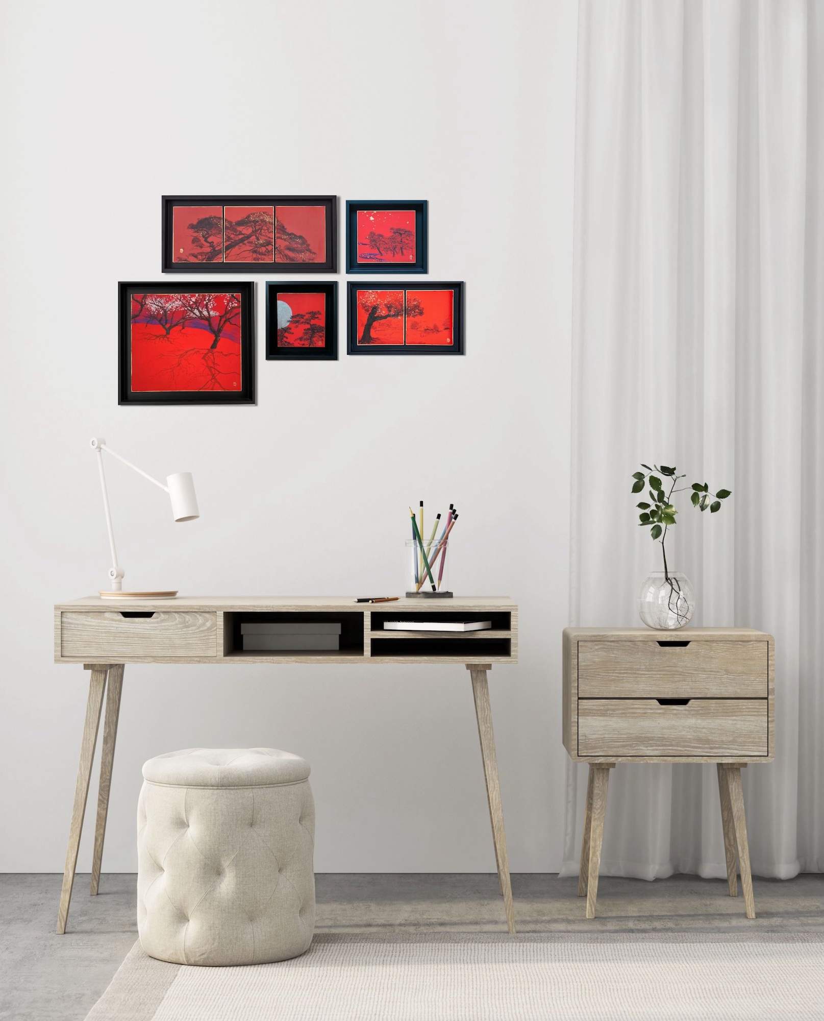 Installation of 5 landscape paintings is set of five artworks by contemporary Franco-Japanese artist Lumi Mizutani. Landscape of Tokyo V – Rikugien is from 2017, Plum Tree from Higashiyama I is from 2014, Pines in the stars is from 2016, Pines under a silvery moon is from 2020 and Tilted Pine is from 2017. The techniques used are Chinese painting, India ink, Japanese pigments, silver leaves and gold leaves on cardboard.