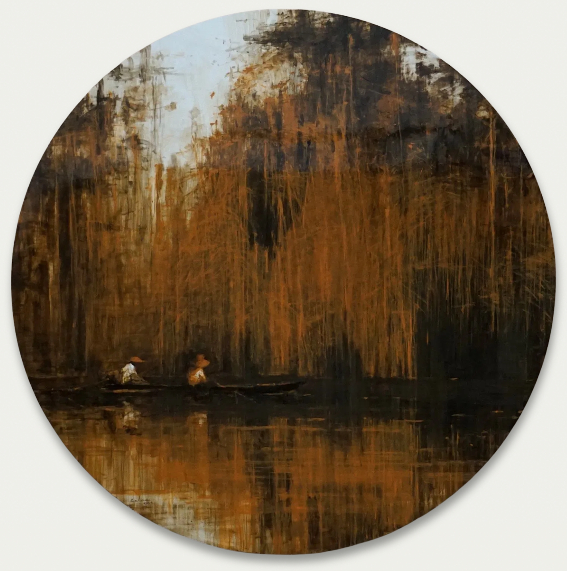 Iron Jungles n°10, taken from the “Jungle” series, is a painting by contemporary Spanish artist Calo Carratalá which is in the form of a tondo. It portrays a boat on the Amazon river, behind which a dense South American tropical forest flourishes.