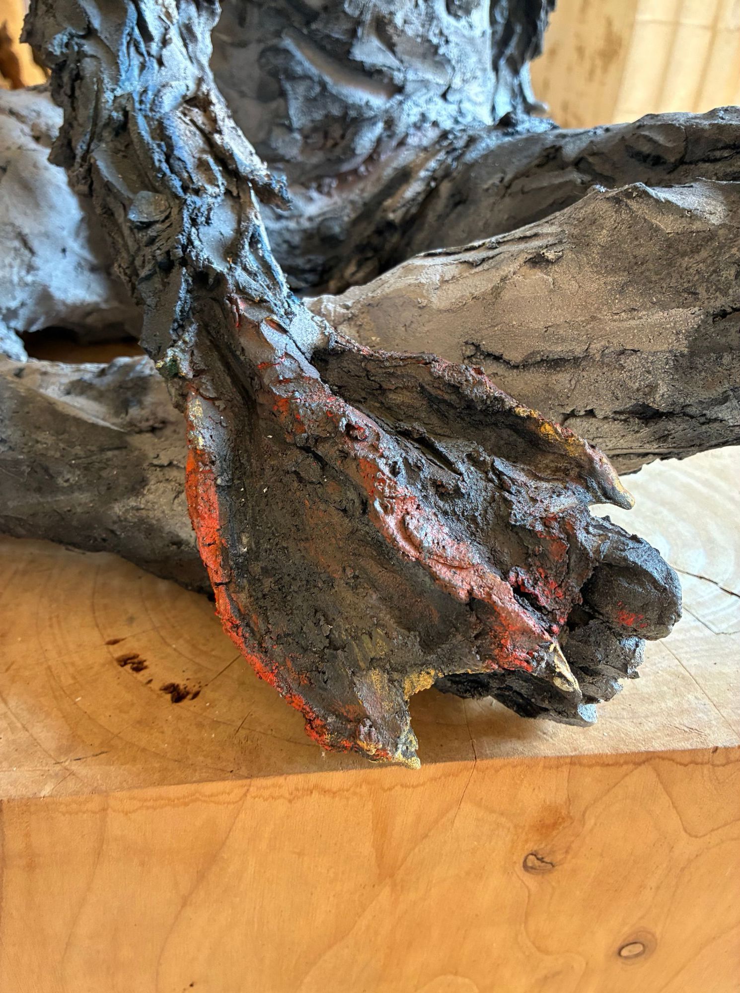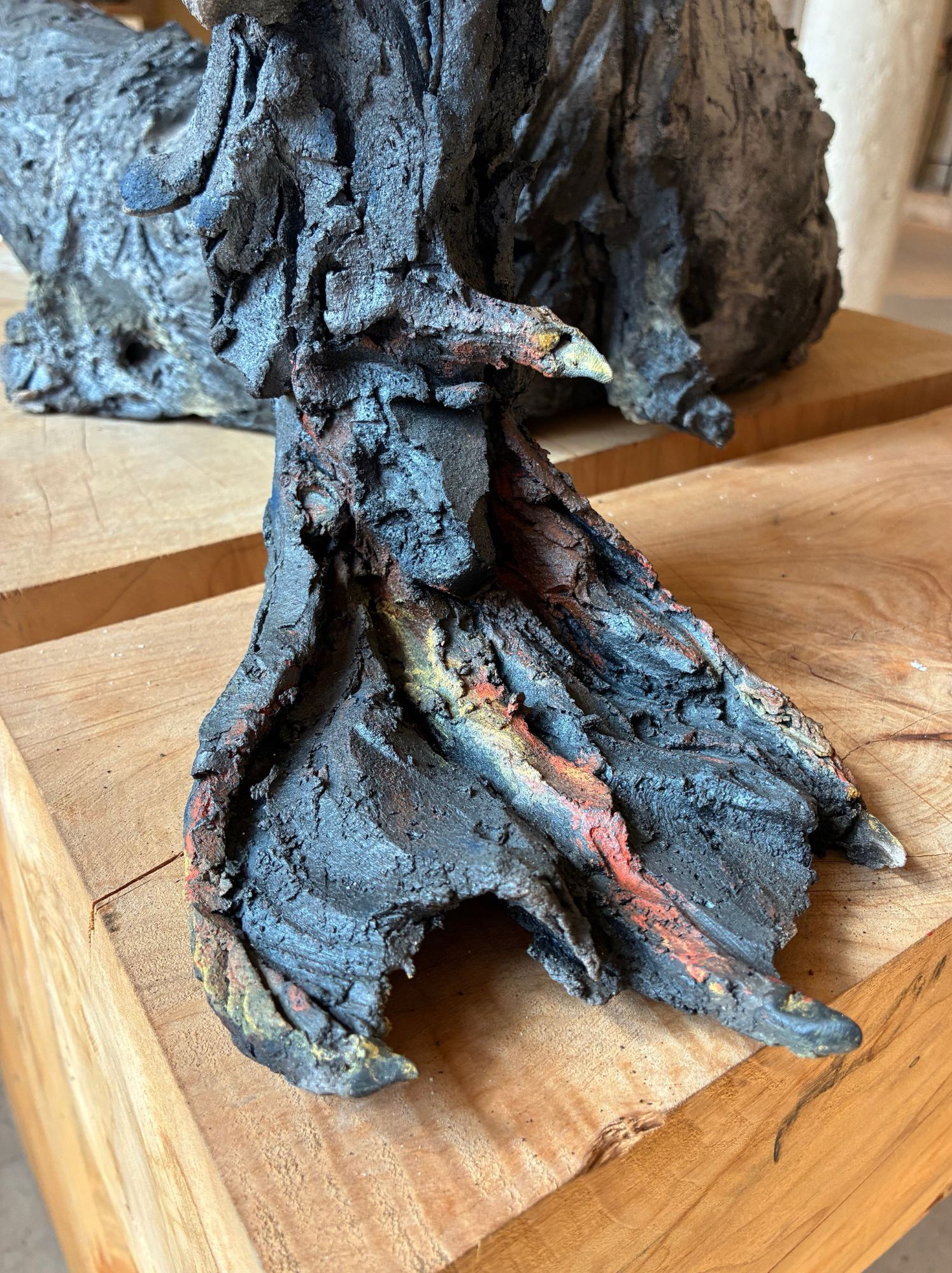 | Description | Smoke-fired stoneware sculpture, cypress wood base, pigment |