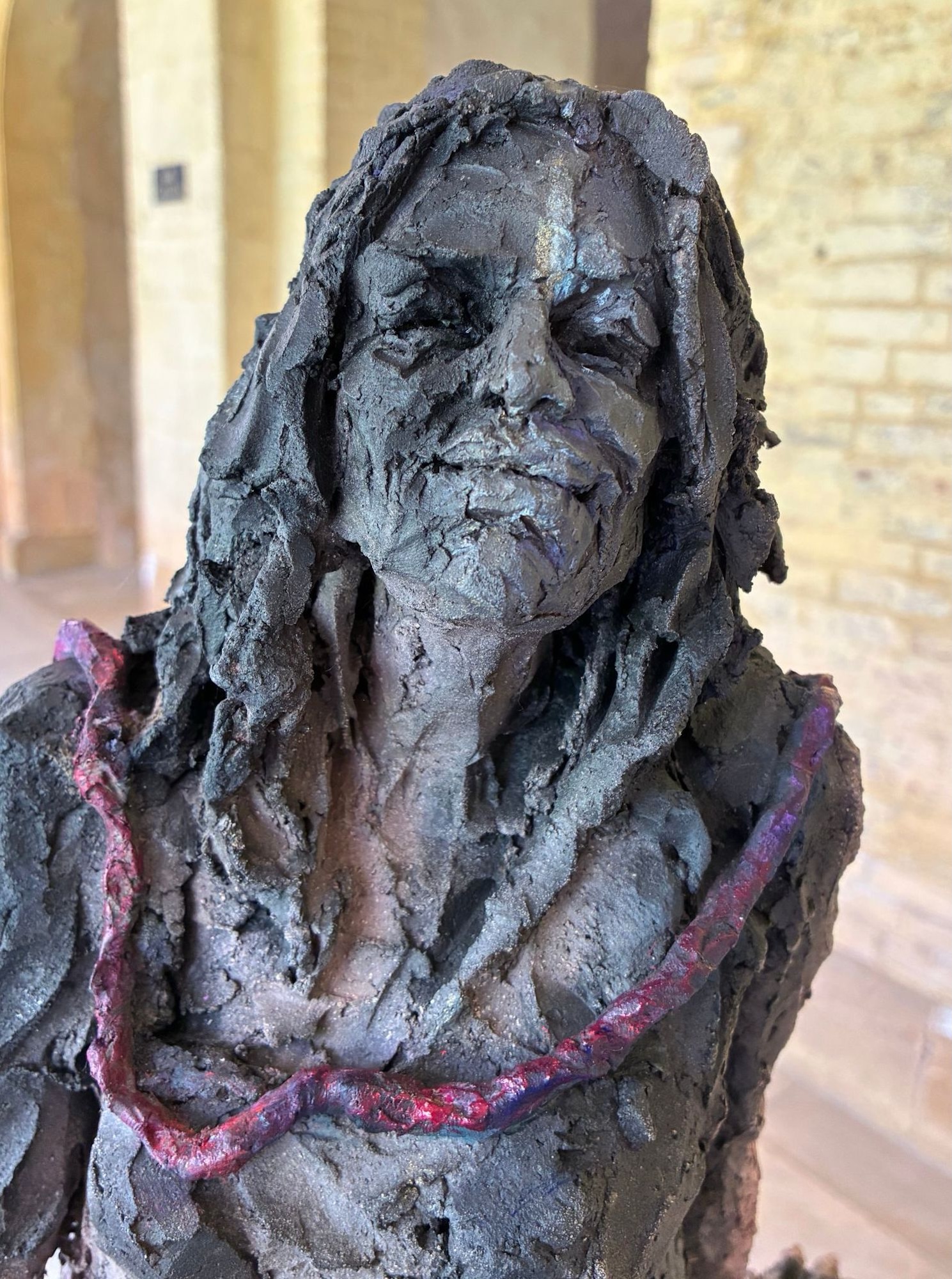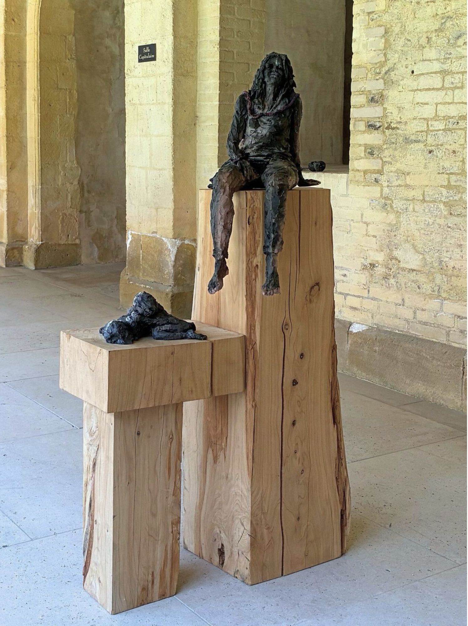 Je te me love (with Mélanie) is a smoke-fired stoneware sculpture by contemporary French artist Cécile Raynal. This sculpture is part of the ‘A l’enfant qui nous garde’ exhibition, created following an eight-week stay by the artist at a maternity hospital in Lyon. During the stay, she was inspired by medical staff and the patients. The model is a midwife with an umbilical cord wrapped around her body. This sculpture stands out in this exhibition as it highlights a part of the clinic’s daily life with an explicit reference to the organic aspect, juxtaposing the other artworks that deliver a more aesthetic side to motherhood.