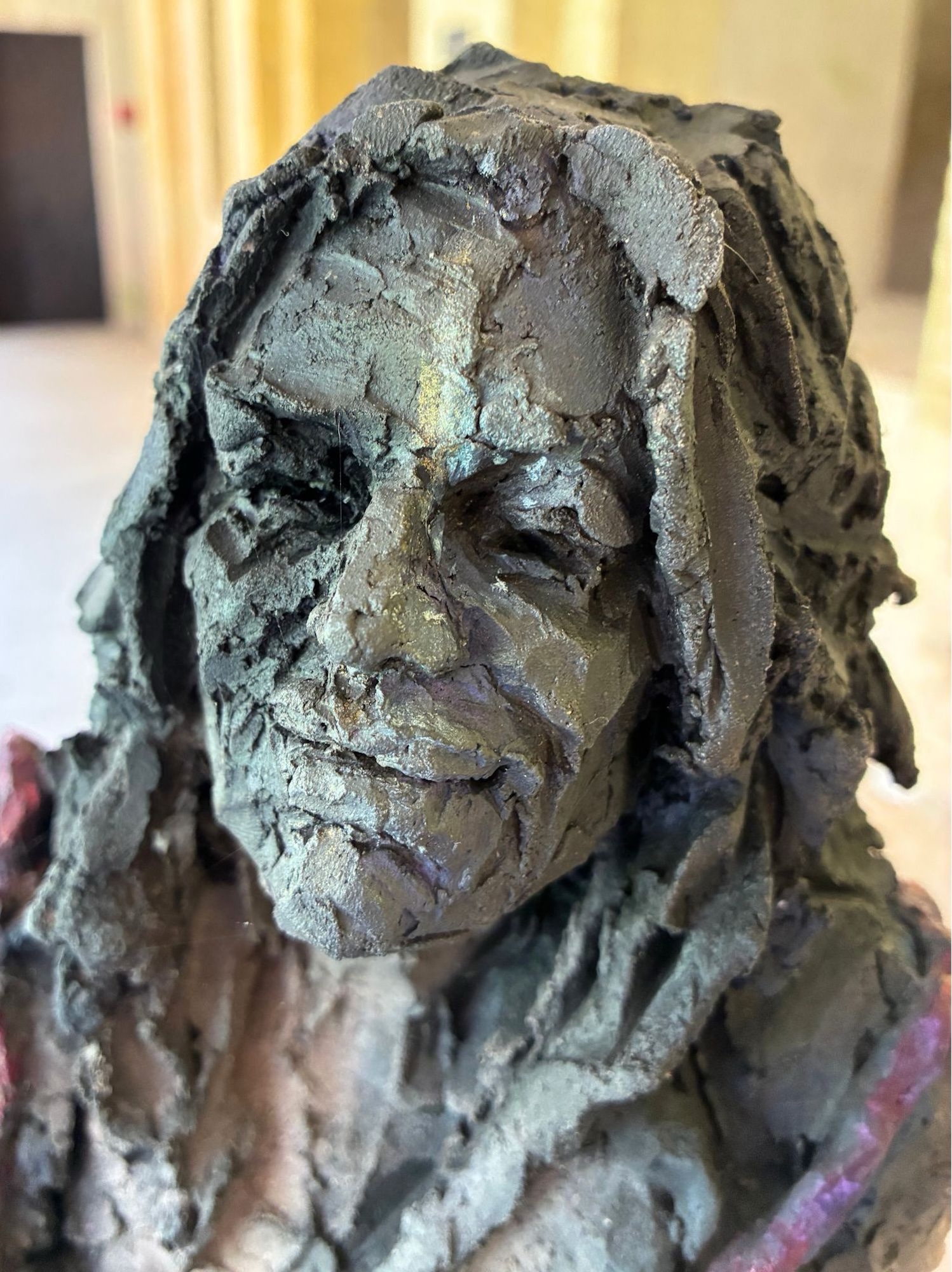 This portrait is part of a series of sculptures designed by the artist during an eight-week art residency at a private hospital: Natecia, in Lyon. During several stays, the artist immersed herself into maternity life, crisscrossing the corridors with her sketchbook or modelling there and then in clay the portraits of the people who she came across, health professionals as well as patients. These sessions, marked with sensitive exchanges, created clay figures caught within the very particular circumstances of these encounters: the expectation of a happy event, always tinged with uncertainty for the future parents; passion and tension, constantly linked in the healthcare teams work.