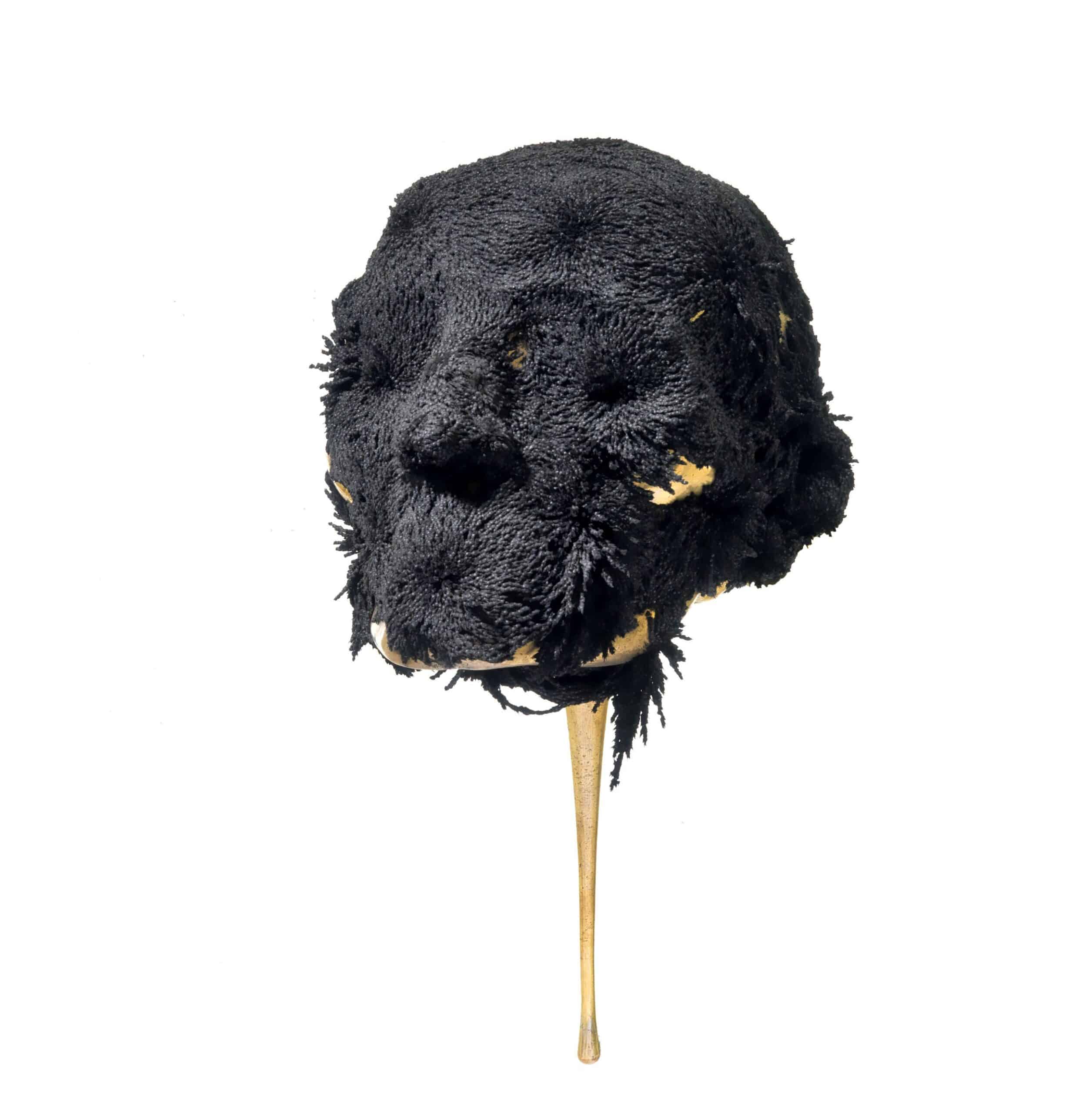 The skull is made of highly polished bronze, which confers to it a golden aspect with glints of light. The black material covering the skull is iron powder, which reacts magnetically with the surface of the sculpture thus changing its appearence. The iron powder come separately in a jar and can be placed on the sculpture by the collector.