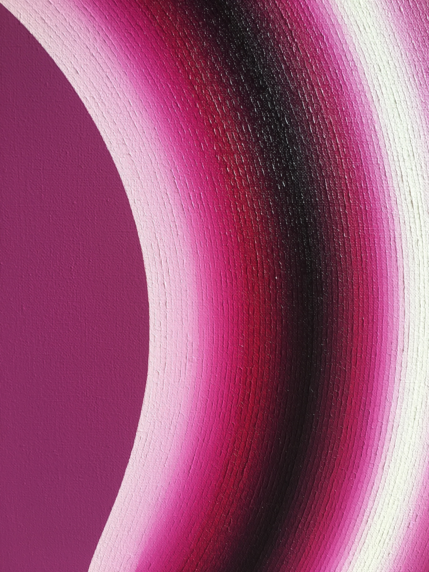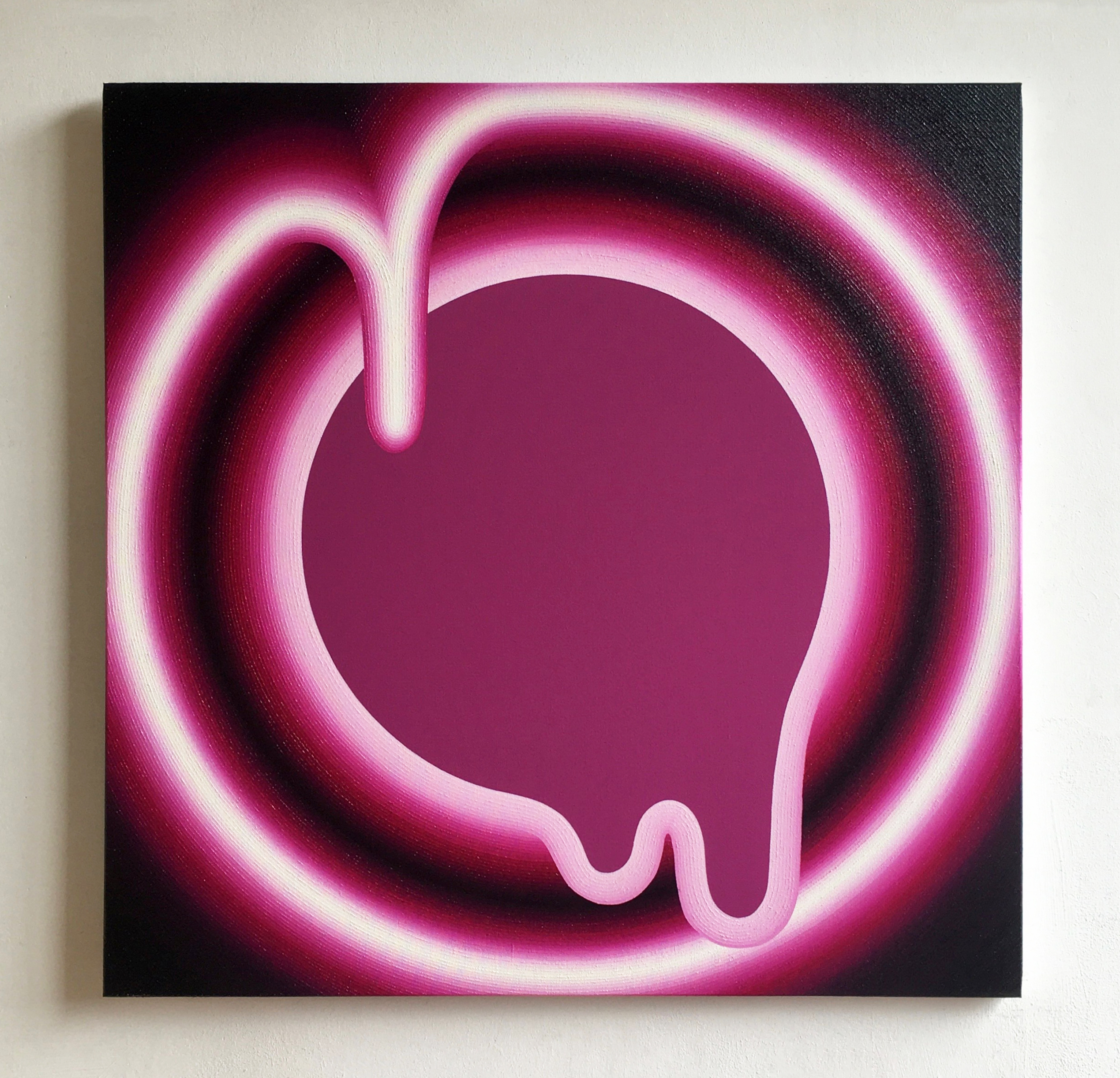 Mathieu Piffeteau works with all colours except red; for this painting, he chose to focus on magenta. In this painting, it is possible to appreciate a visual effect of luminous ‘blur’, an optical illusion created by the artist using a short gradation of colours. The viewer may have the impression that an artificial light, such as neon or a lightbox, is illuminating the painting.