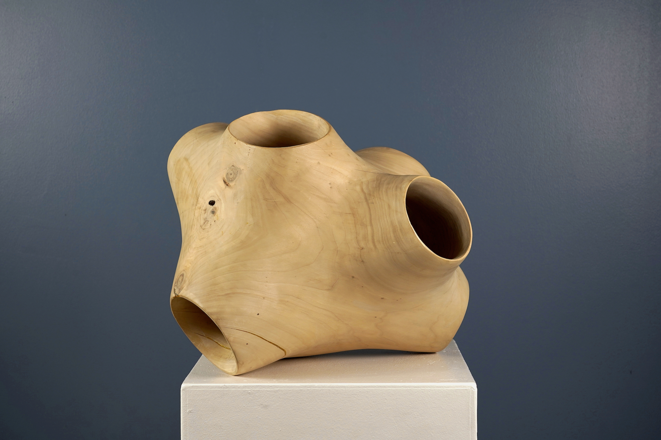 This sculpture is made from wood, a material the artist favours for its naturalness, texture, smell and the way it feels to the touch. The sculptor uses only local woods and chooses them on the basis of their size, which is where the sculptural potential lies. The artist approaches this living material with great respect. He imposes his will on the material to sculpt it, but at the same time, the wood itself directs his work with its imperfections, shapes, knots, and blackened elements.