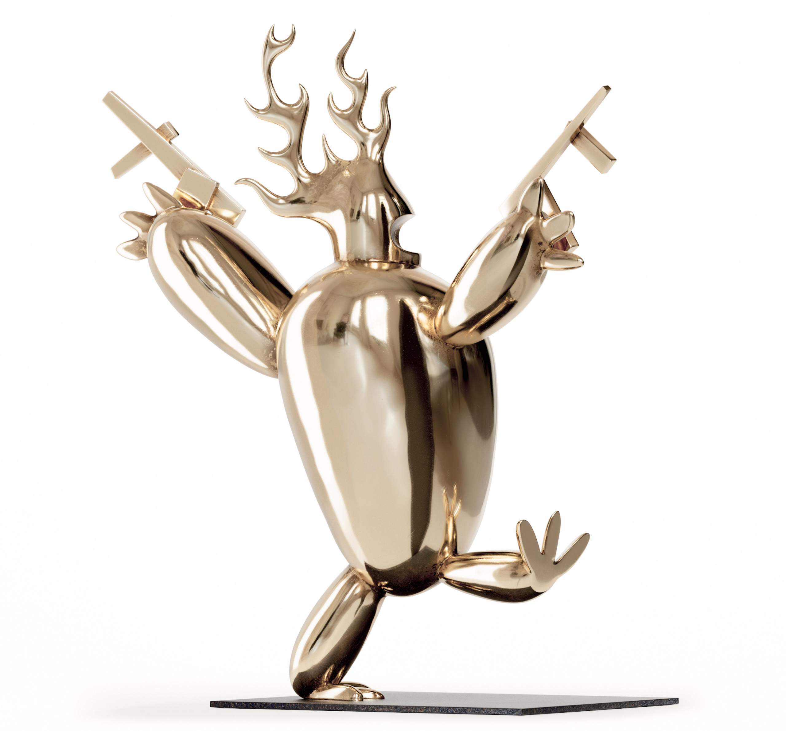 Marcelo Burgos’ artistic world is deeply rooted in childhood: children’s dreams and nightmares, populated by fantastic creatures, demons, monsters and dragons, provide the artist with his primary source of inspiration. His series The Monsters draws as much from children’s drawings, cartoons and manga as from African and Toltec sculpture. Far from being frightening, these creatures, with their golden surface, are reminiscent of statues of deities that provide both protection and comfort.
