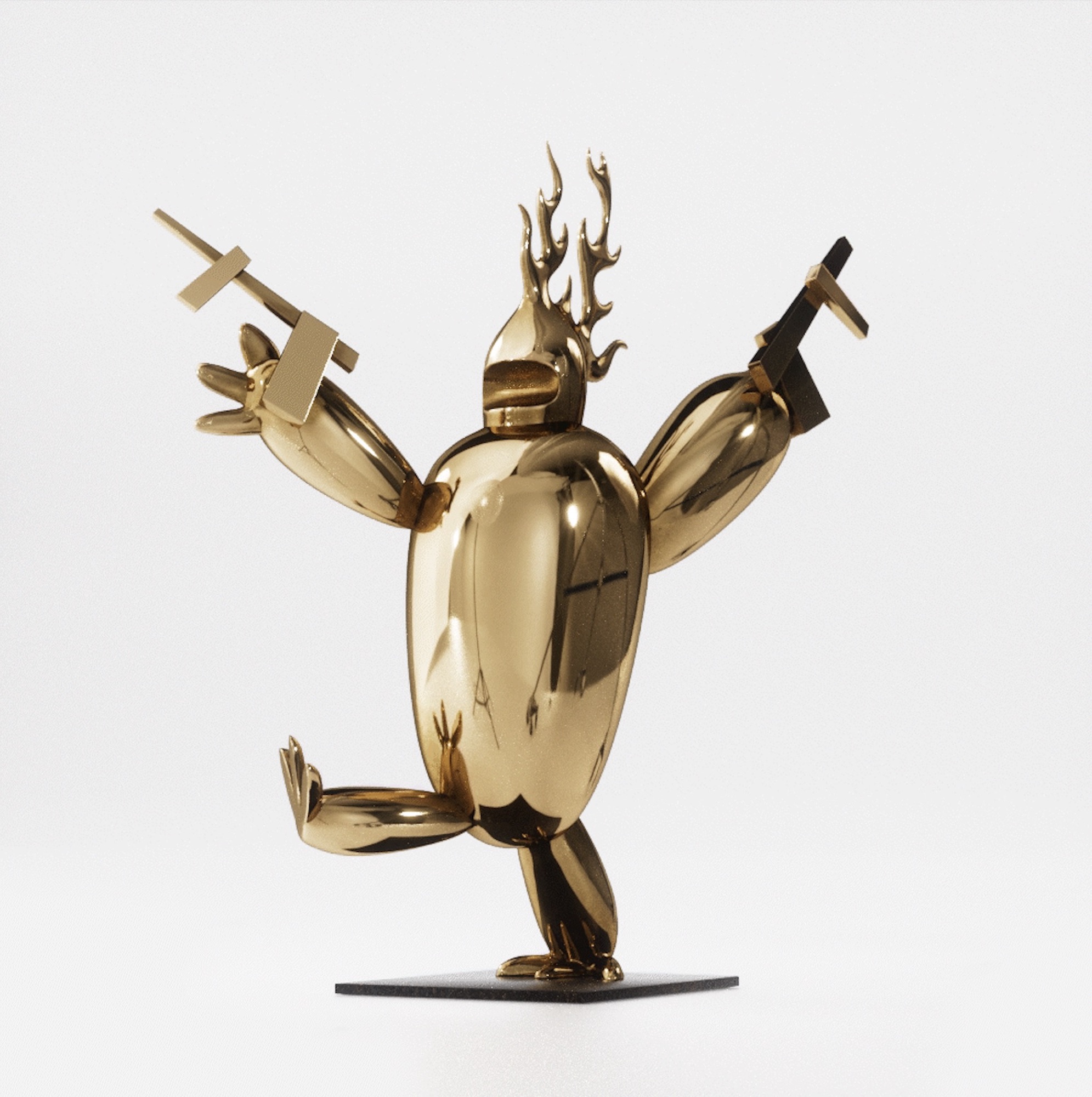 King Thug is a bronze sculpture by contemporary Argentinian artist Marcelo Martin Burgos. The sculpture depicts a fantastical, humanoid creature with a flaming head, gripping two pistols.