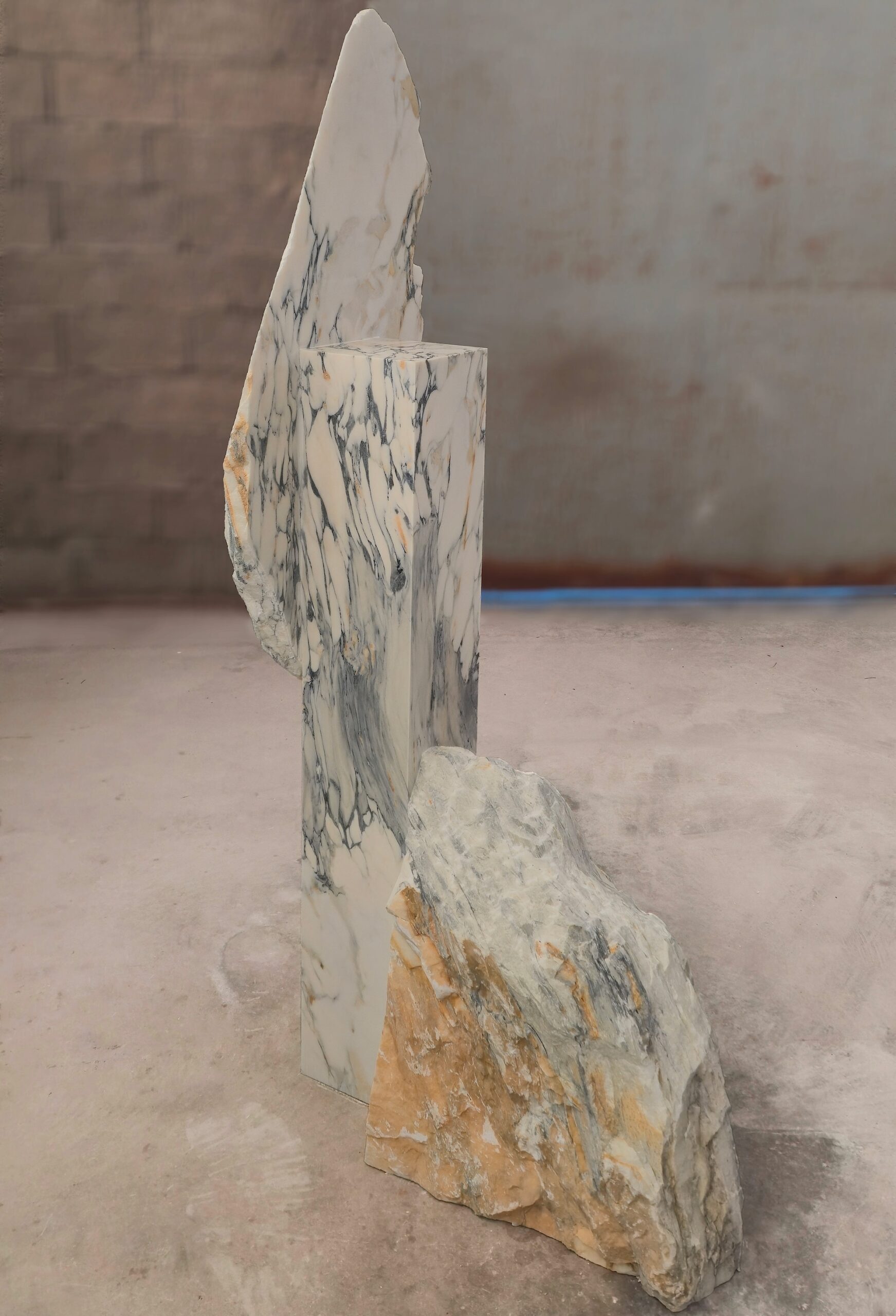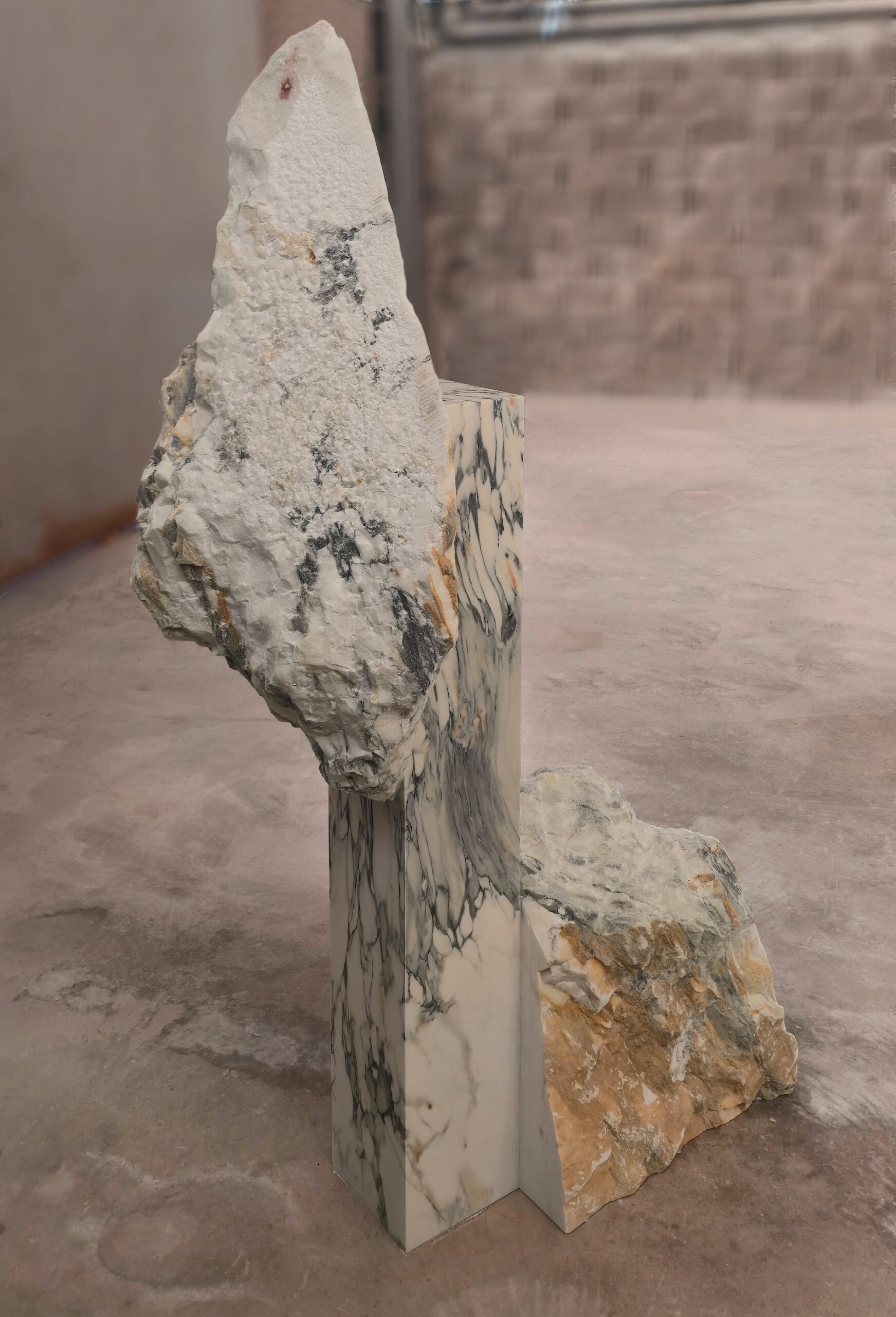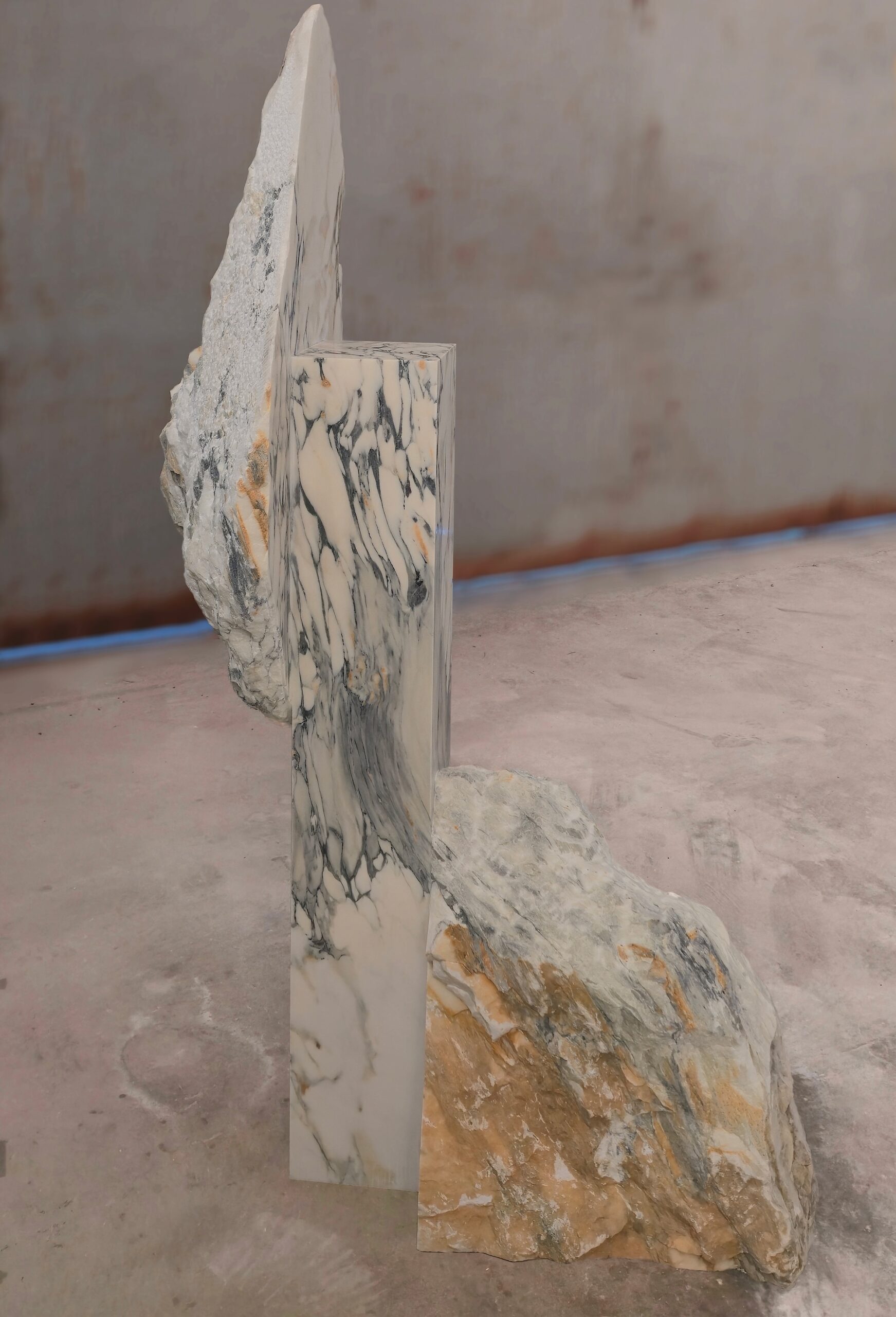 Each artwork in the “Korai” series is identical in shape, but made from a different exceptional marble: Cipollino d’Elbe, Fantastico d’Arni, Rosso Collemandina, Portoro, Bardiglio, the sculptural marble from Michelangelo’s quarry… These marbles are typical of the period of imperial Roman architecture. Fiordipesco marble is also known as Fior di Pesco marble. Its name comes from the Italian words meaning “peach blossom,” referring to its soft pink and grey tones. This marble comes from the Apuan Alps, a mountain range in northwestern Tuscany, an area famous for its historic stone quarries used since Roman times. This elegant and rare marble has been used historically in classical architecture and decorative interiors, appreciated for its refined color palette and natural movement.