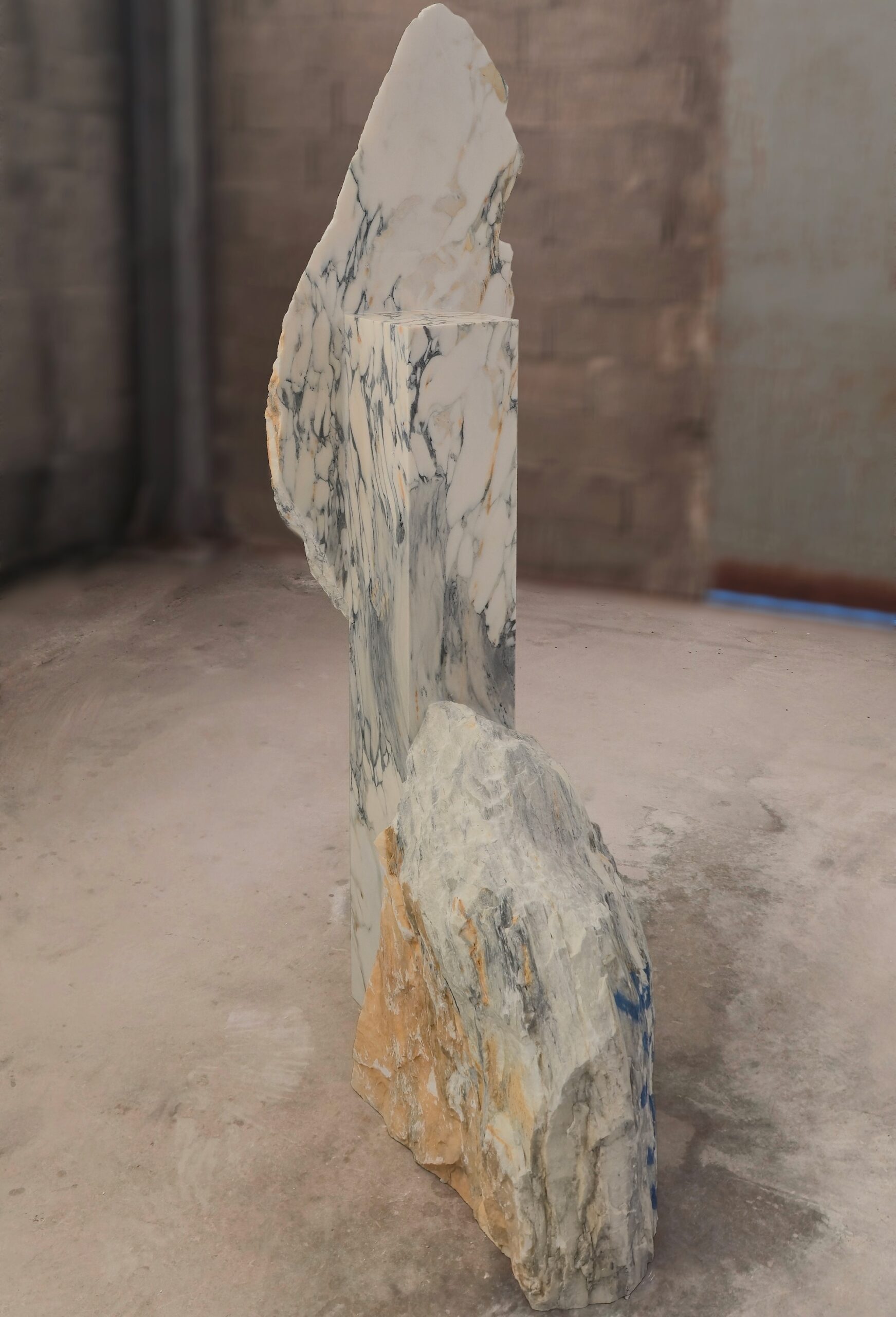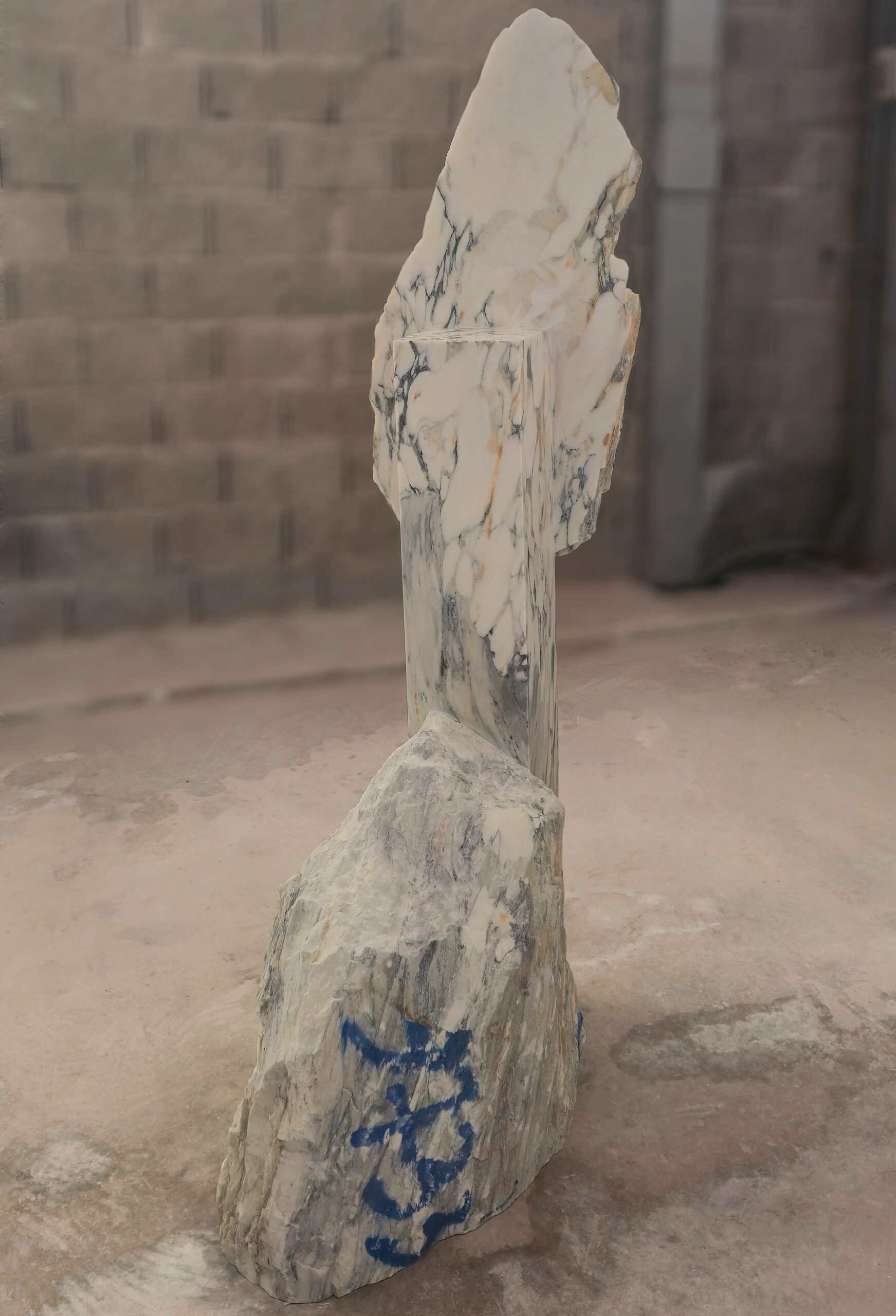 The artist selects the rocks that fascinate him, right there in the quarries, from among the extracted fragments. Providing them with a base, he positions them vertically and then sets about making his own mark on the surface of the stone, using rotary cutters. There is a relationship of collaboration between the artist and the material: “It is not a case of man on one side and the world on the other, […] the relationship between me, who is sculpting, and the material itself, is a tussle between two parts of the world, engaging in a show of force.”