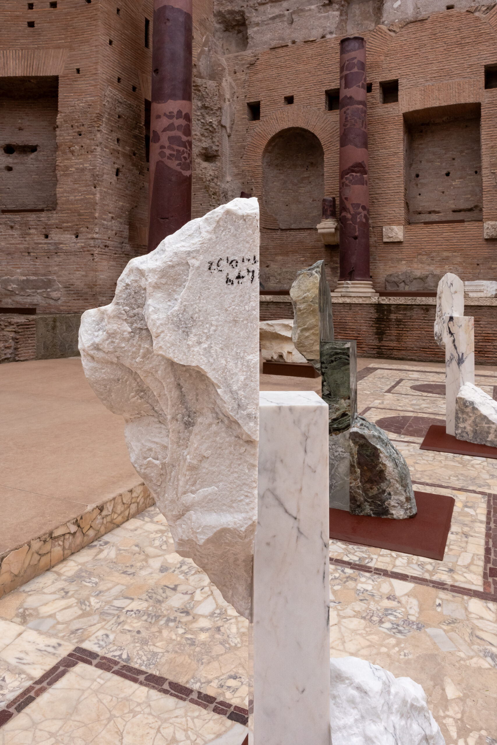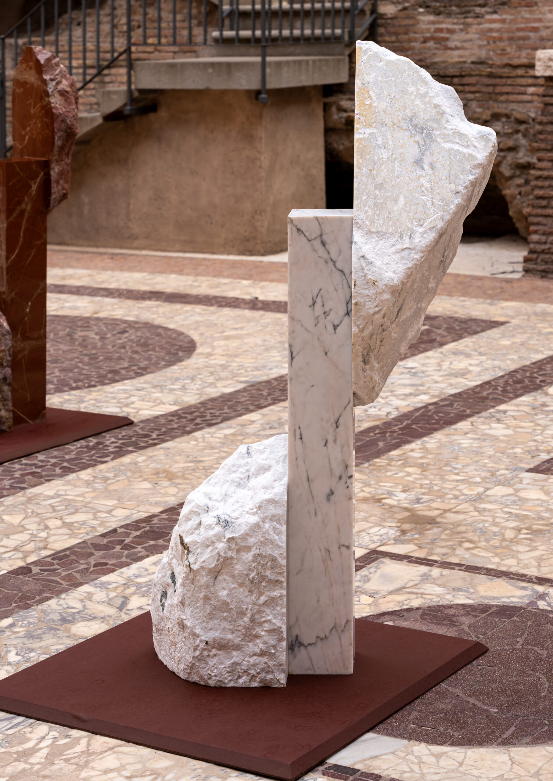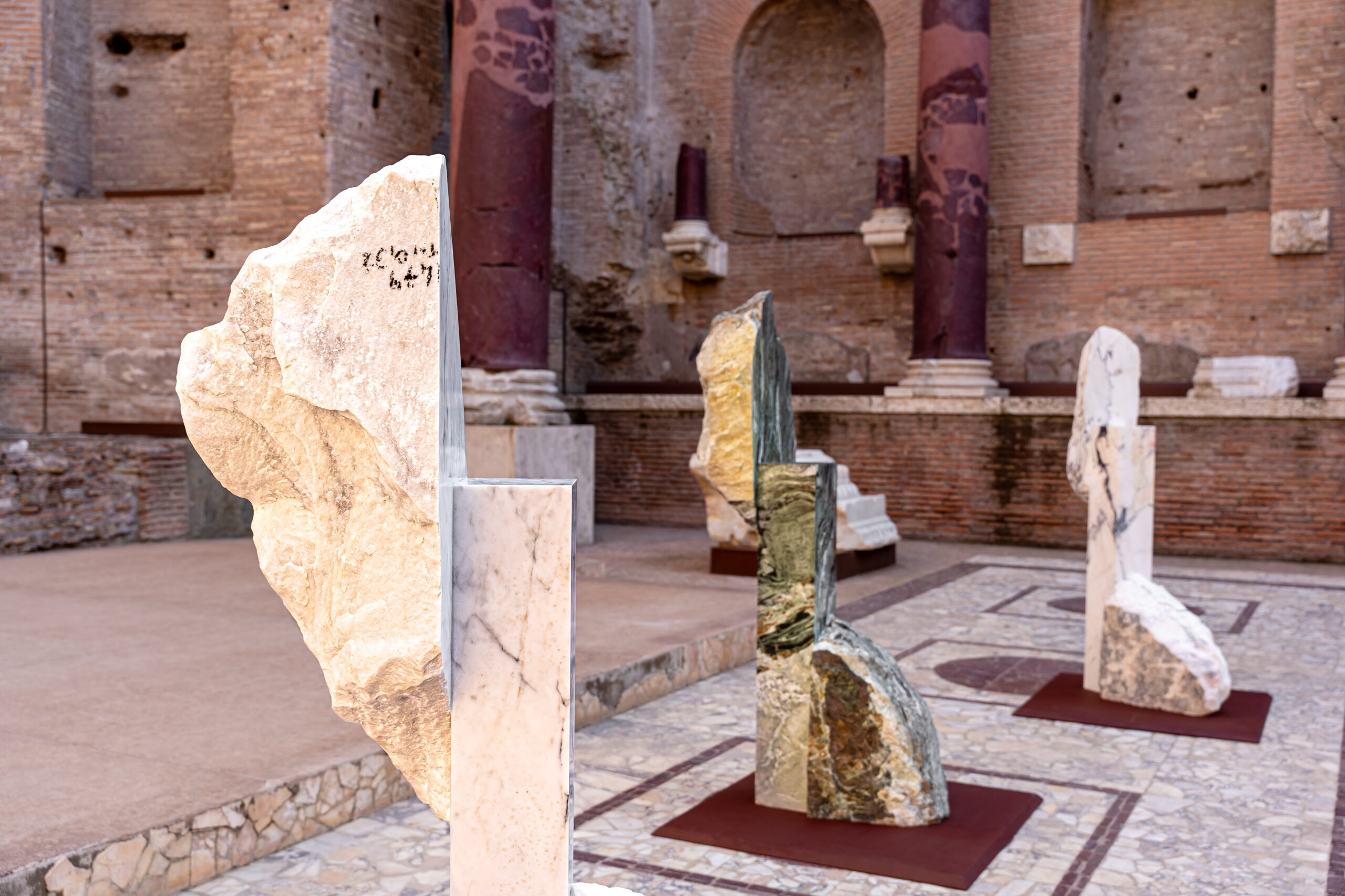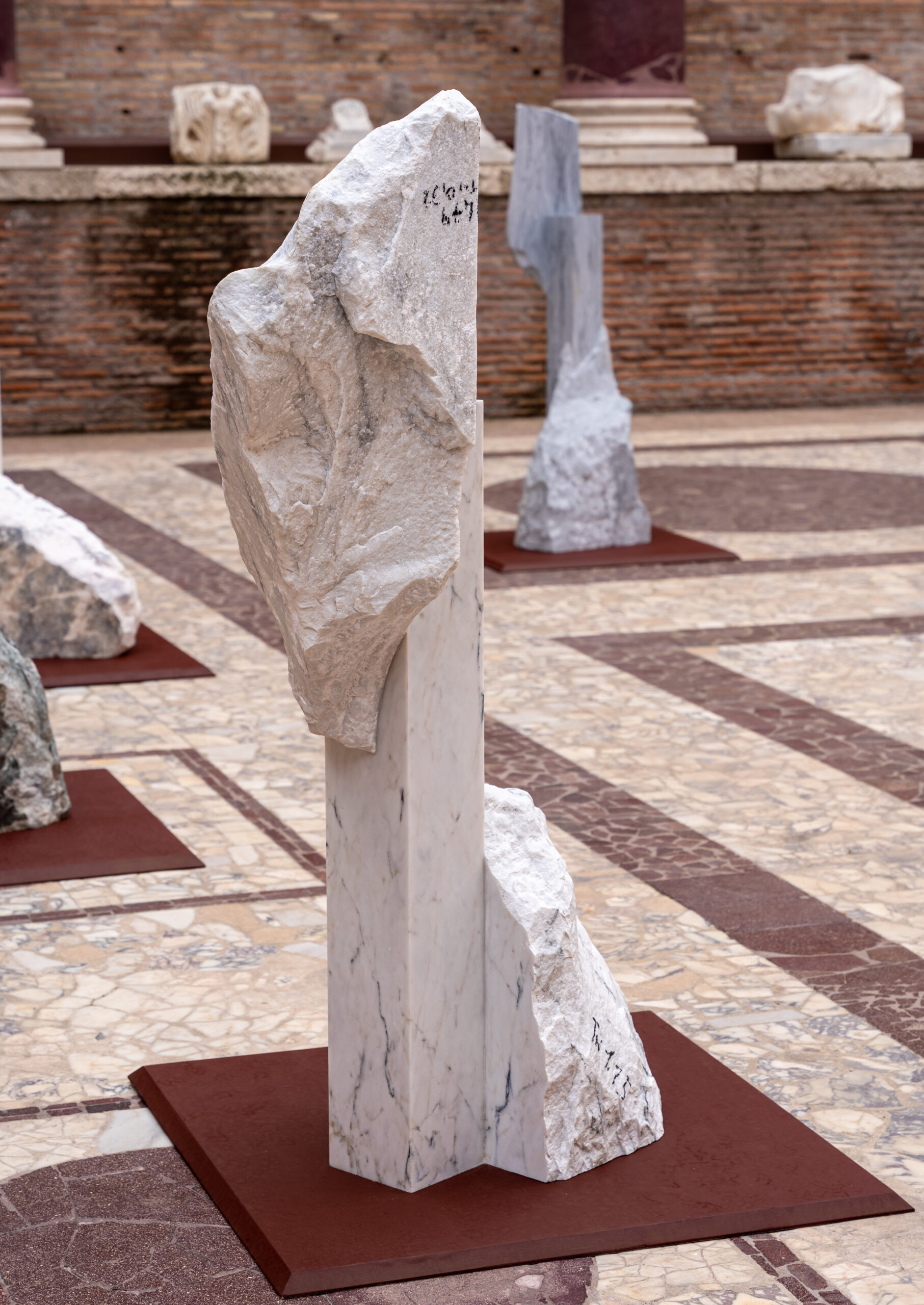 Each artwork in the “Korai” series is identical in shape, but made from a different exceptional marble: Cipollino d’Elbe, Fantastico d’Arni, Rosso Collemandina, Portoro, Bardiglio, the sculptural marble from Michelangelo’s quarry… These marbles are typical of the period of imperial Roman architecture, in perfect harmony with the essence of the place that will house them for the duration of the exhibition: the Temple of Venus and Rome, an immense sacred building inaugurated in 136 AD.