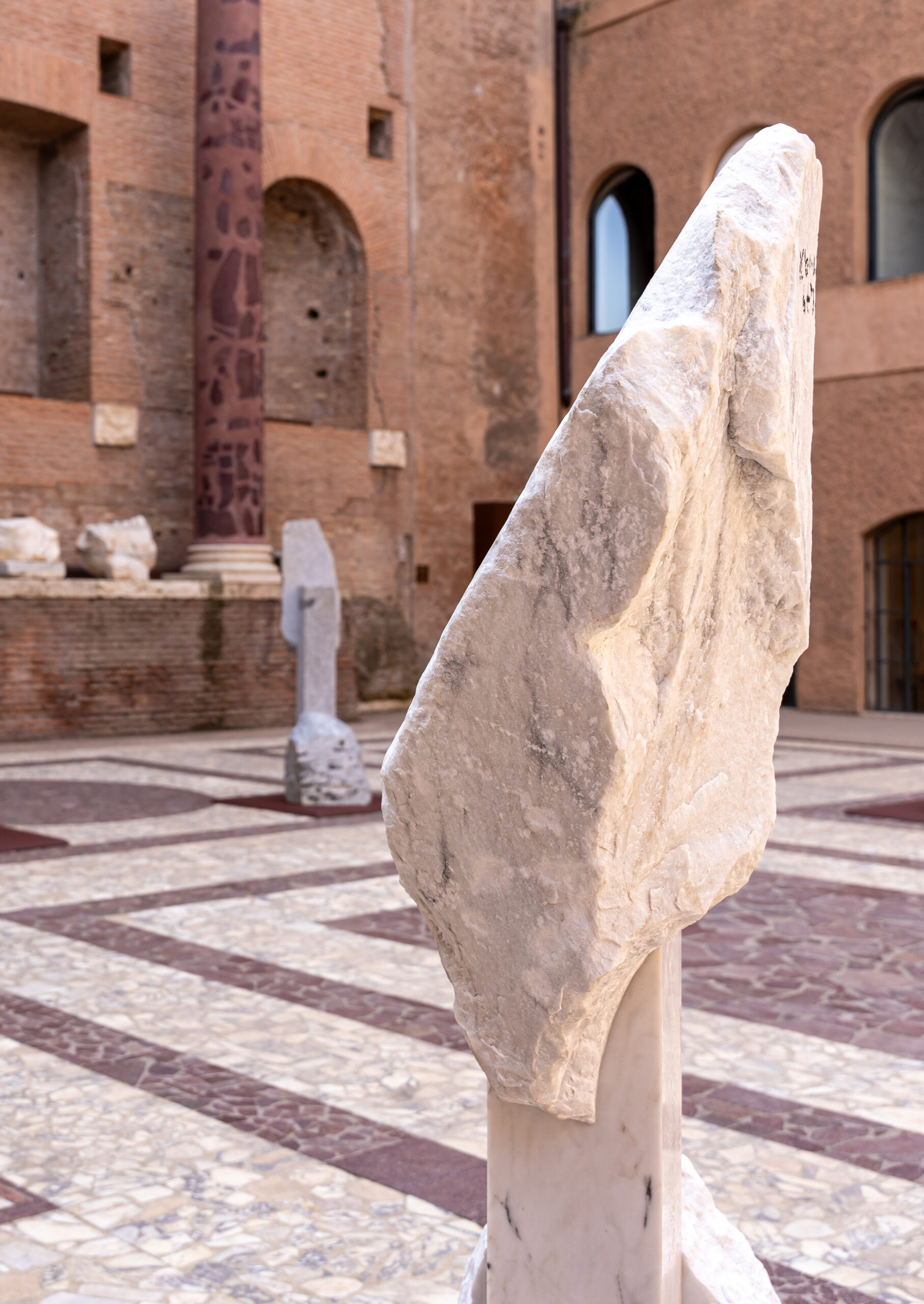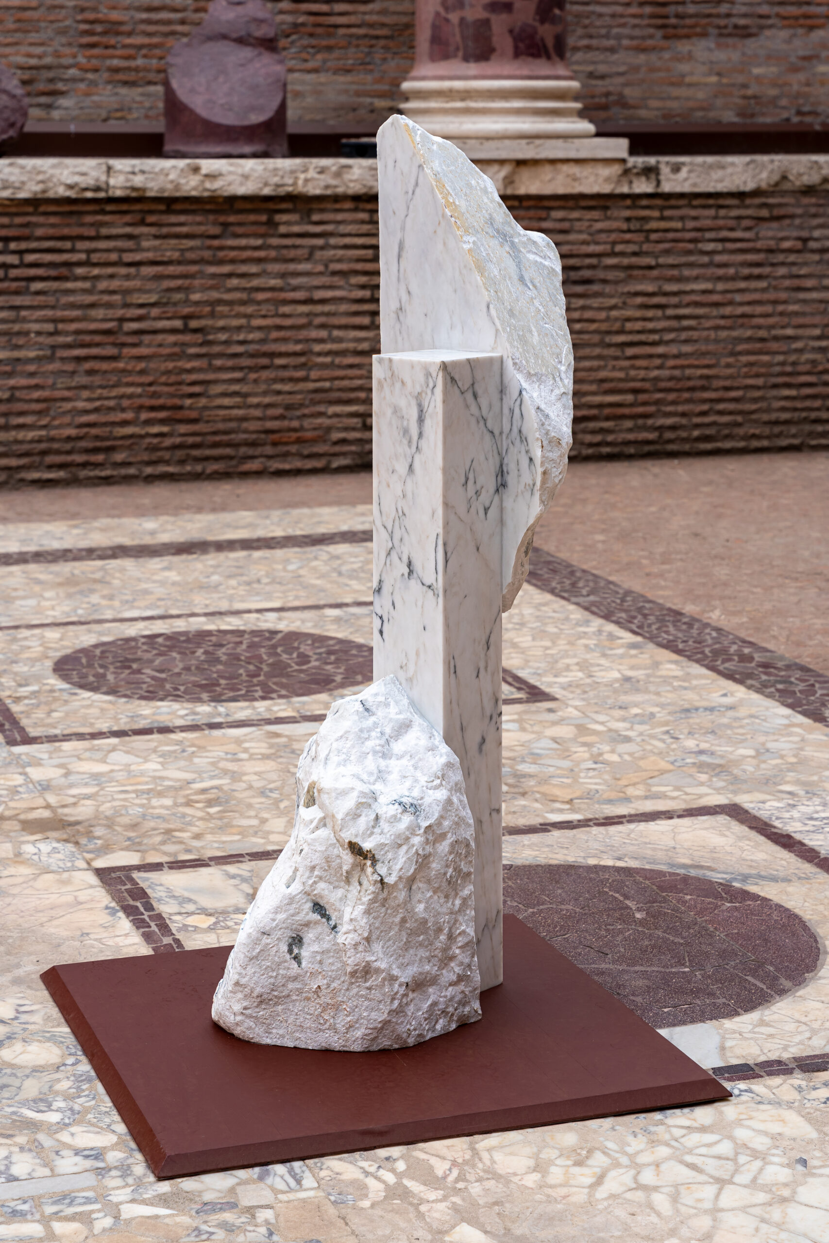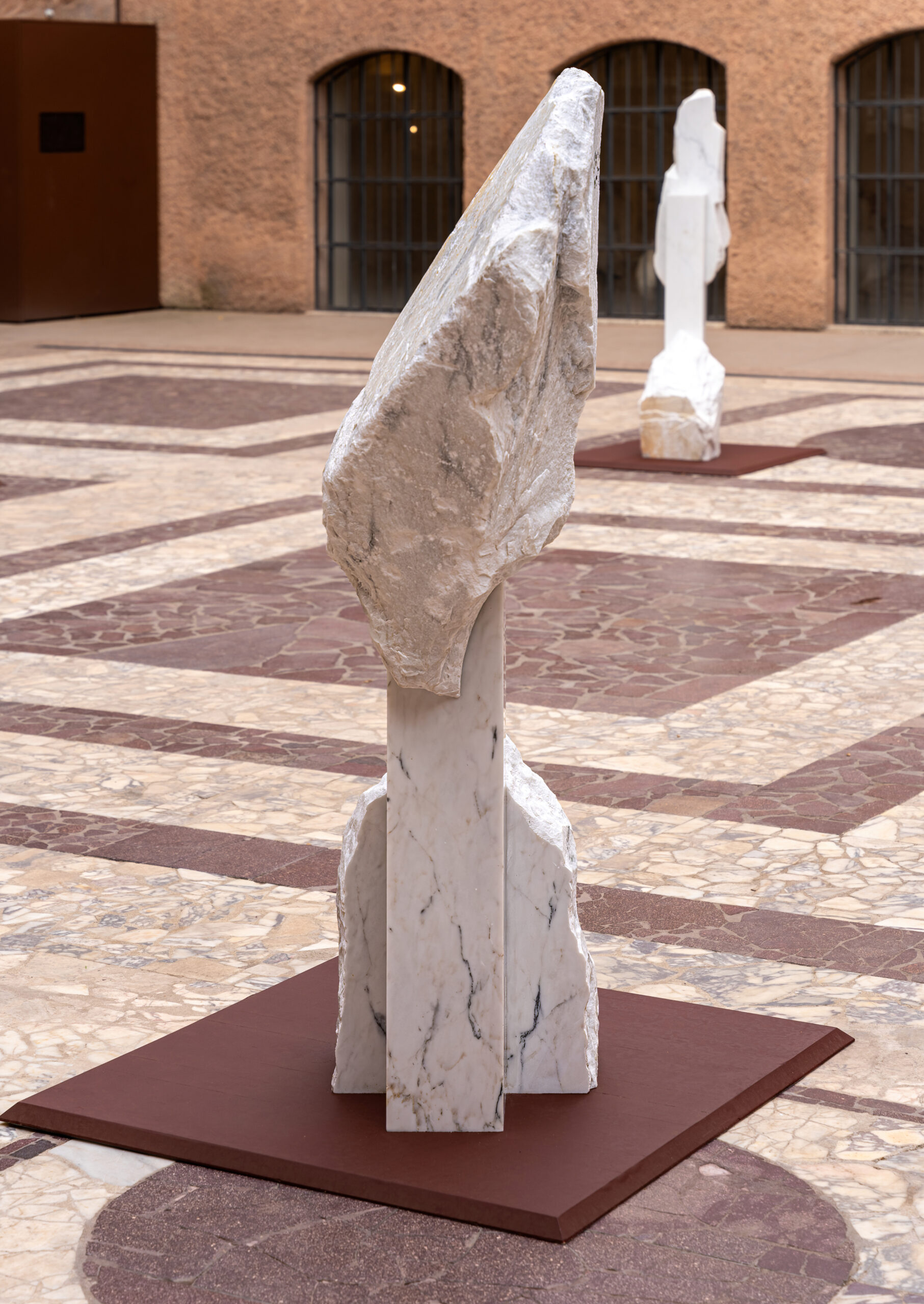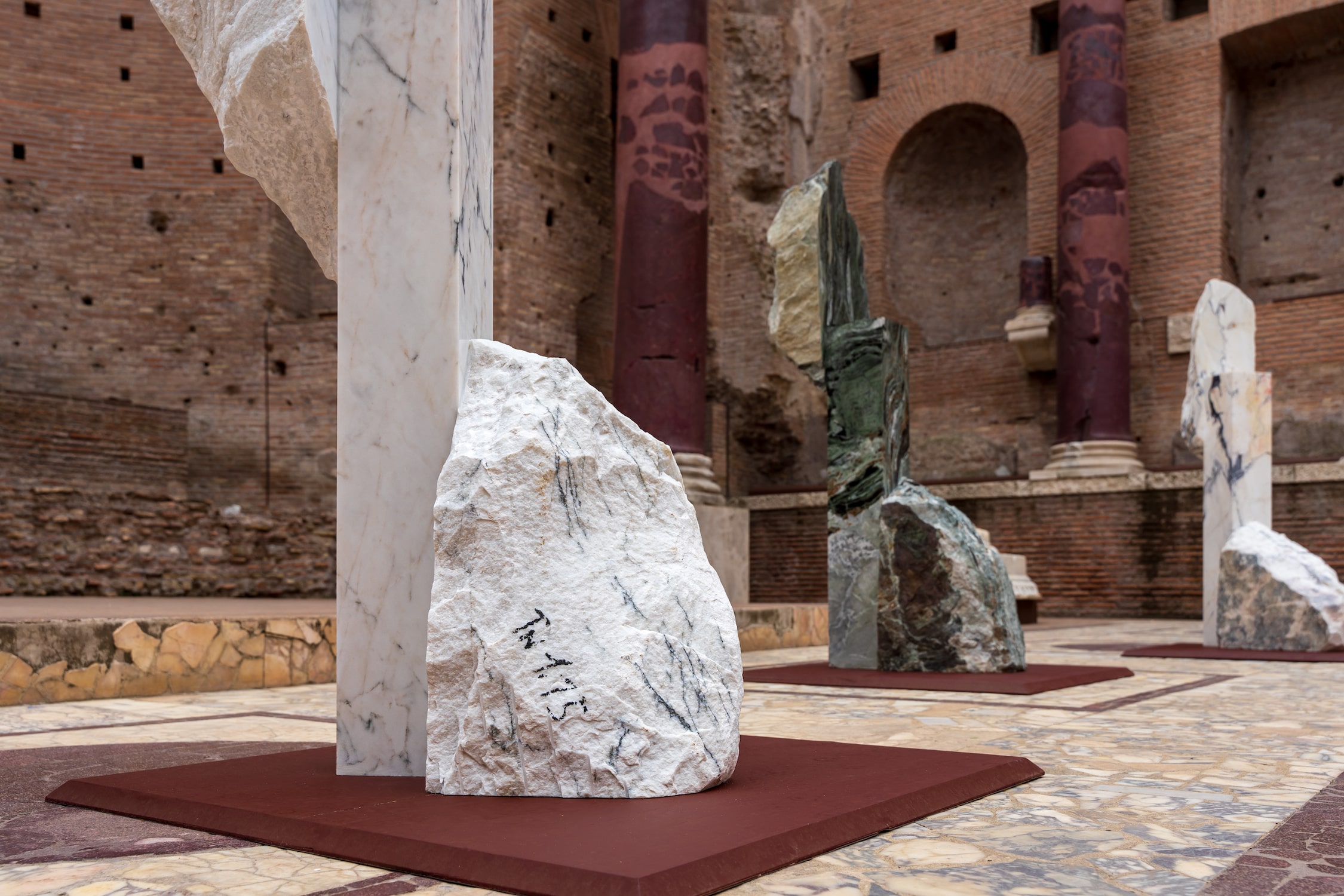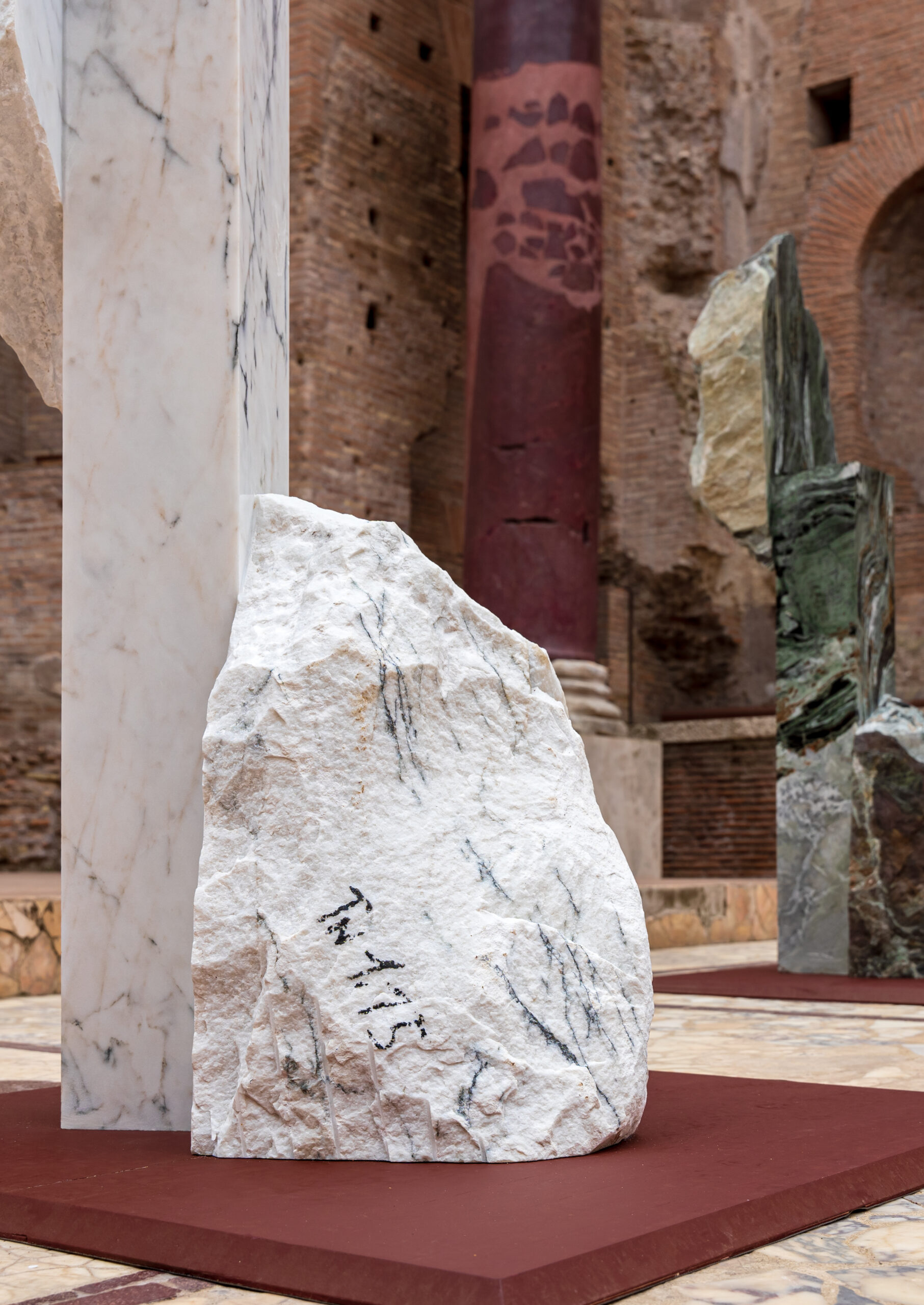 Each artwork in the “Korai” series is identical in shape, but made from a different exceptional marble: Cipollino d’Elbe, Fantastico d’Arni, Rosso Collemandina, Portoro, Bardiglio, the sculptural marble from Michelangelo’s quarry… These marbles are typical of the period of imperial Roman architecture, in perfect harmony with the essence of the place that will house them for the duration of the exhibition: the Temple of Venus and Rome, an immense sacred building inaugurated in 136 AD.