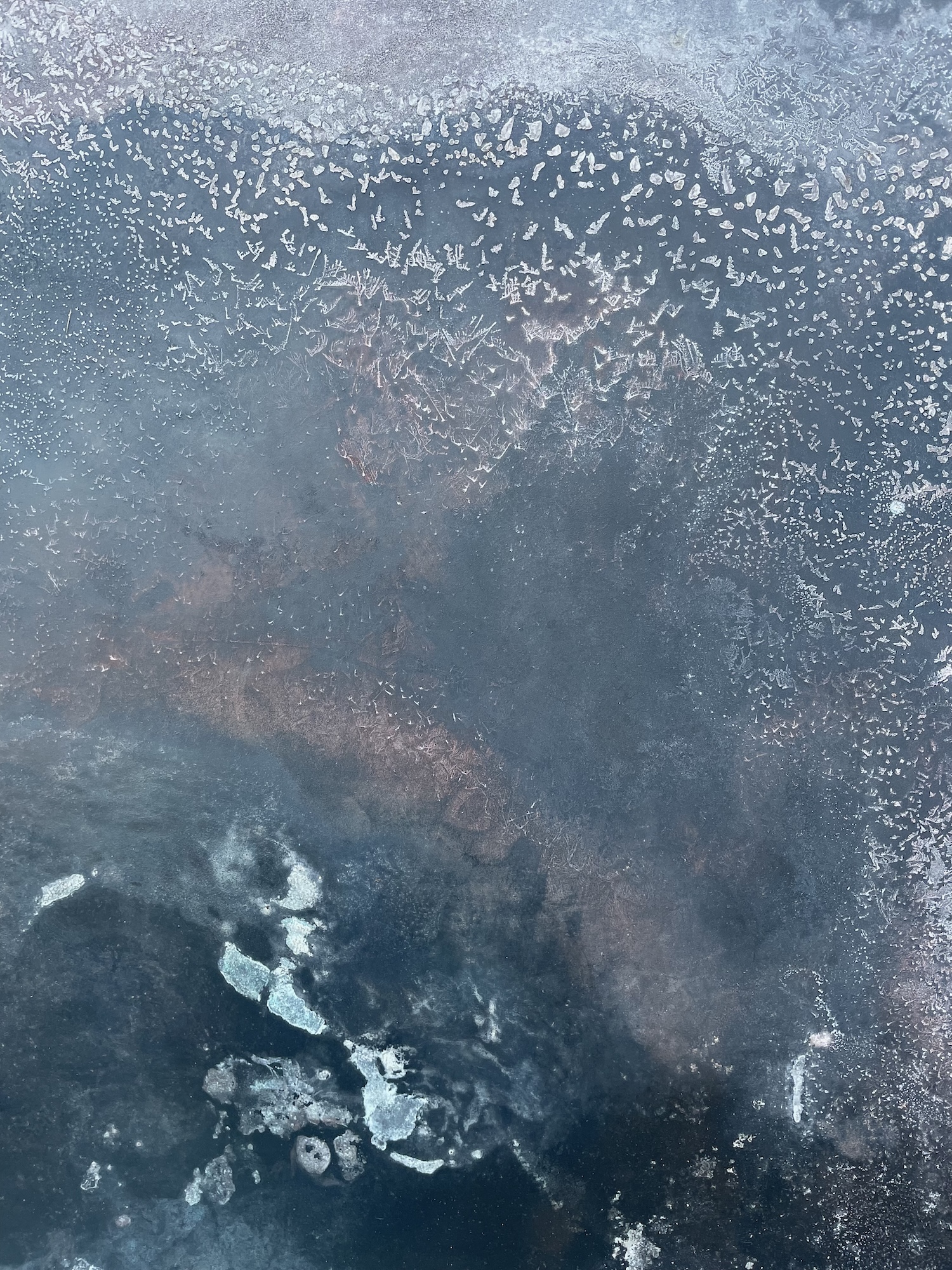 Land and Sea of Lanzarote is an artwork by French contemporary artist Frédérique Domergue, crafted with oxidized zinc and bronze leaves on honeycomb aluminum panel.