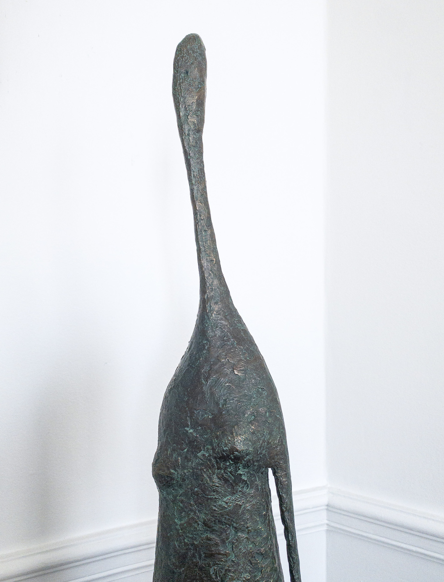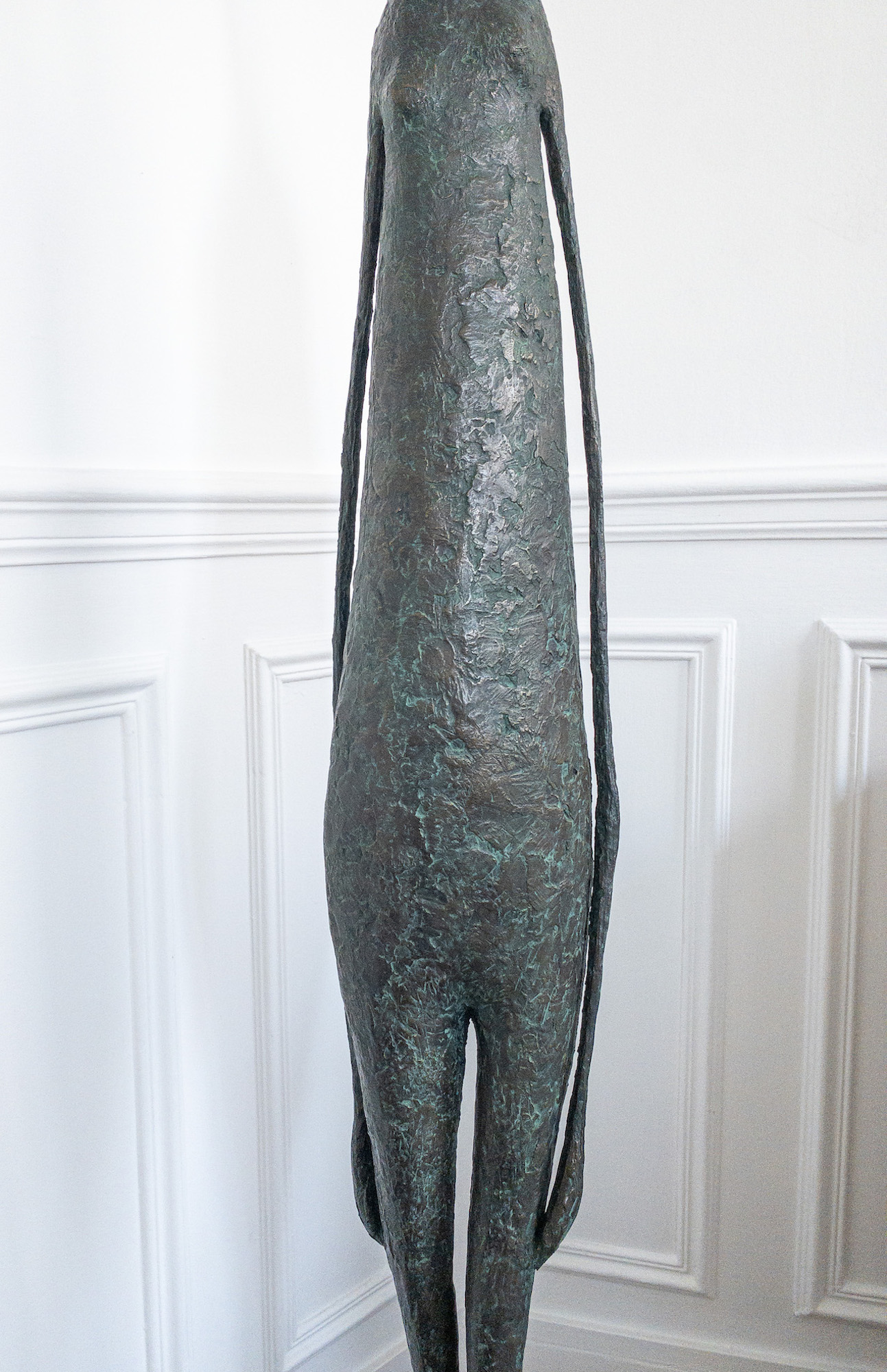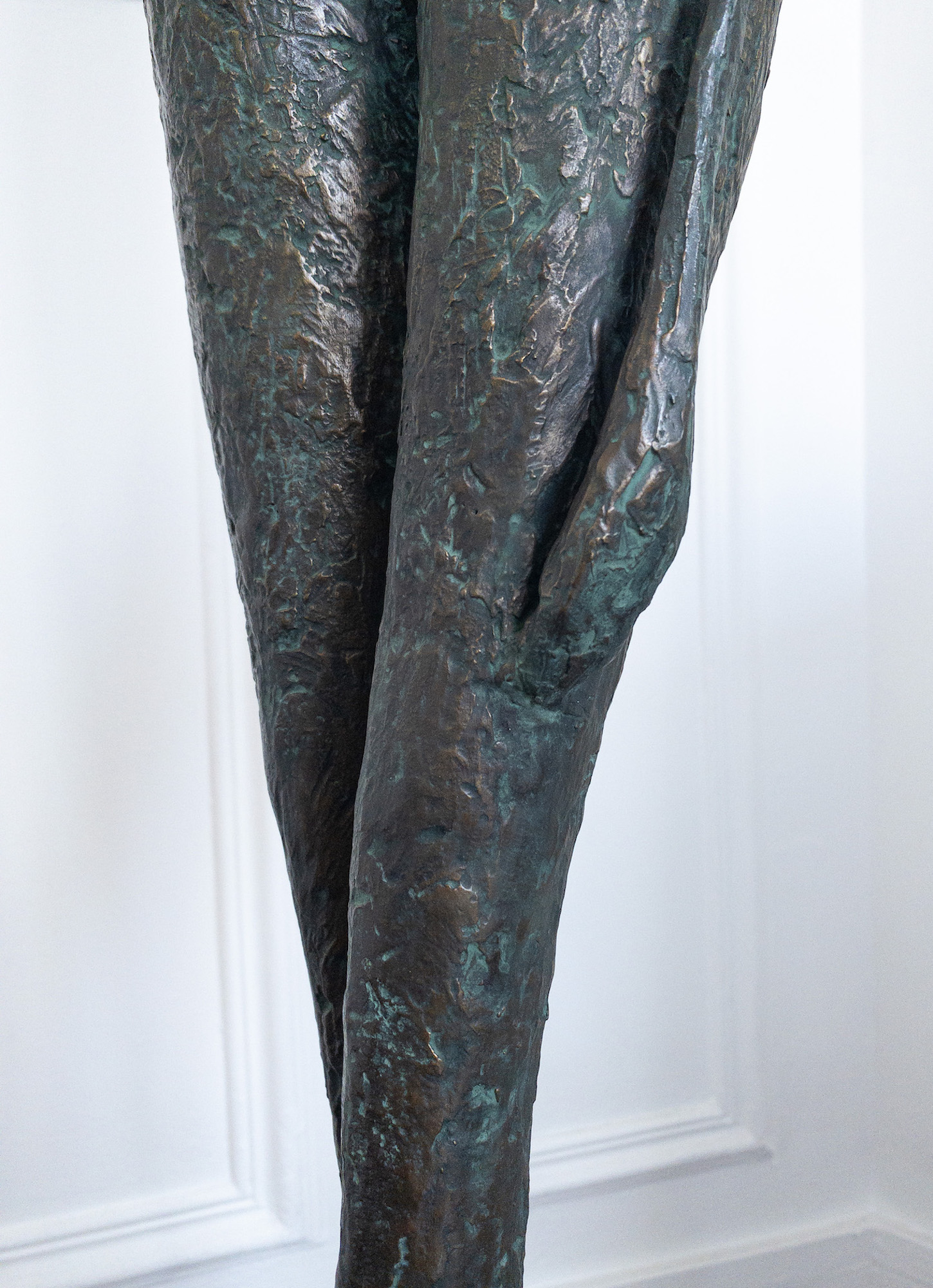 This figurative bronze sculpture depicts the slender silhouette of a woman standing upright. Pierre Yermia likes to strike a balance between strength and fragility: this sculpture is both deeply rooted in the ground and rises in a slow movement towards the light. The proportions of this sculpture are astonishing: the forms are elongated, the long, fragile limbs along the body contrast with the woman’s more massive torso and pelvis, and her head, reduced to its essentials, rests on a long, slender neck.