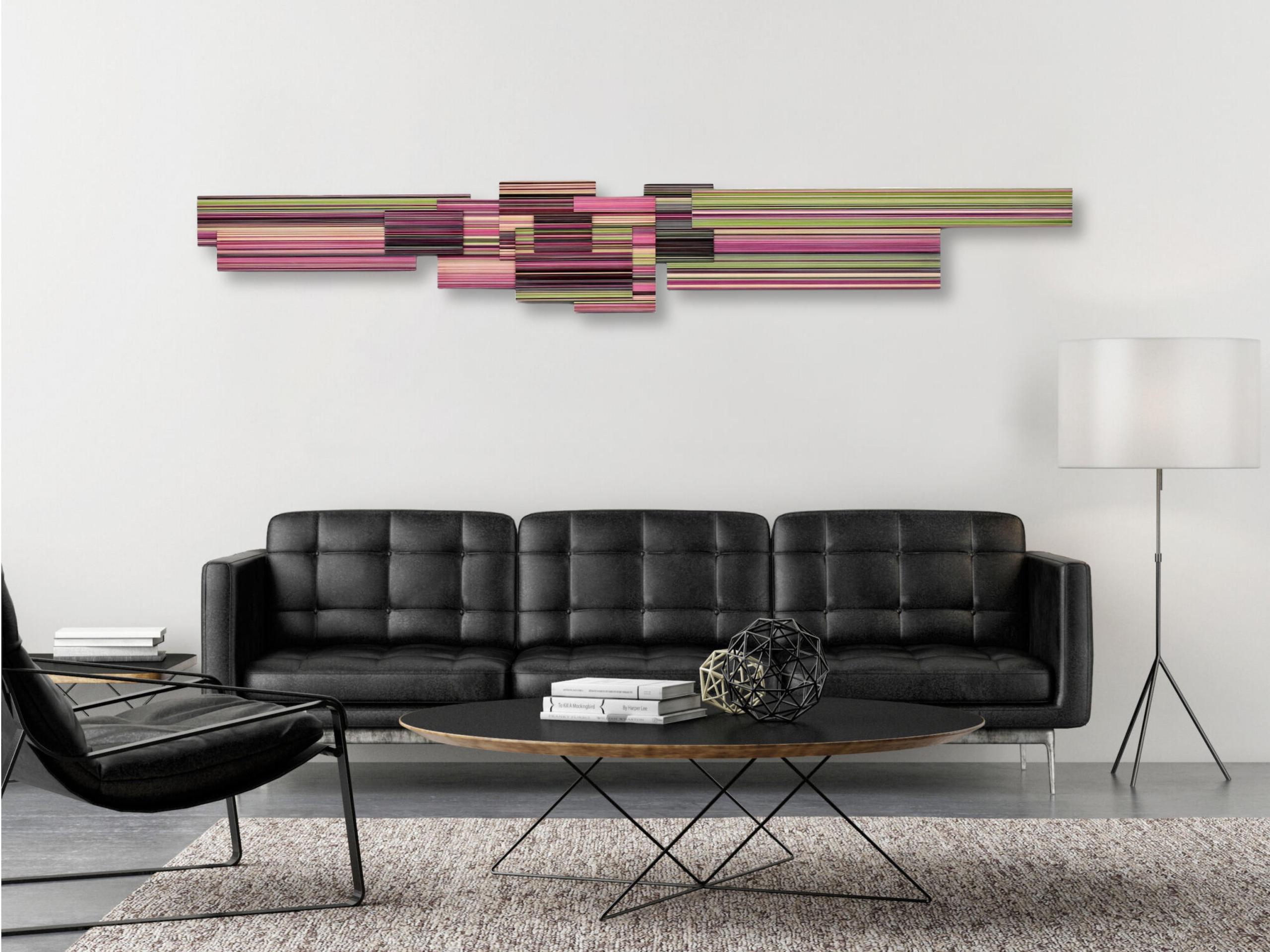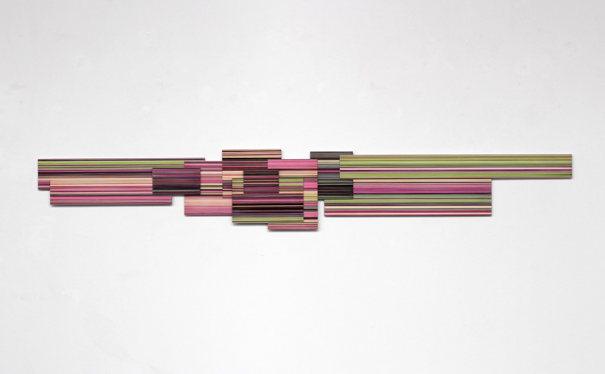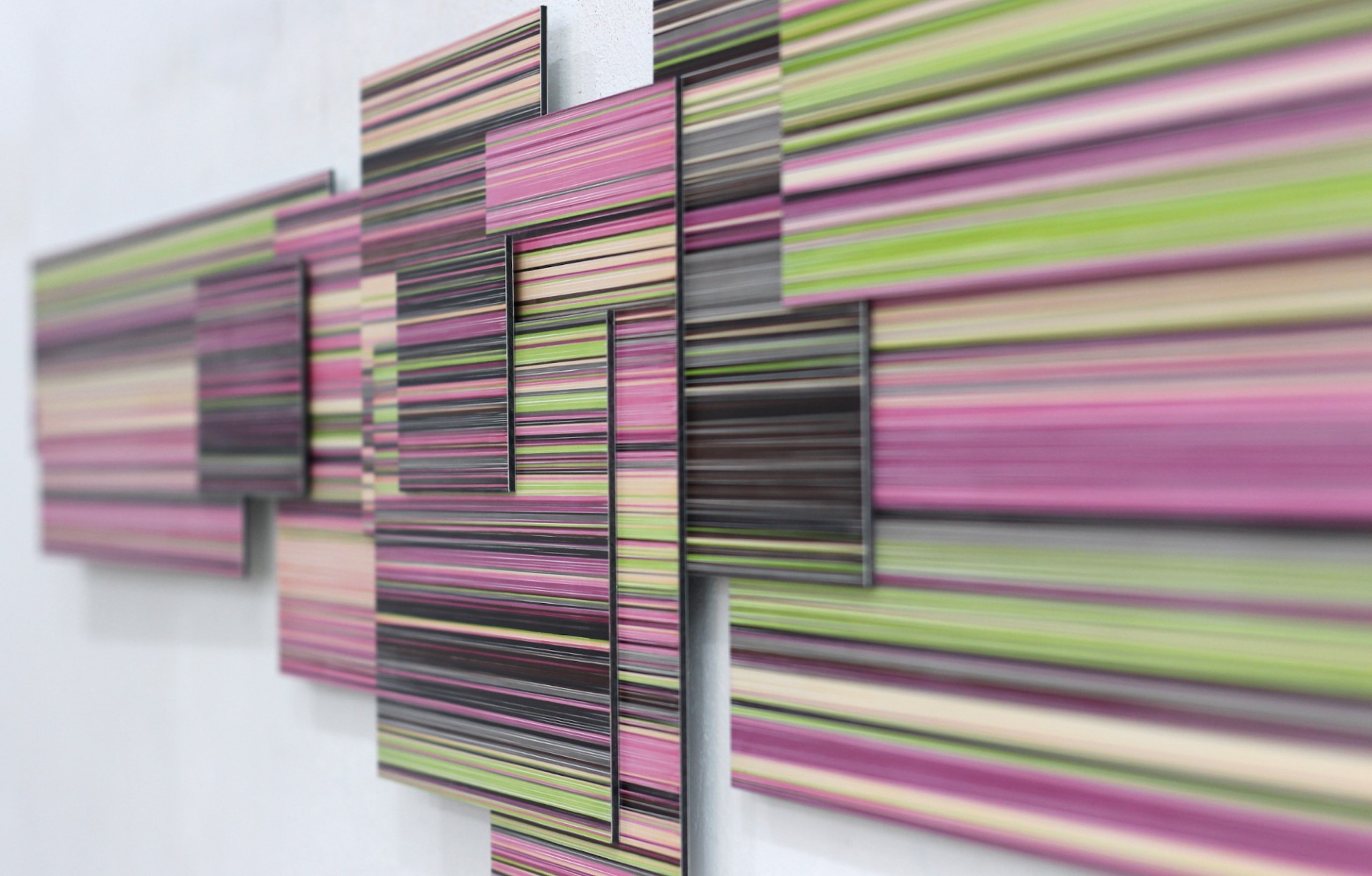 The Layers Series is somewhere between two-dimensional image and three-dimensional object. The artist is querying the idea of illusion in the lines of paint. A palette limited to just seven colours is used but their juxtaposition gives the impression that there are many more. If some works of the series are real objects, for some others the juxtaposition of the colours together with the geometric forms (the layers) created through the lines and colours give the illusion of three-dimensionality.