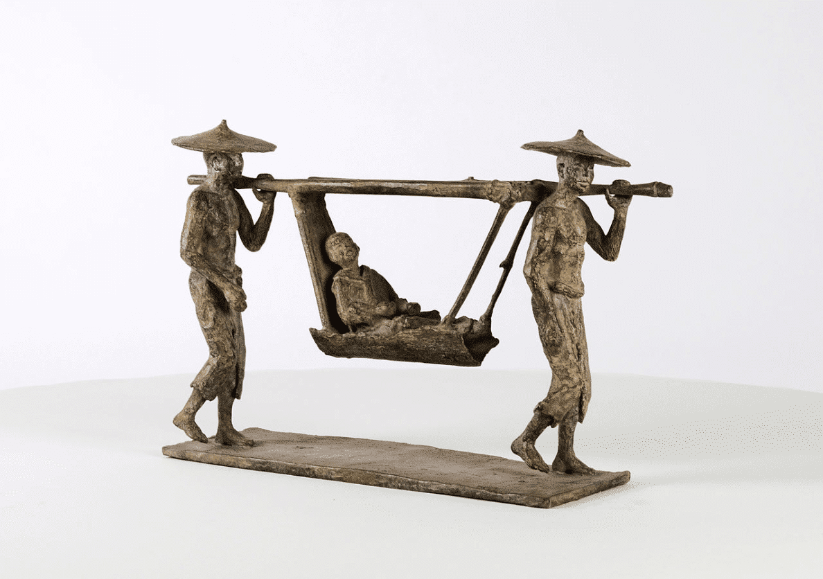 Le Palanquin is an artwork by French contemporary sculptor Marine de Soos. This bronze sculpture is from the “Figure” series. This figurative piece is of a palanquin (in Asia, a chair suspended from poles and carried ) transporting a child, carried by two lean bare-footed men wearing only a pair of trousers and a Chinese hat. Thanks to her extensive travels through the far-east, Marine de Soos sculpts into bronze real-life or imaginary scenes which will whisk you away, sweetly and poetically to far horizons.