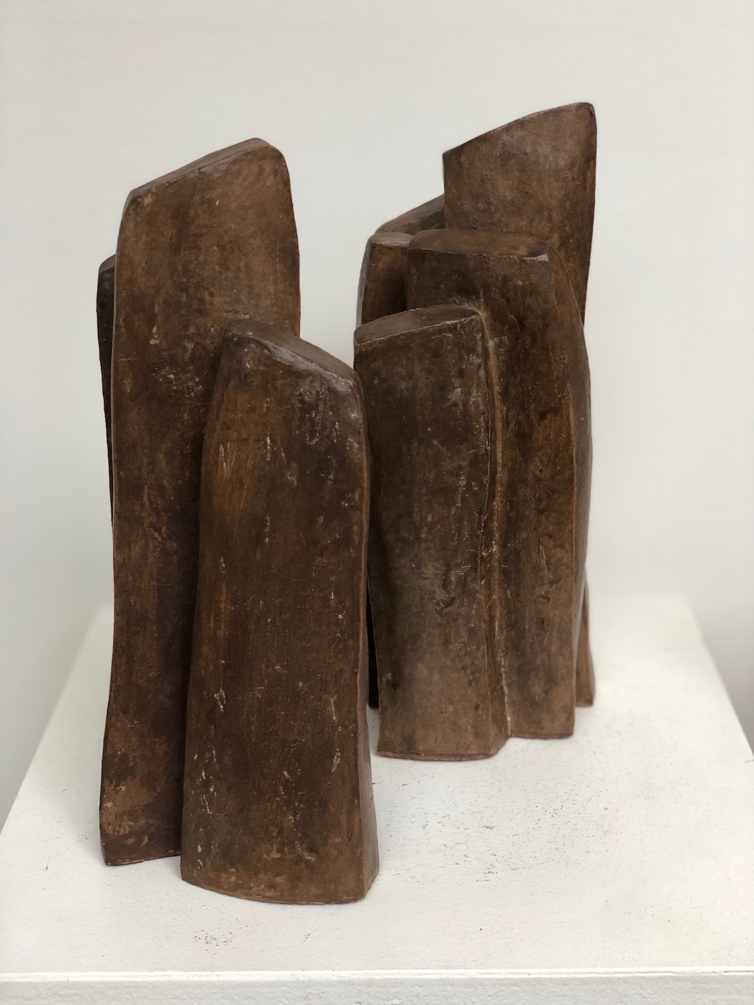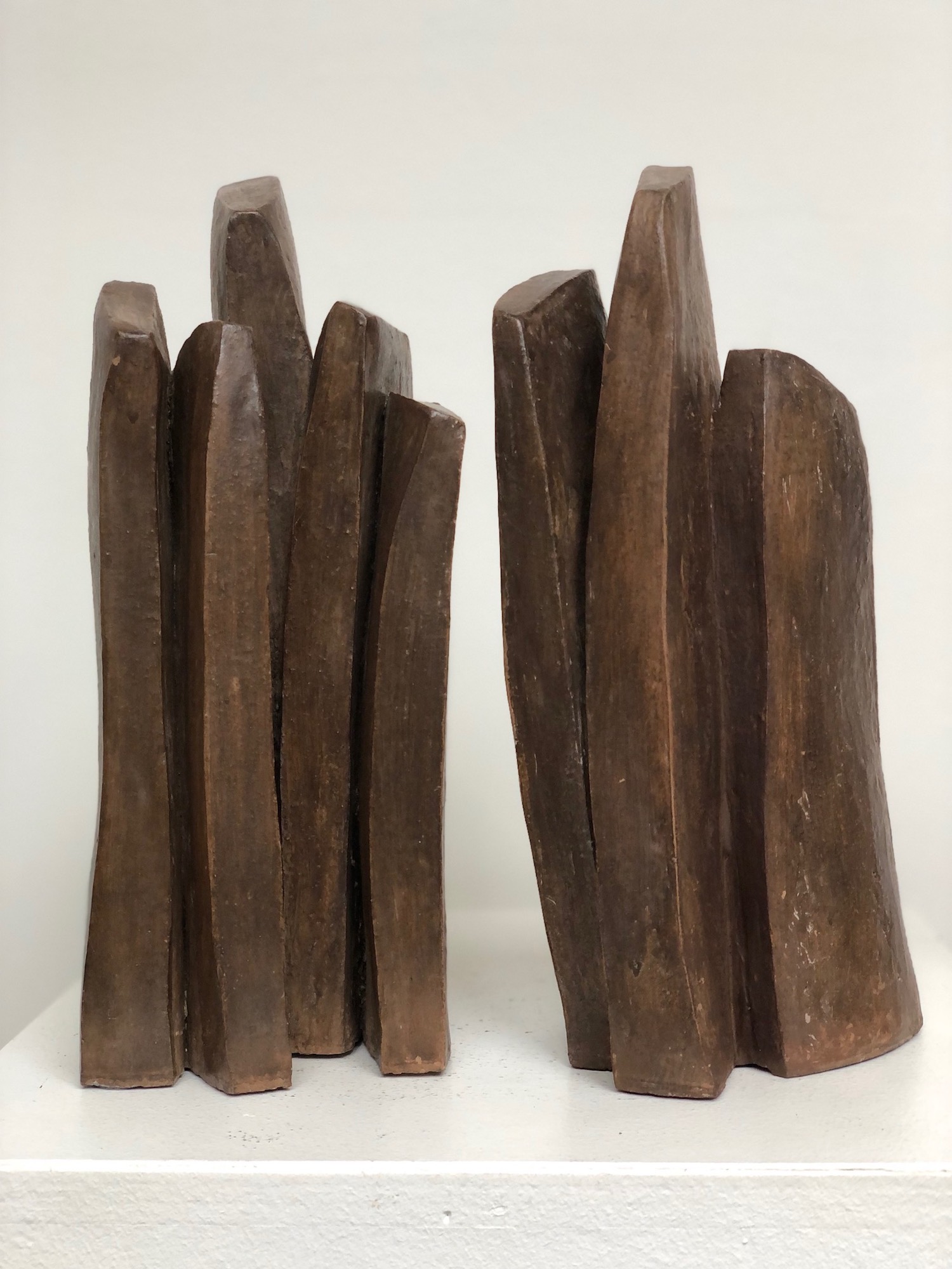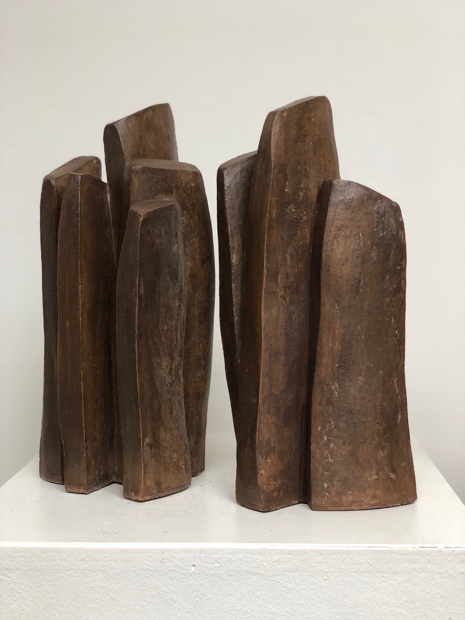 The artist favours expressionist and minimalist shapes. Her study revolves around the verticality and abandons the representation of the human figure that we find in other works of the series. The forms are simple but at the same time retain their slender character and the dialog they have amongst themselves.