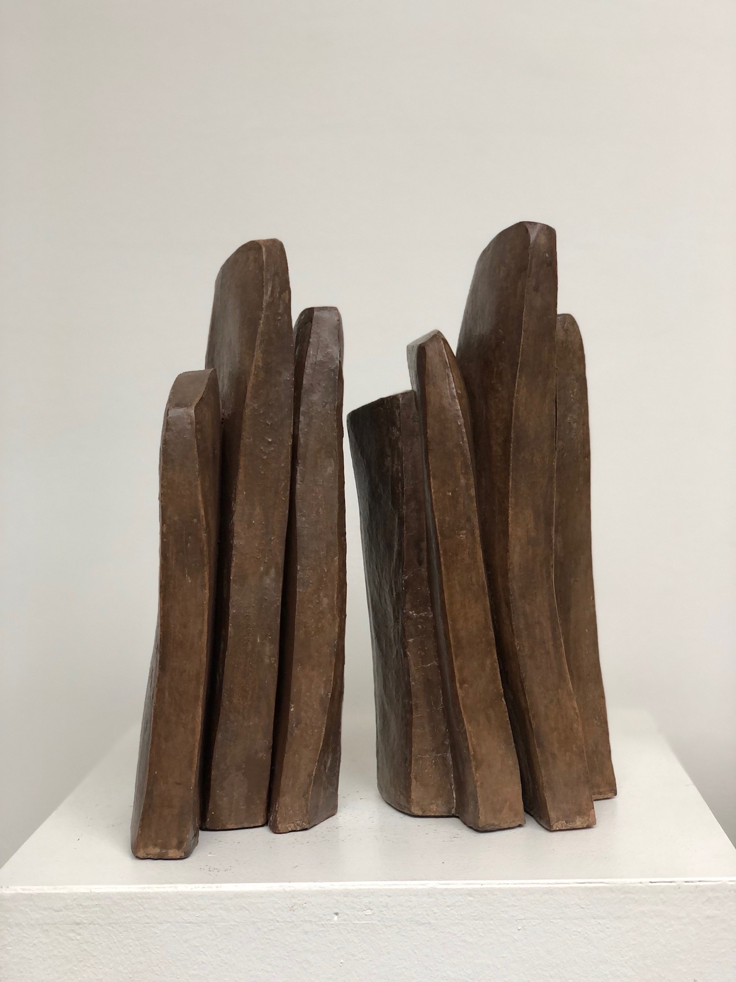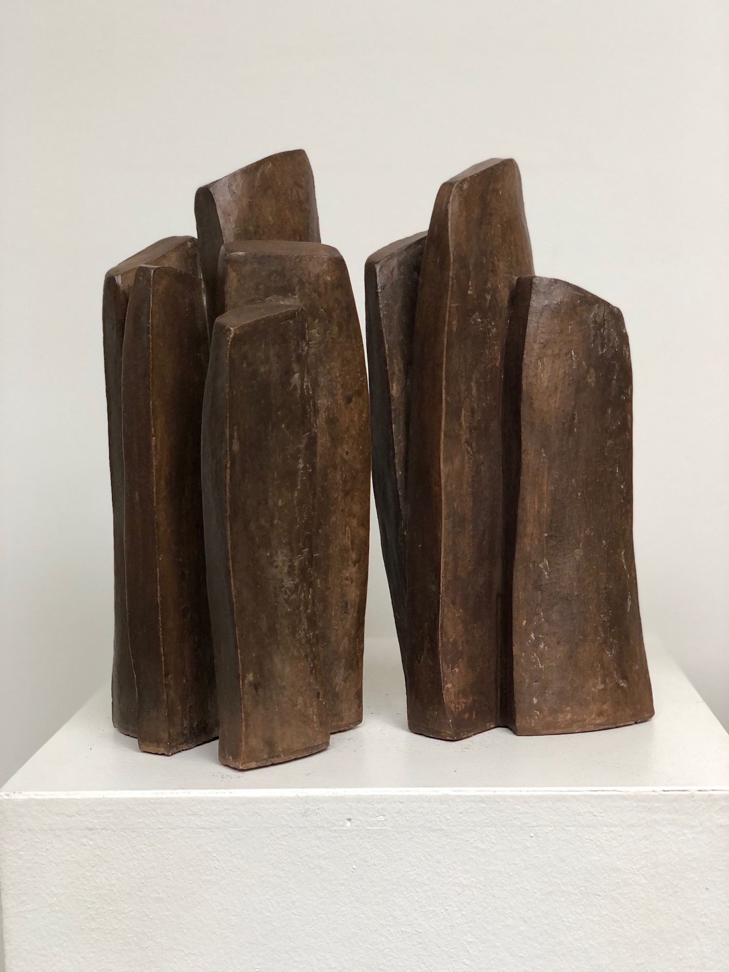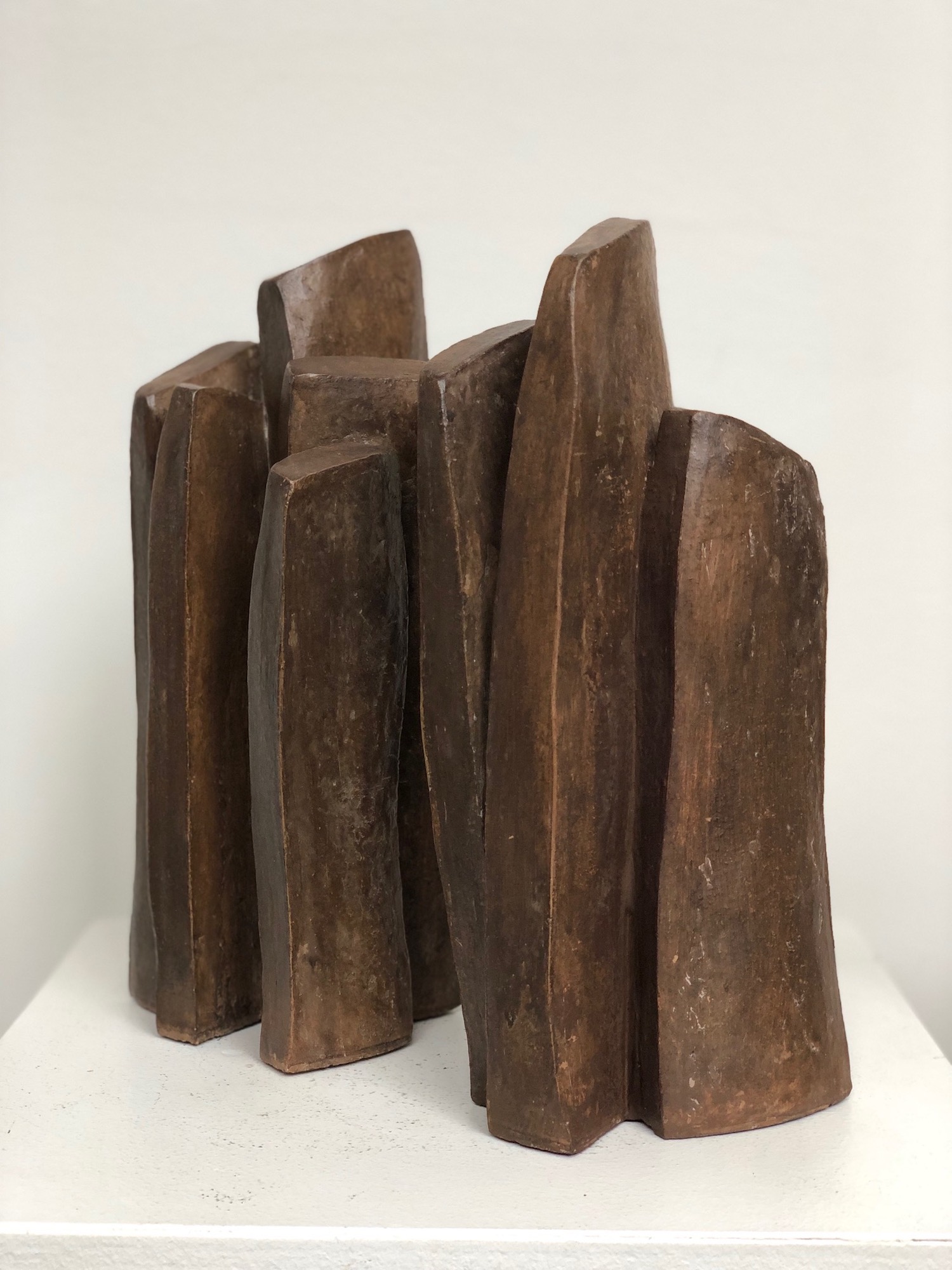 The artist favours expressionist and minimalist shapes. Her study revolves around the verticality and abandons the representation of the human figure that we find in other works of the series. The forms are simple but at the same time retain their slender character and the dialog they have amongst themselves.
