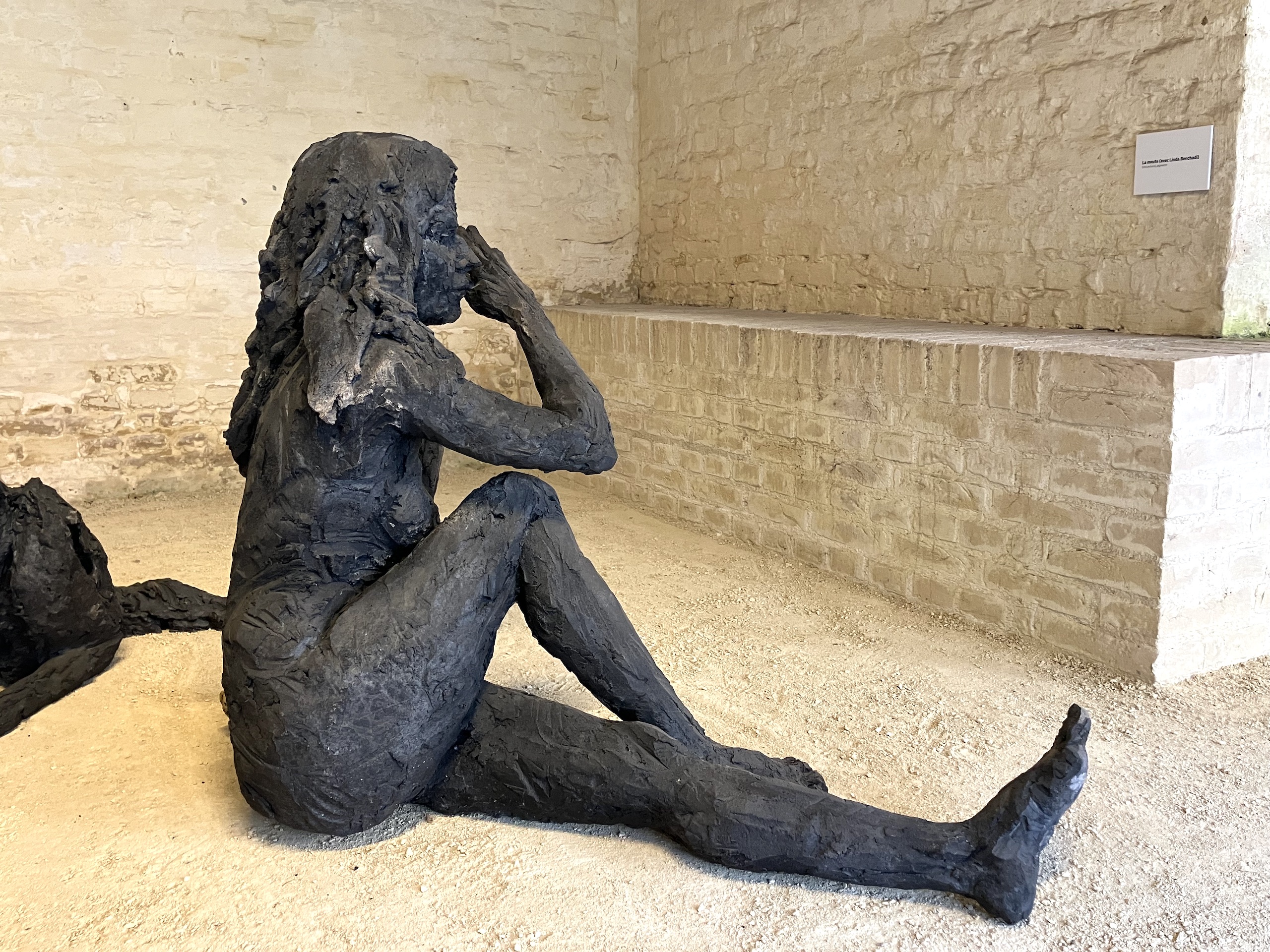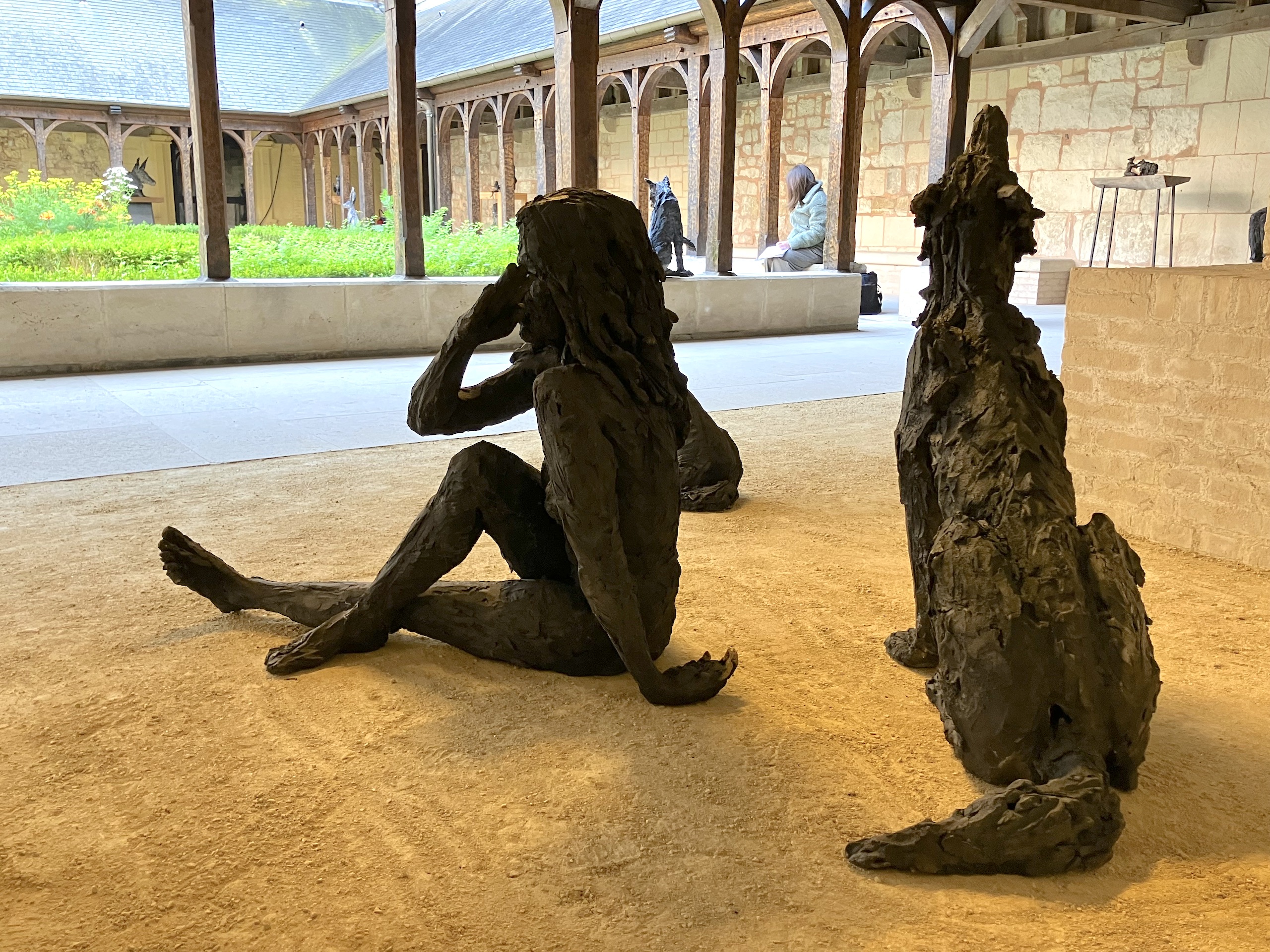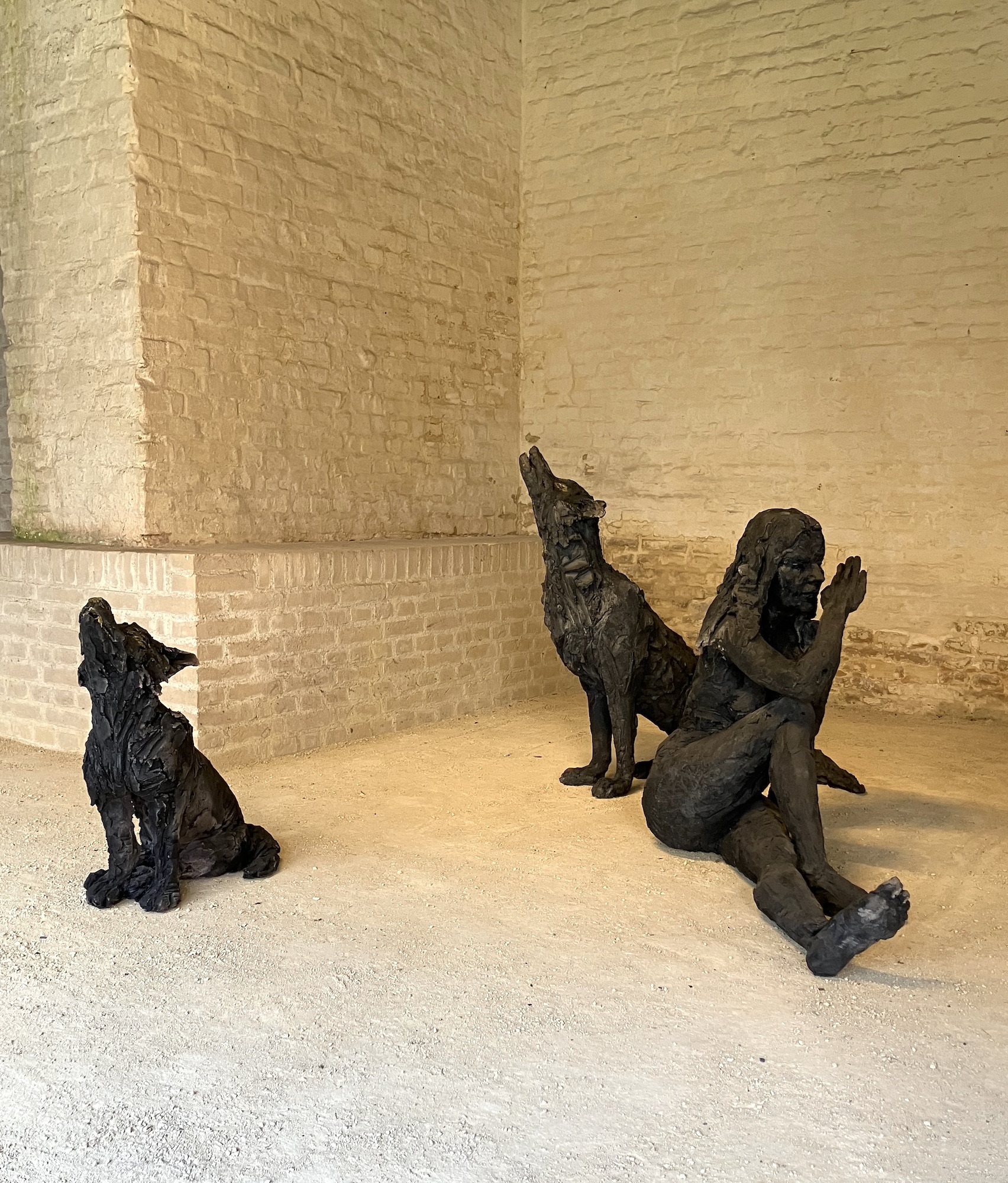 This sculpture has been exhibited at Cécile Raynal’s solo show, À la table des Dames (At the Ladies’ table), at Montivilliers Abbey in Normandy (2025). In this historic site, long home to women, nuns and abbesses, the sculptor has chosen to present works combining portraits of women and animals. Cécile Raynal’s sculptures do not seek to seduce, and can even sometimes appear disturbing. Rough, they bear the marks of a passage through matter, through trial, and yet they stand upright, alive. They conjure up a world in which the animal, feminine, instinctive or rebellious side is embraced as an essential force. In the restored Abbey, the exhibition retraces the last fifteen years of the French artist’s singular career (more information on the exhibition here).