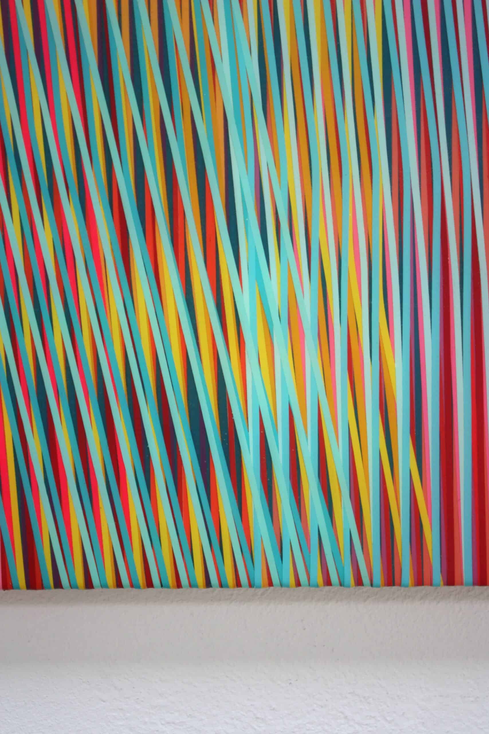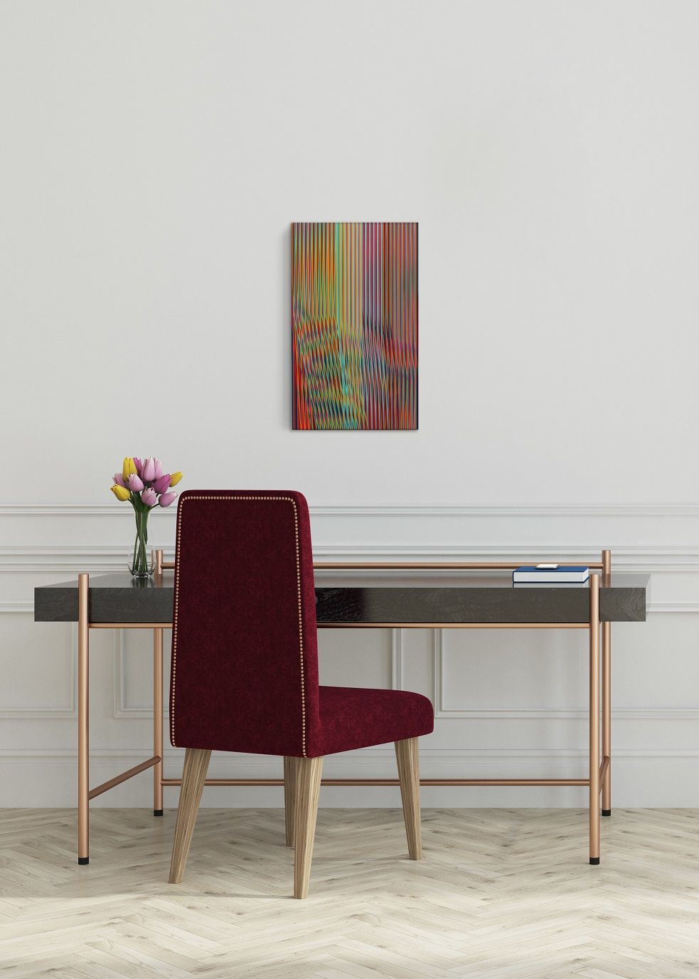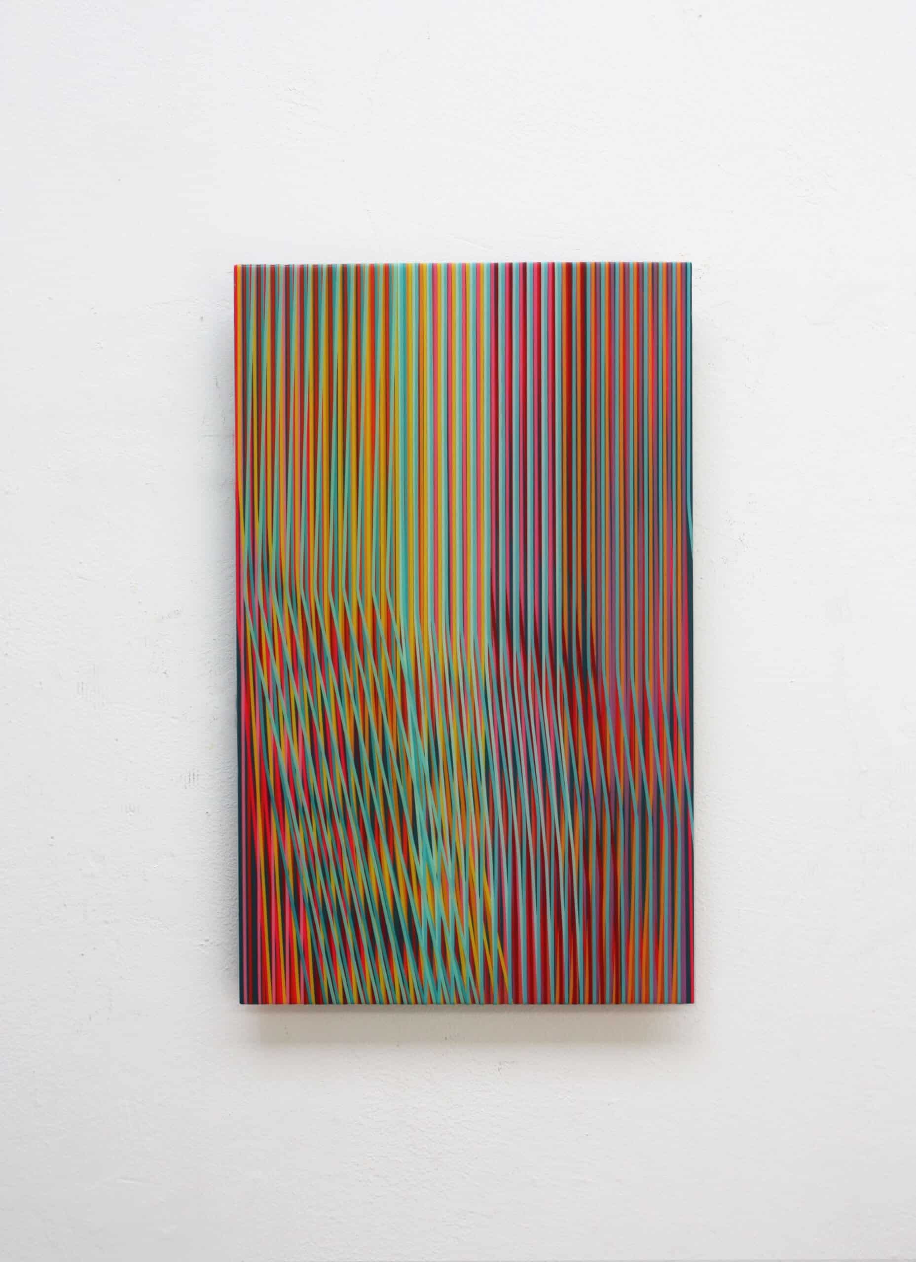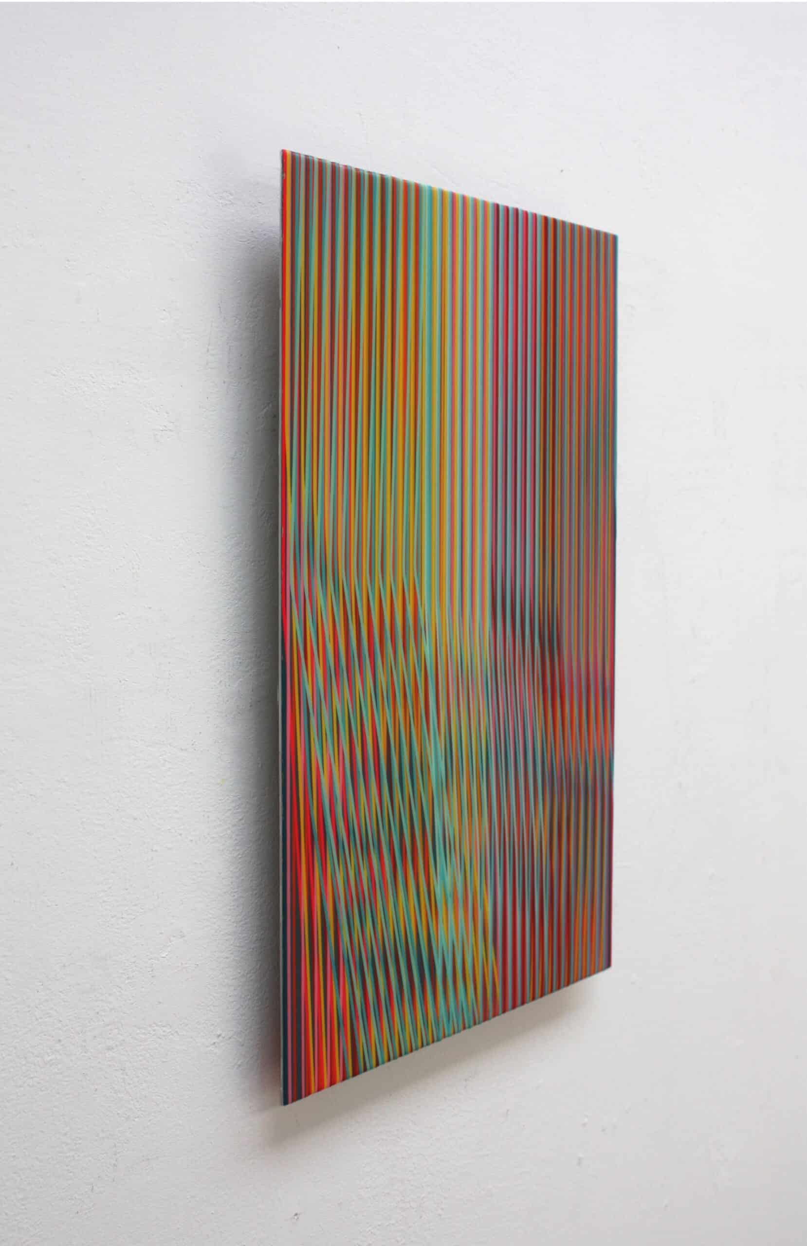 This artwork on aluminum is an abstract painting. Worthy of an optical illusion, this painting challenges the observer’s vision: the bright colorful vertical lines interweave and superimpose in a downward directed movement, splitting the painting into two parts. In the upper part, the colors alternate in a regular way, then the lines split, as if they were under the impetus of several movements. Many paradoxical impressions emerge from this pictorial oeuvre which changes depending on the viewer’s point of view – confusing or rigorous, with a smooth or textured surface.