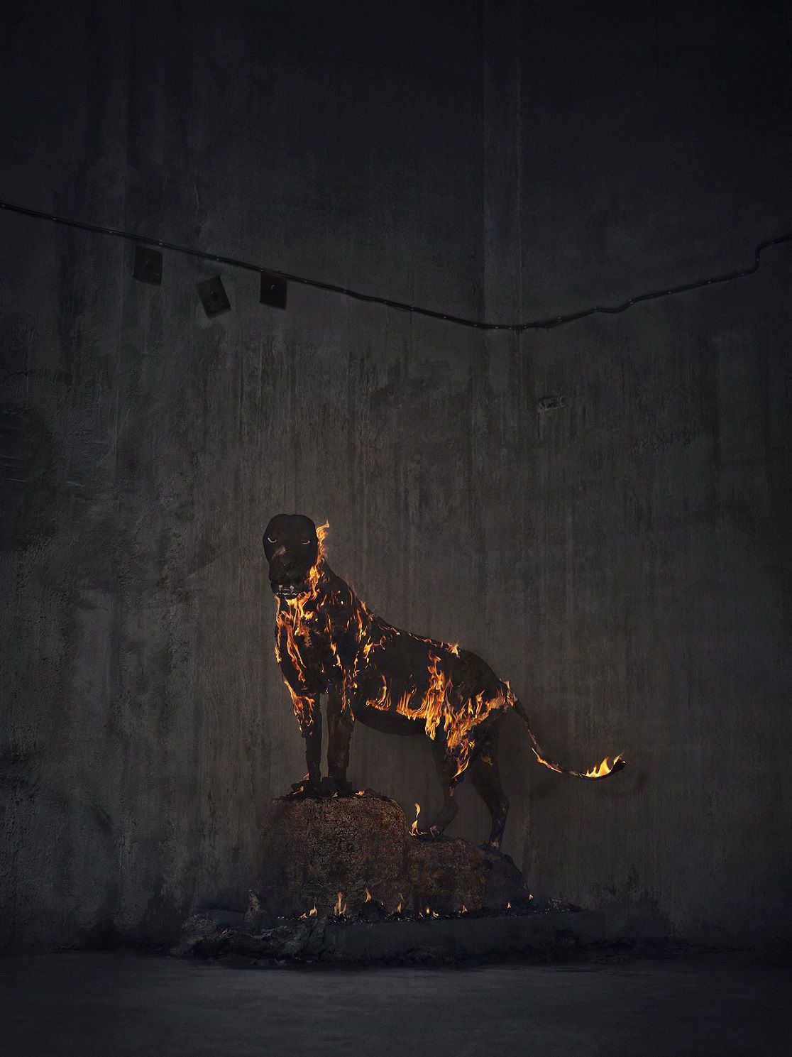 These photographs are areas of cultural and mythological reference through which Christian Houge creates. Immortalising the destructive fire, he celebrates the animal’s release from the condemned to a state of permanent and eternal degradation. This scene, disturbing as it is frightening, represents a passive triumph for the animals who gradually die out on a backdrop of a luxurious nature reproduced by Victorian tapestries. The latter were chosen by the photographer to embody the human century-old imperialism over nature and their fellow man.