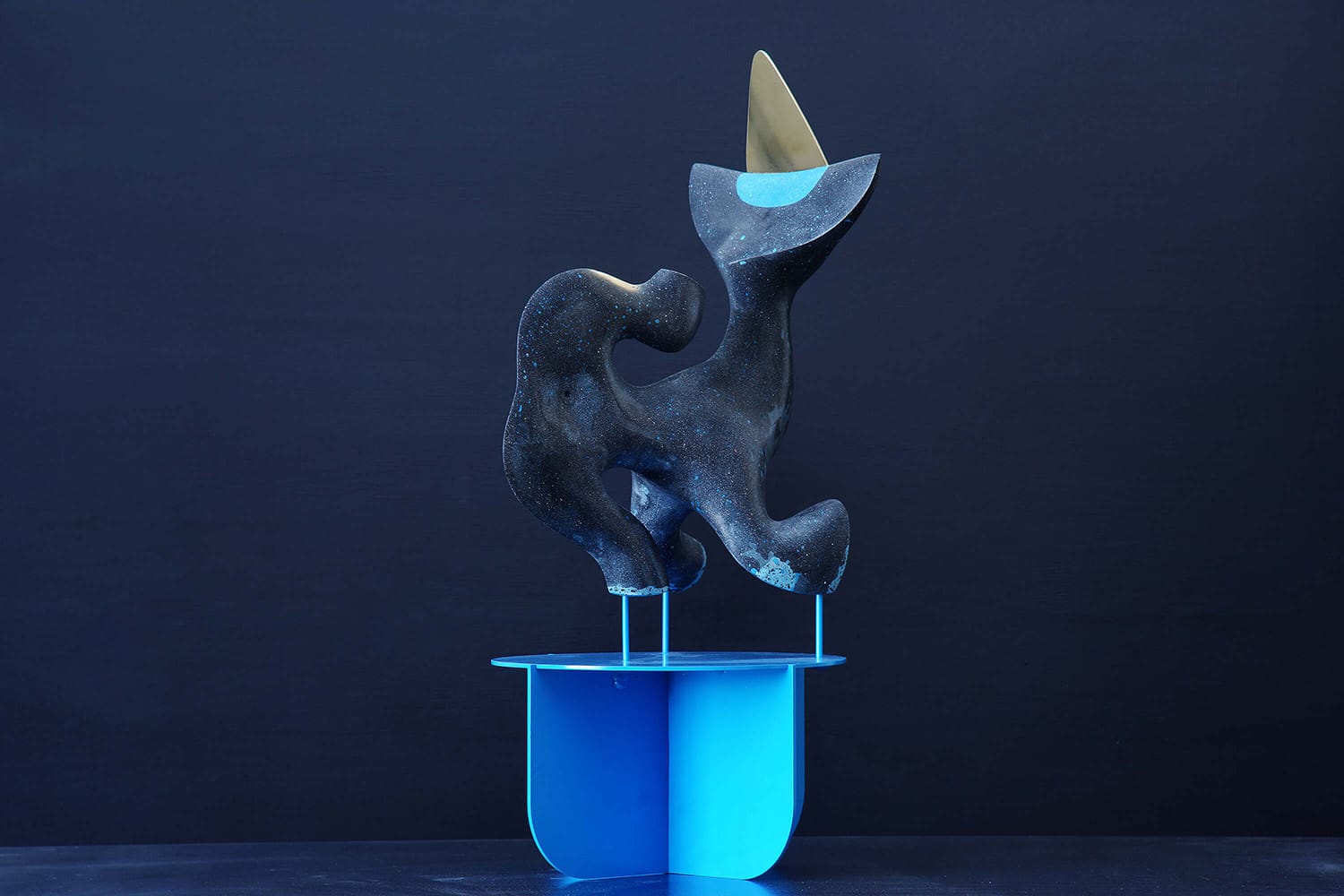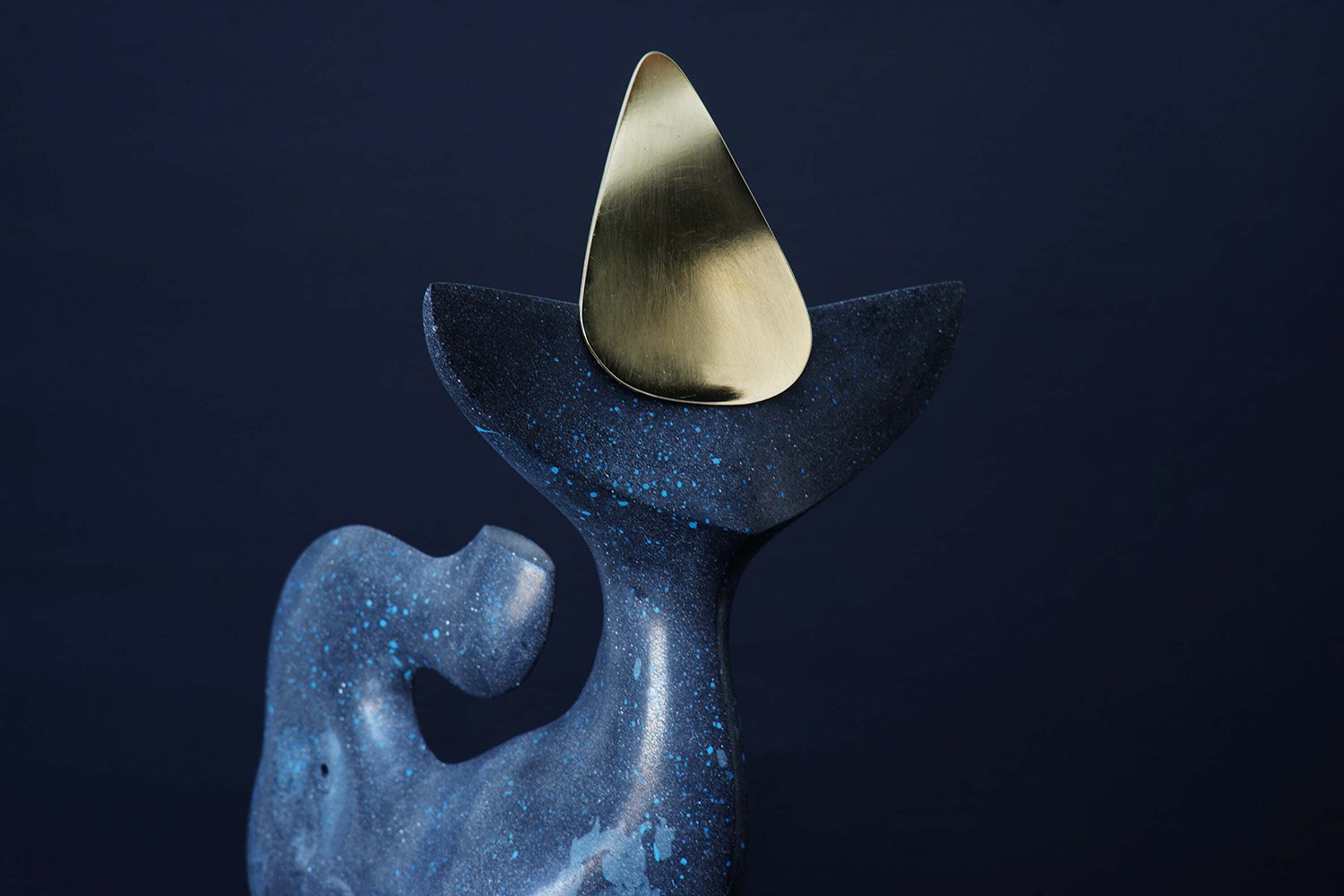 This sculpture has been created with coloured and polished artificial stone combined with brass and iron.