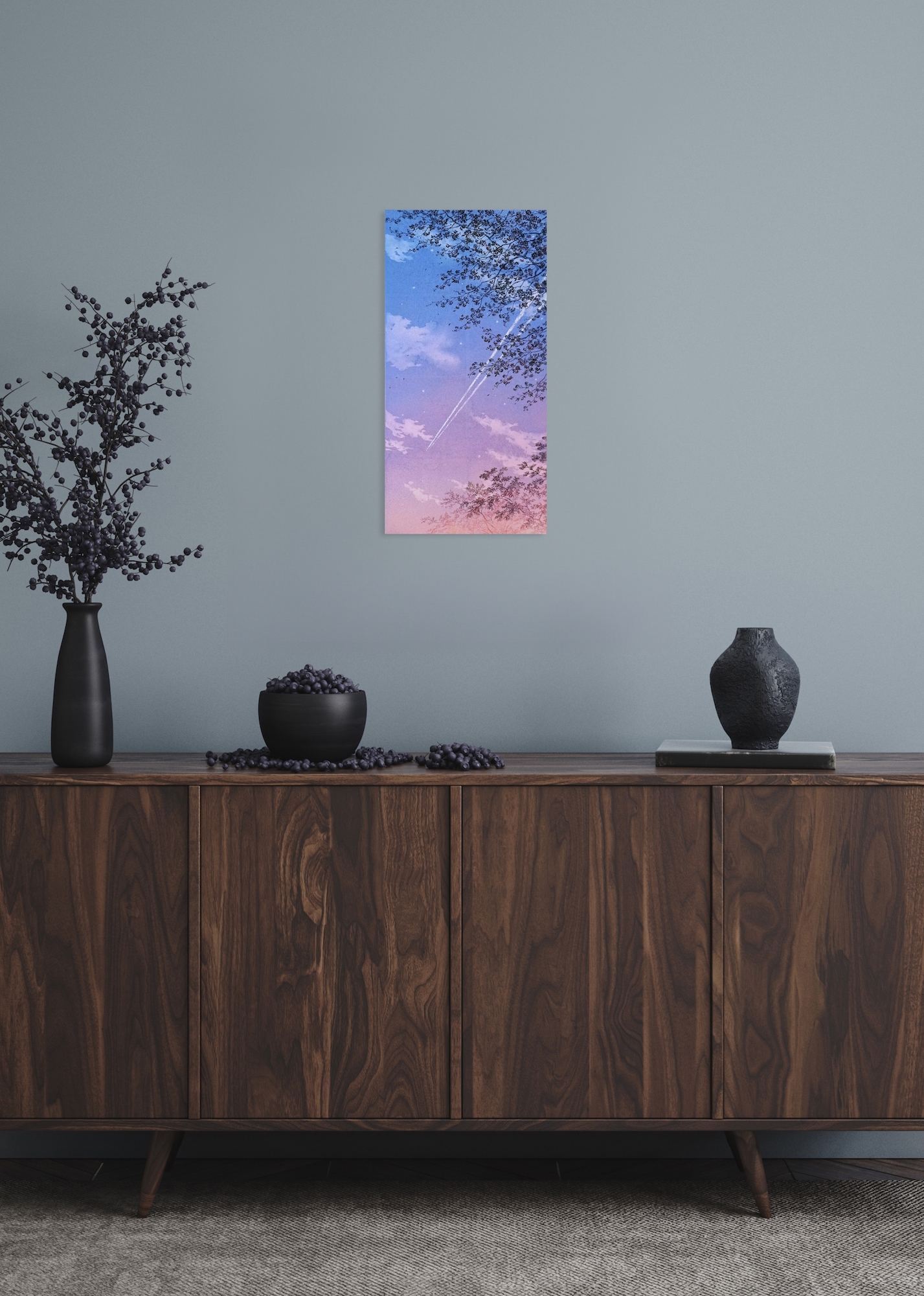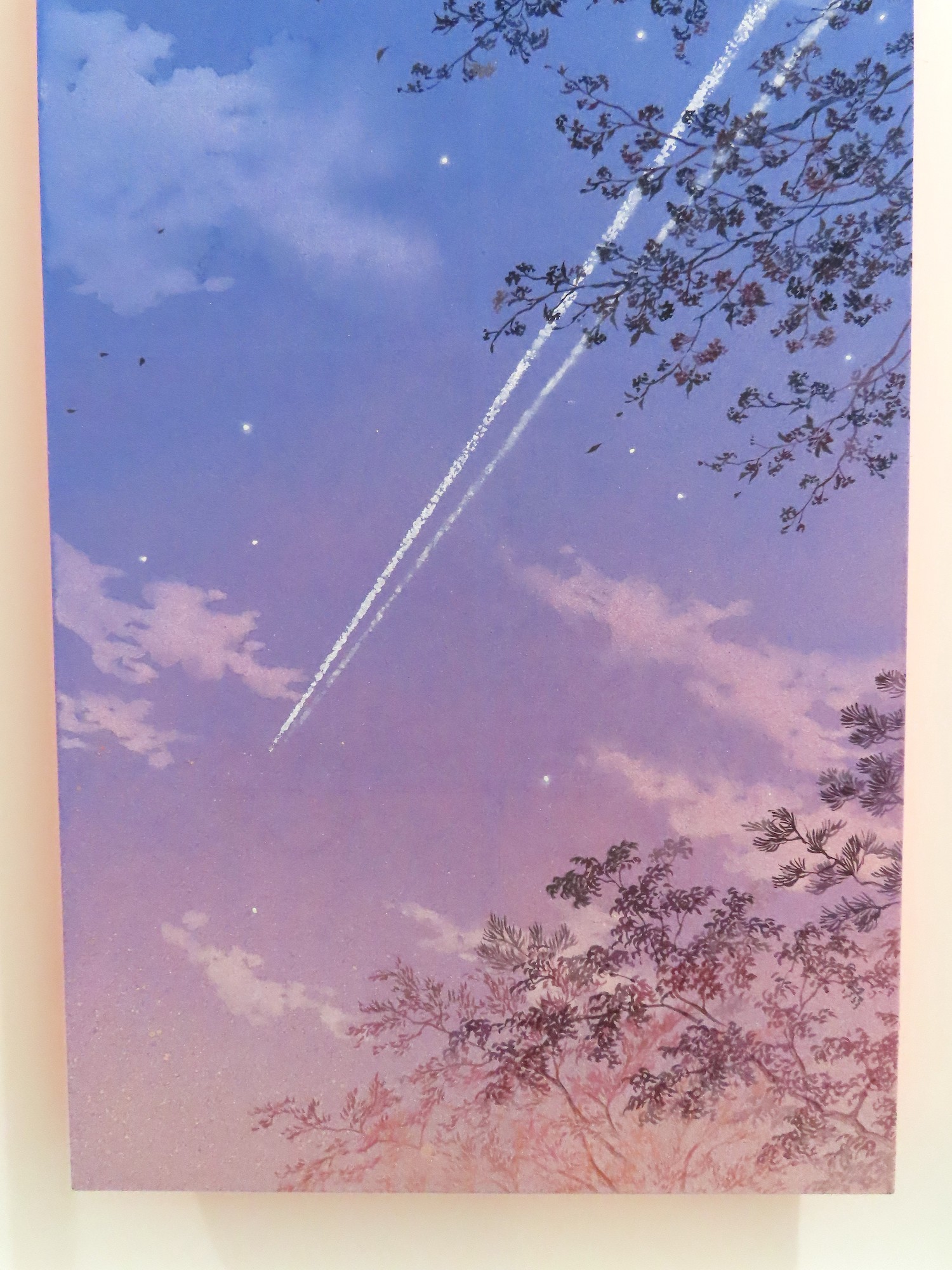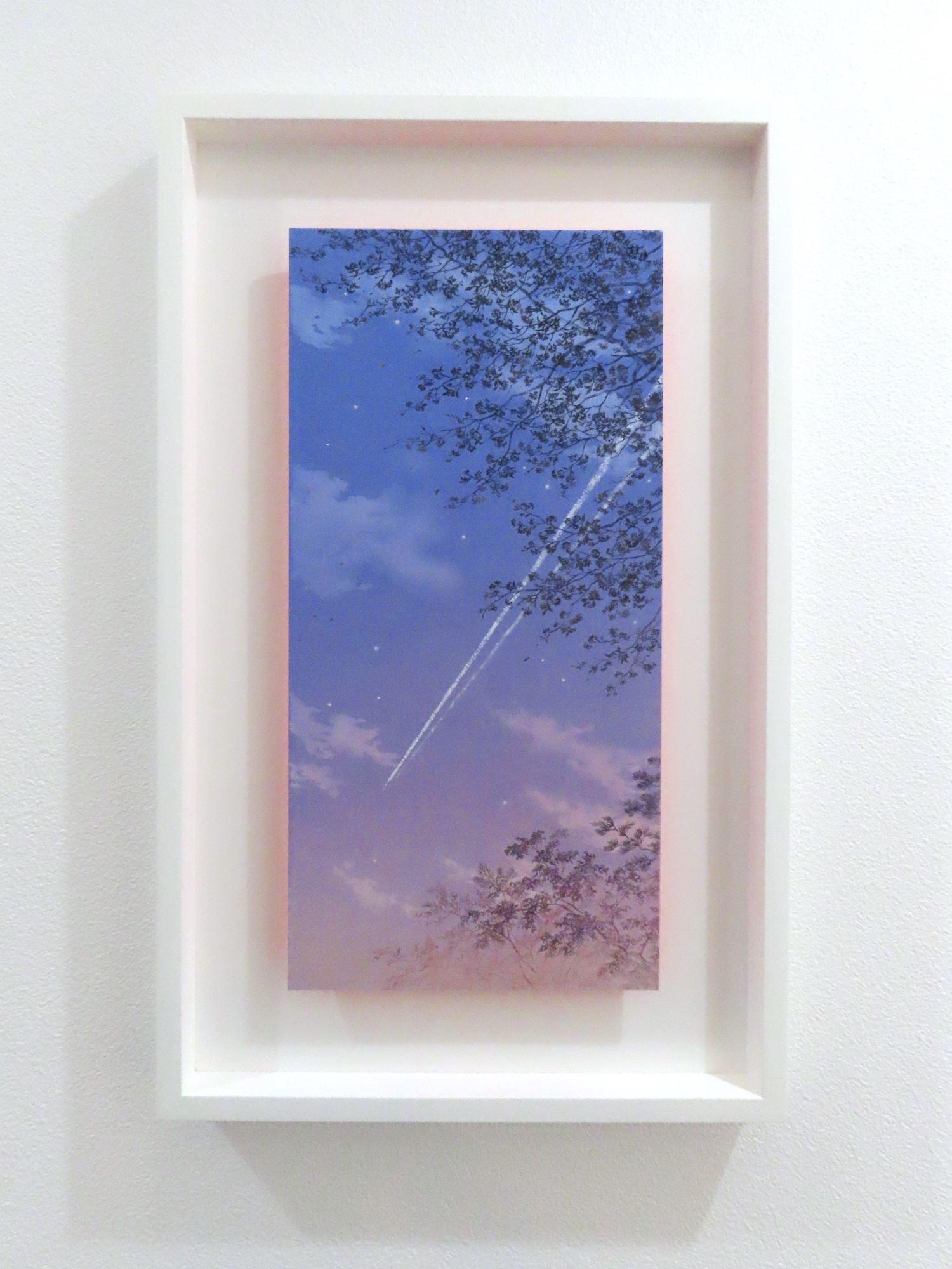 Longing instant at dusk #15 is a painting by Japanese artist Shoko Okumura from the series Ephemeral Moments. This painting depicts a twilight sky blending soft pinks and purples into deep blue, framed by delicate tree branches. Two bright trails cut diagonally across the clouds, while small stars shimmer faintly in the calm evening light.