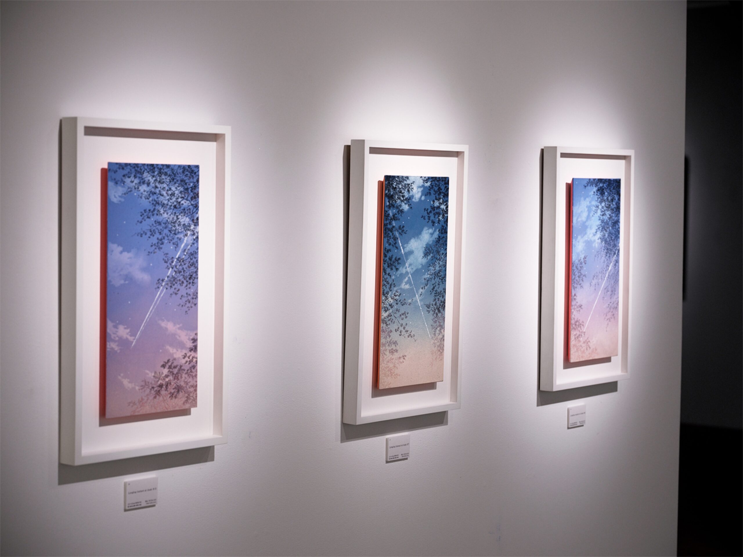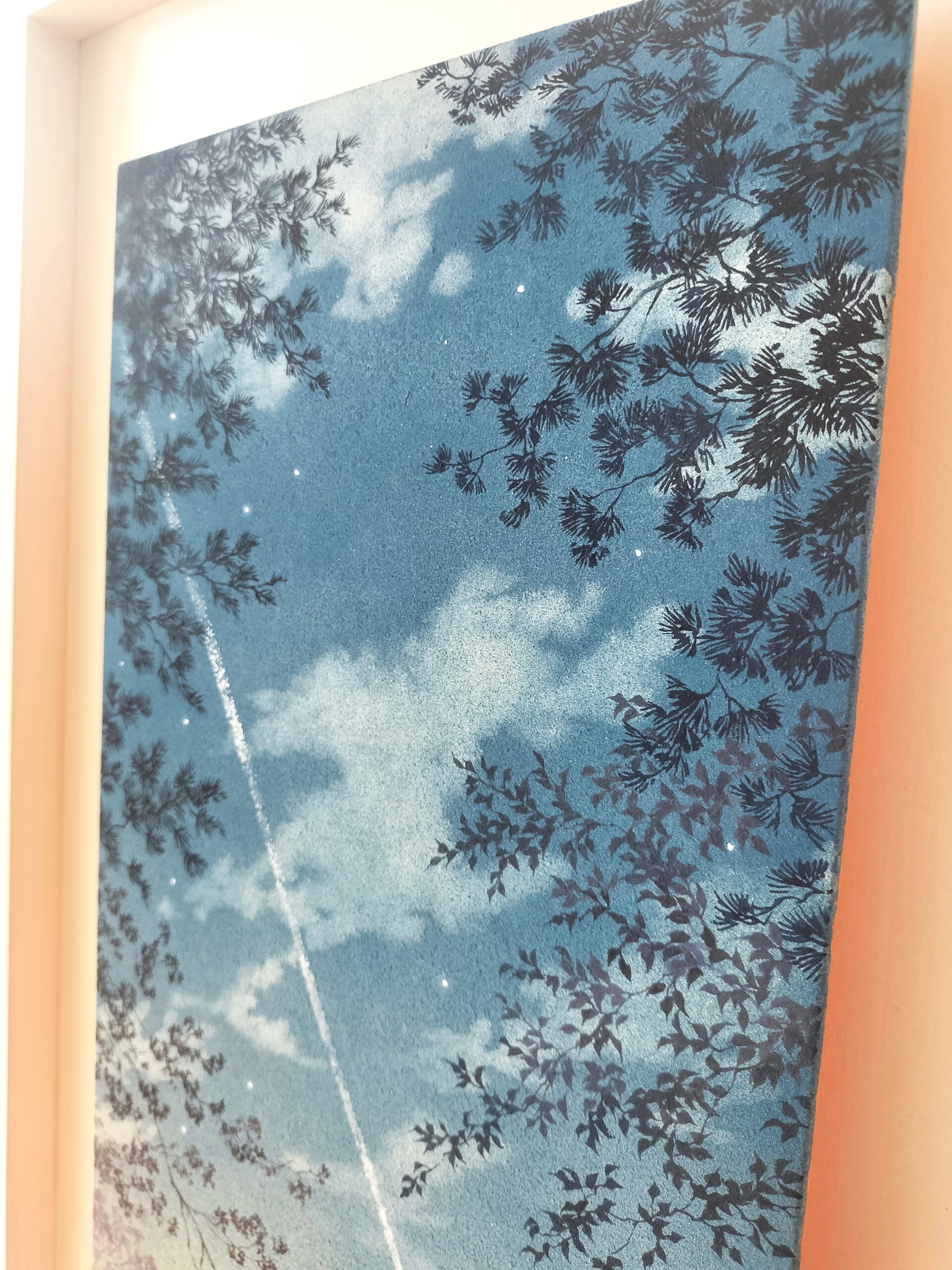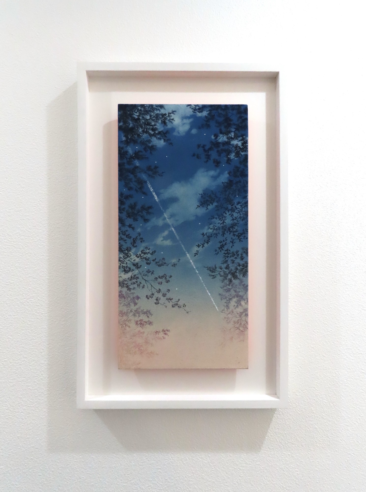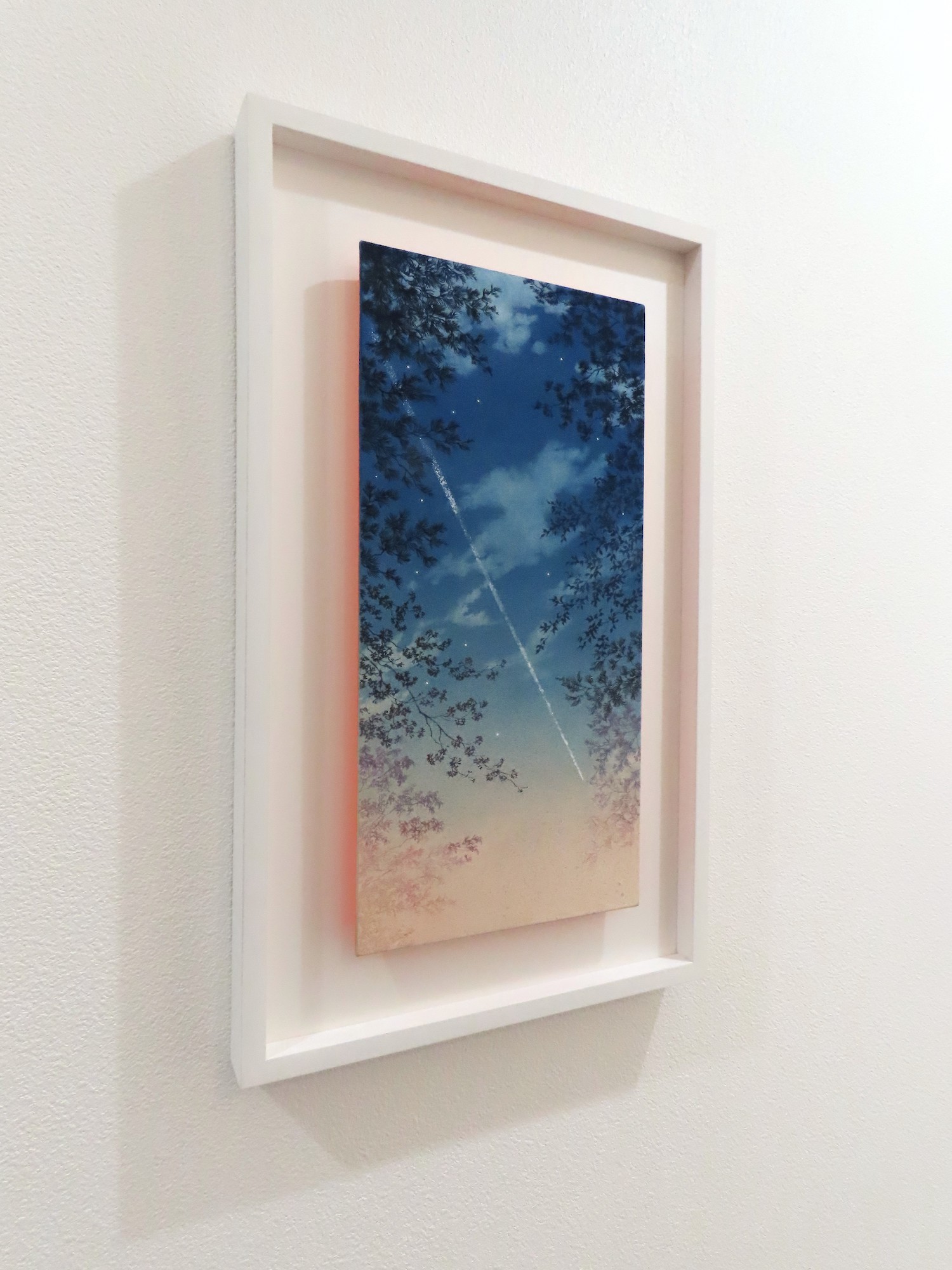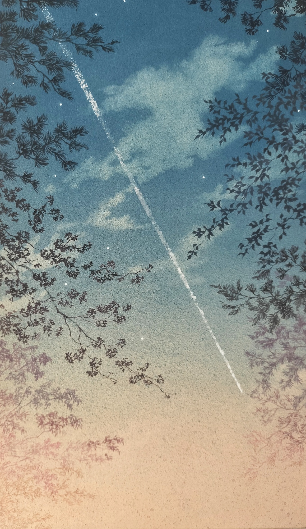 Longing instant at dusk #7 is a painting by Japanese artist Shoko Okumura from the series Ephemeral Moments. This painting shows a tranquil sky transitioning from warm tones at the horizon to deep blue above, framed by delicate tree branches. A long, bright trail cuts across the clouds, while small stars shimmer faintly in the evening light.