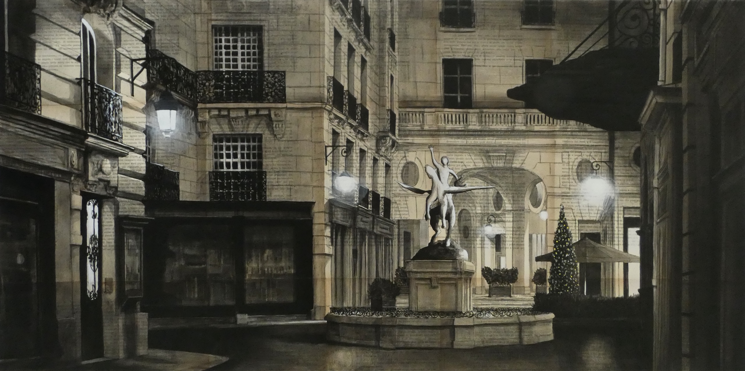 The surrounding buildings are grand and traditional, featuring dark wrought-iron balconies and gridded windows. Their facades are rendered in the artist’s signature neutral, muted tones—creams, beiges, and soft yellows—which glow warmly against the dark environment.